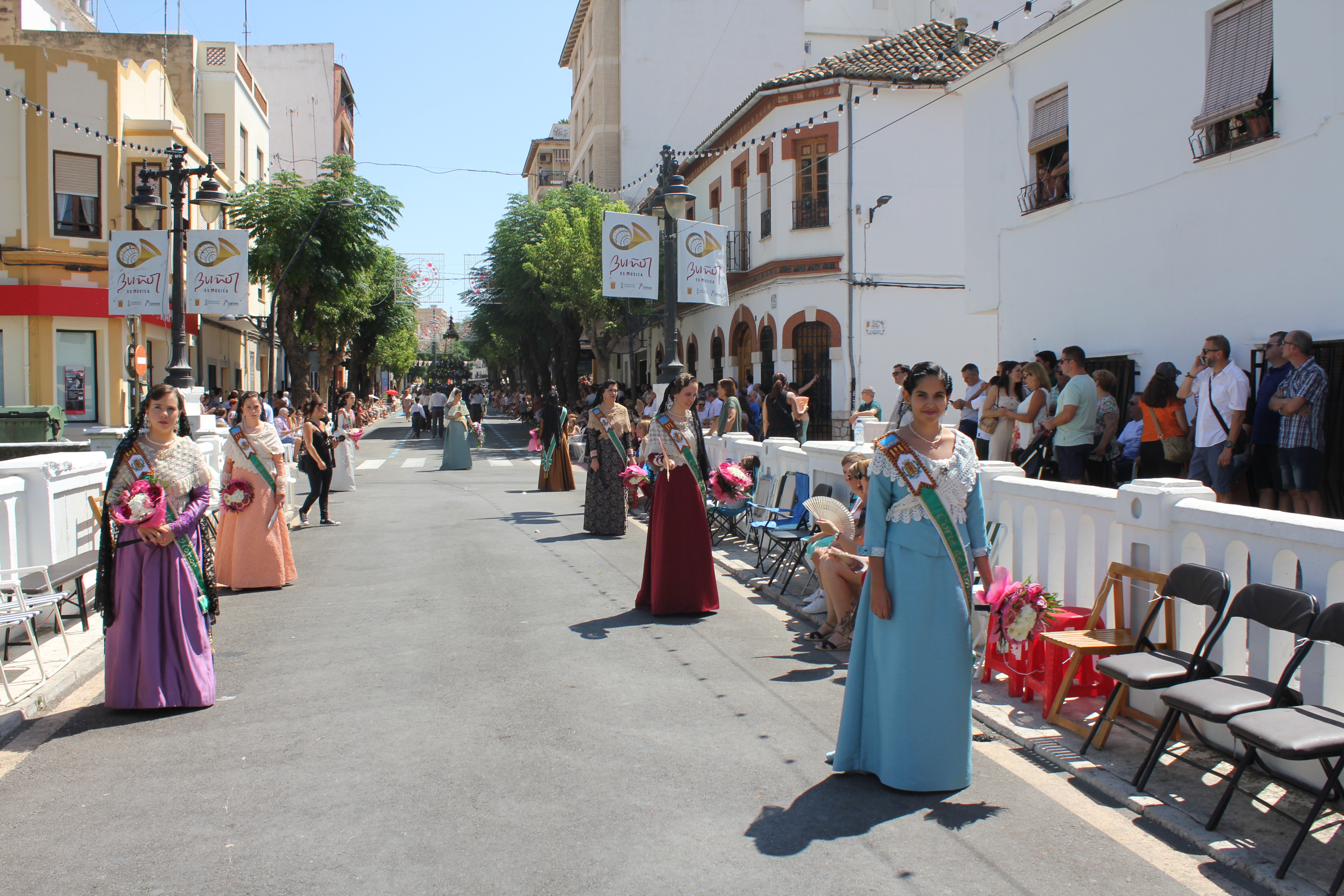 Las últimas andas iban acompañando a las protagonistas del día a las Misses y Representante, Esther Furriol Ochea, Gema Clemente Agustina y Paula Ramón Martínez. Las tres entraron a la Plaza del Pueblo emocionadas ante el aplauso del público y de los simpatizantes «lietreros» que se agolparon a uno y otro lado de su local social. También los vítores fueron en aumento cada vez que cada cuadrilla de «anderos» daba las tradicionales vueltas a los monumentos florales que salieron en la Ofrenda.