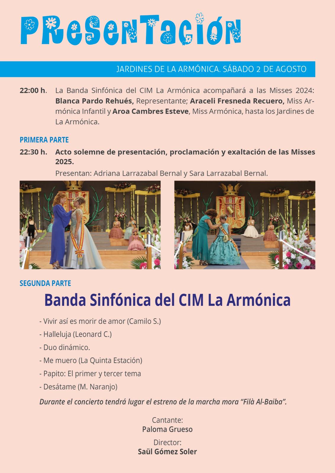 La jornada comenzará a las 22:00 horas con el acompañamiento musical de la Banda Sinfónica del CIM La Armónica, que conducirá hasta el recinto a las Misses salientes: Blanca Pardo Rehués (representante), Araceli Fresneda Recuerdo (Miss Armónica Infantil) y Aroa Cambres Esteve (Miss Armónica).