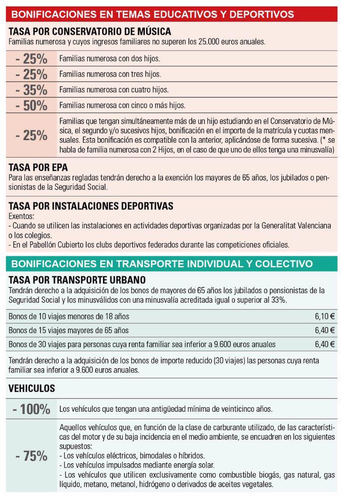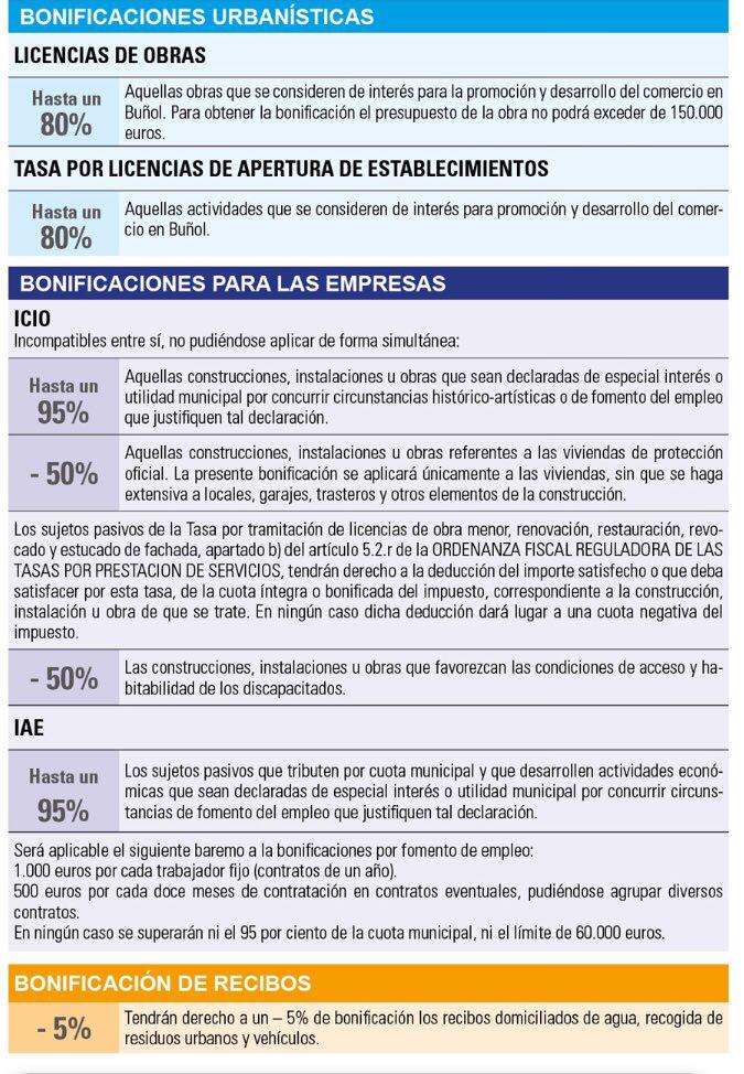 El Ayuntamiento de Buñol, a través de la Concejalía de Hacienda y Contratación, ha informado a todos los vecinos del buen número de bonificaciones que pueden solicitarse en diversos ámbitos: vivienda, educación y deporte, transporte individual y colectivo, urbanística y empresa. De forma rápida, ágil y sencilla, todos los buñolenses cuentan con un tríptico explicativo muy detallado.
