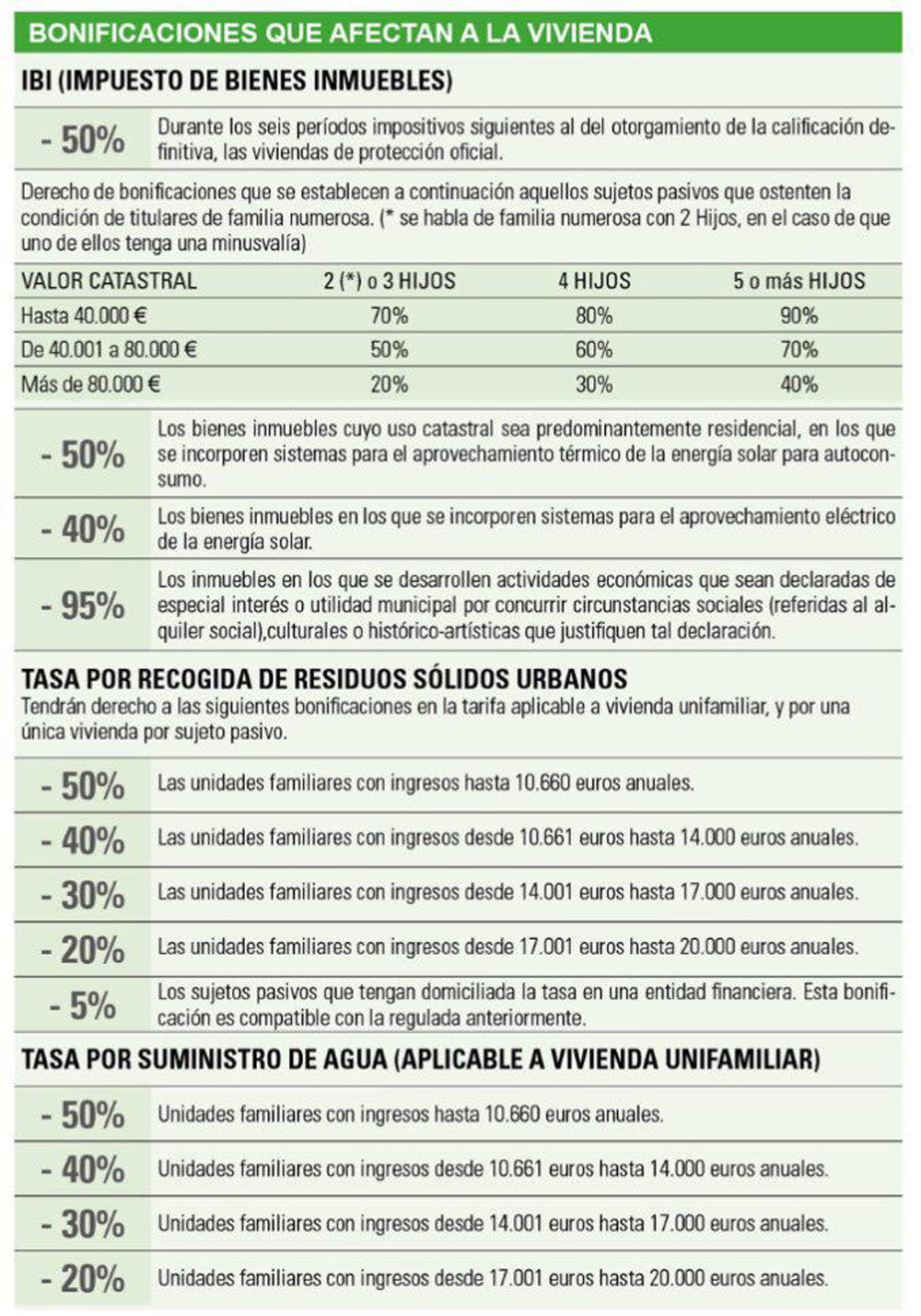Con respecto al Impuesto de Bienes Inmuebles se aplicará una reducción del 50% en las viviendas de protección oficial. También para las familias numerosas, desde 2 hijos en el caso de que uno de ellos tenga una minusvalía. También reducción del 50% en viviendas en las que se incorporen sistemas para el aprovechamiento térmico de la energía solar para autoconsumo; del 40% para el aprovechamiento eléctrico de la energía solar y del 95% en viviendas destinadas a alquiler social, cultural o histórico-artístico.