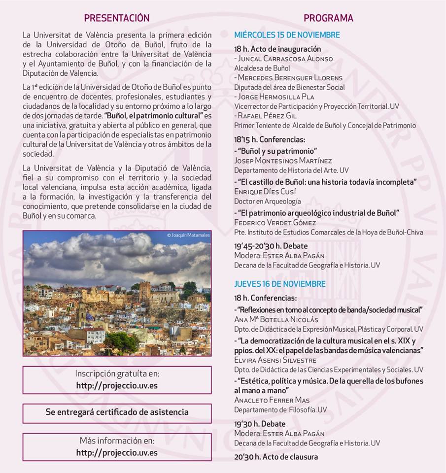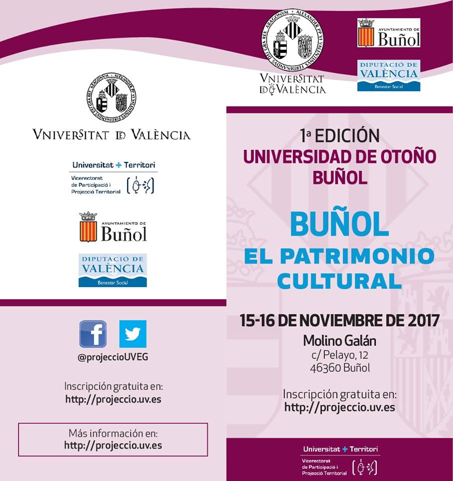 La 1ª edición de la Universidad de Otoño de Buñol es punto de encuentro de docentes, profesionales, estudiantes y ciudadanos de la localidad y su entorno próximo a lo largo de dos jornadas de tarde. “Buñol, el patrimonio cultural” es una iniciativa, gratuita y abierta al público en general, que cuenta con la participación de especialistas en patrimonio cultural de la Universitat de València y otros ámbitos de la sociedad. Estas jornadas se enmarcan dentro del proceso que pretende impulsar el Ayuntamiento de Buñol para que la fiesta de la Tomatina presente candidatura futura a Patrimonio de la Humanidad por parte de la UNESCO.