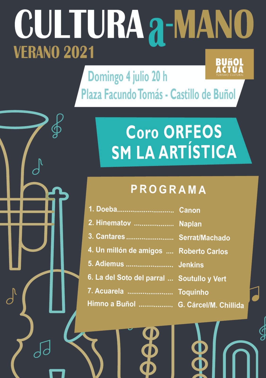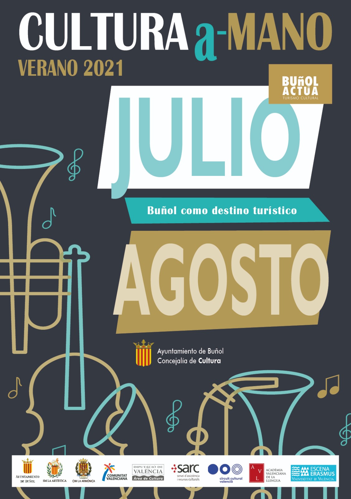 Redacción.- El Ayuntamiento de Buñol lanza la marca: BUÑOL ACTÚA – Turismo Cultural. Este verano Buñol como destino turístico ofrece un amplio programa cultural todos los fines de semana de julio y agosto. Organiza las Concejalías de Cultura y Turismo, la Diputación de Valencia, el SARC, el Circuit Cultural Valencià, la Acadèmia Valenciana de la Llengua y Escena Erasmus de la Universitat de València. En estos actos participan las dos sociedades musicales del municipio: la Sociedad Musical La Artística y el Centro Instructivo Musical La Armónica.