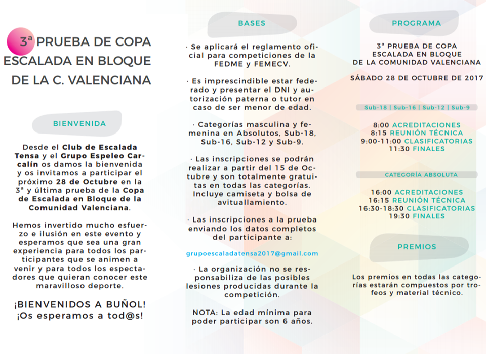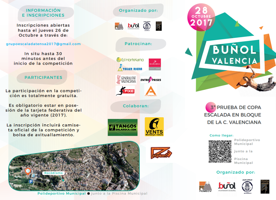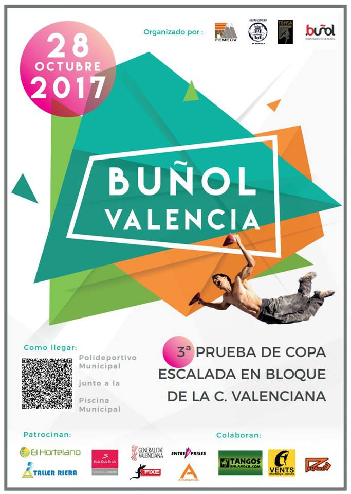 El primero de ellos es el próximo sábado 28 de octubre con la Copa Escalada en Bloque de la Comunitat Valenciana. Es la tercera prueba de la Copa Escalada en Bloque de nuestra autonomía. El evento se desarrollará en las instalaciones de la Piscina Municipal. Este evento deportivo está organizado por el Grupo Espeleo Carcalín, por el Ayuntamiento de Buñol, el Grupo Tensa y la Federació d’Esports de Muntanya i Escalada de la Comunitat Valenciana.