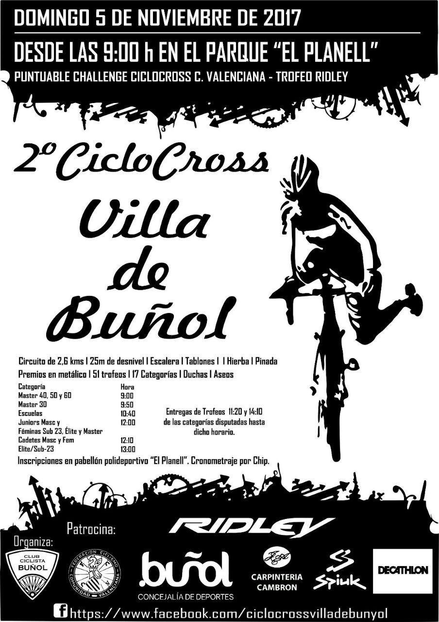 Será una prueba puntuable challenge ciclocross Comunitat Valenciana, Trofeo Ridley. El circuito tiene una distancia de 2,6 kilómetros, con 25 metros de desnivel, en el que los participantes tendrán que sortear escaleras, tablones, hierba y pinada. Se entregarán 51 trofeos en 17 categorías. Arrancará a las 9h en el Parque El Planell de la localidad. David Ramírez, presidente del Club Ciclista Buñol, ha confirmado que el número de participantes rondará los 150 en todas las categorías. Una dura prueba apasionante para los amantes del ciclocross.