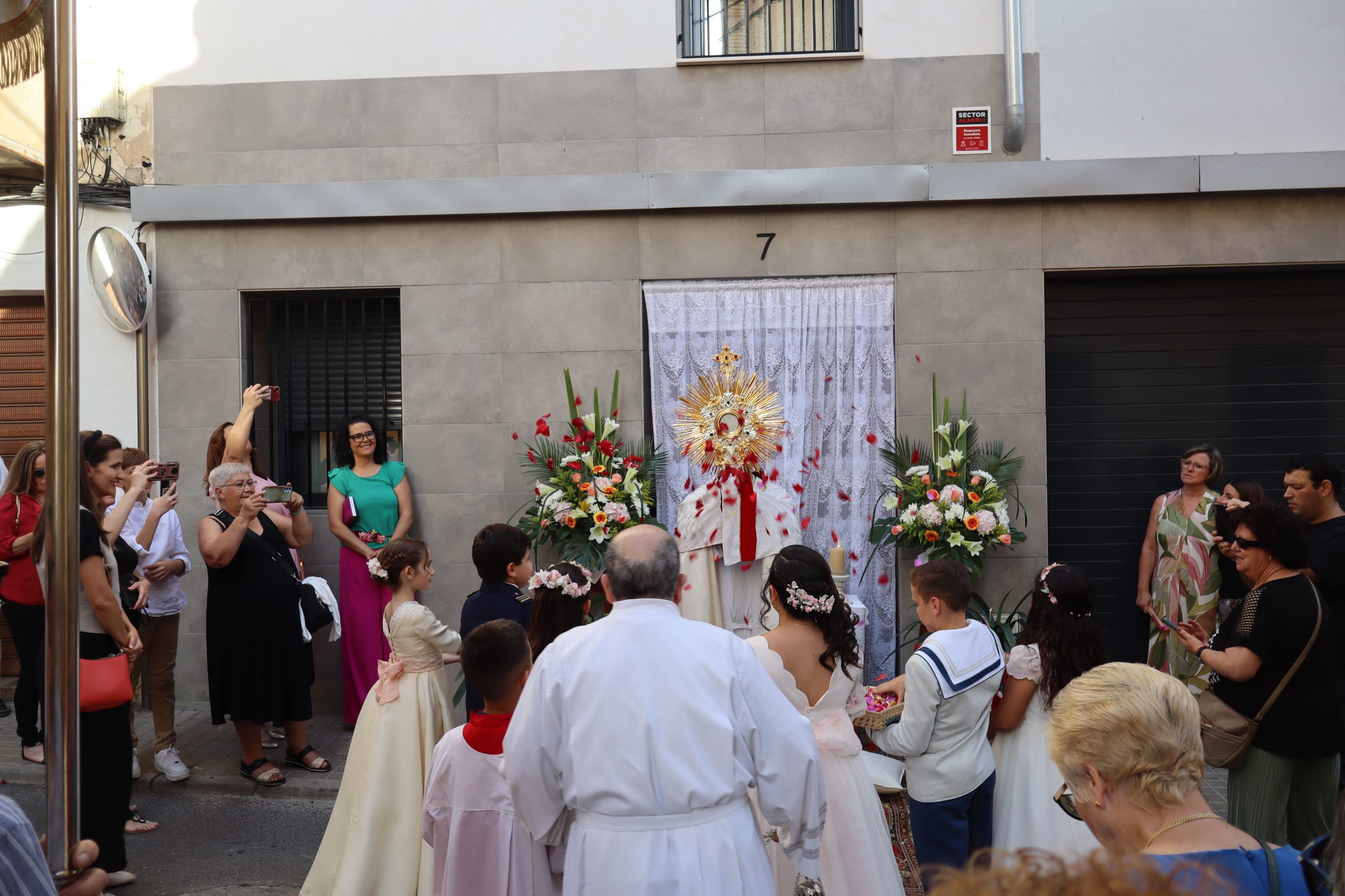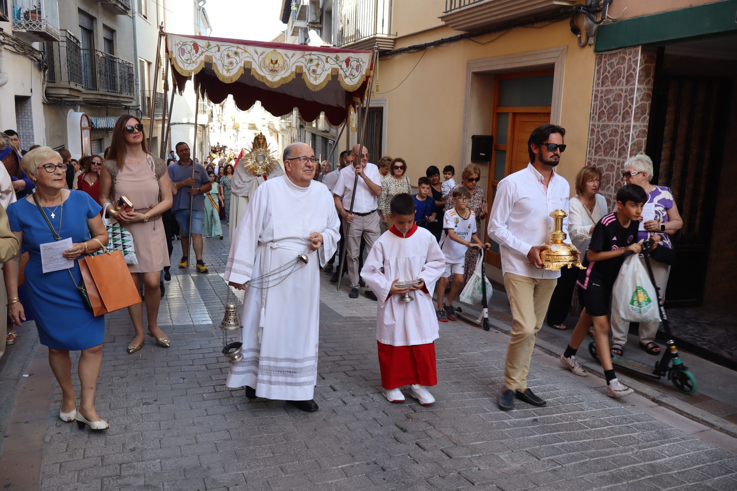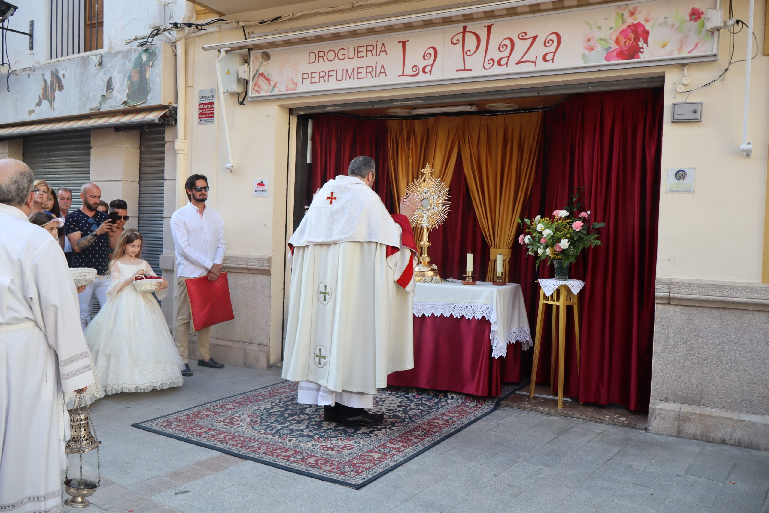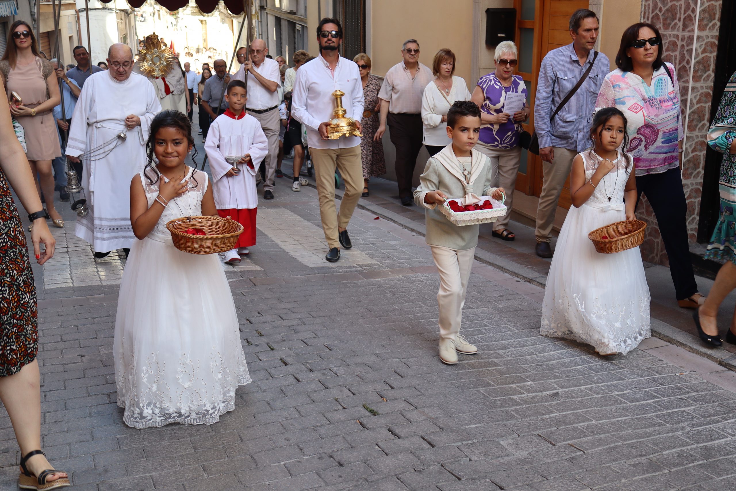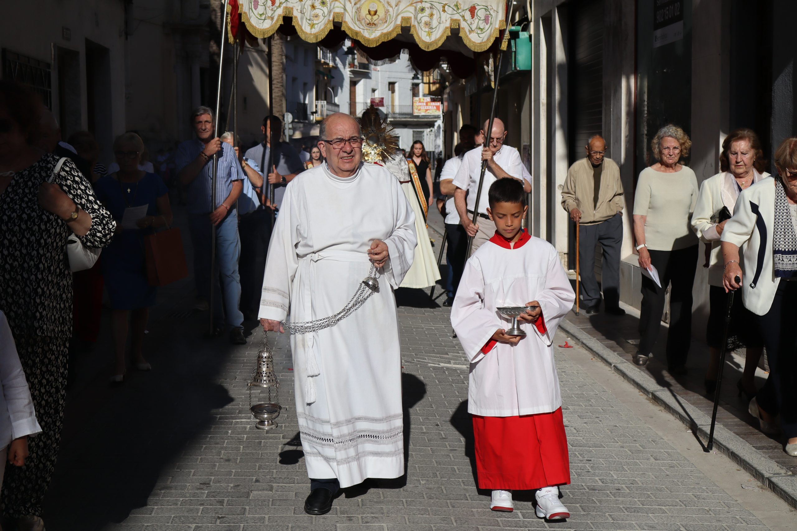 La comitiva estuvo encabezada por la Cruz Procesional, que fue portada por el sacristán Pepe, de la parroquia Nuestra Señora de los Dolores. Tras la Cruz, los niños y niñas de ambas parroquias de localidad, que este año han tomado su primera comunión. Justo detrás, iba la Custodia, portada por el párroco de la localidad Enrique Boronat, que iba bajo palio portado por varios padres de los pequeños. Desde la parroquia y en todo el recorrido fue incensado el sacristán de la parroquia San Pedro Apóstol Luís Carrascosa. A lo largo del recorrido se realizaron diferentes paradas en varios altares que preparan en las puertas de las viviendas los propios vecinos. Cuando el sacerdote alzaba la Custodia para bendecir a los asistentes, los niños y niñas le echaban pétalos de rosa. Cerrando la procesión marchaban las Misses, directiva y Banda Juvenil del Centro Instructivo La Armónica.