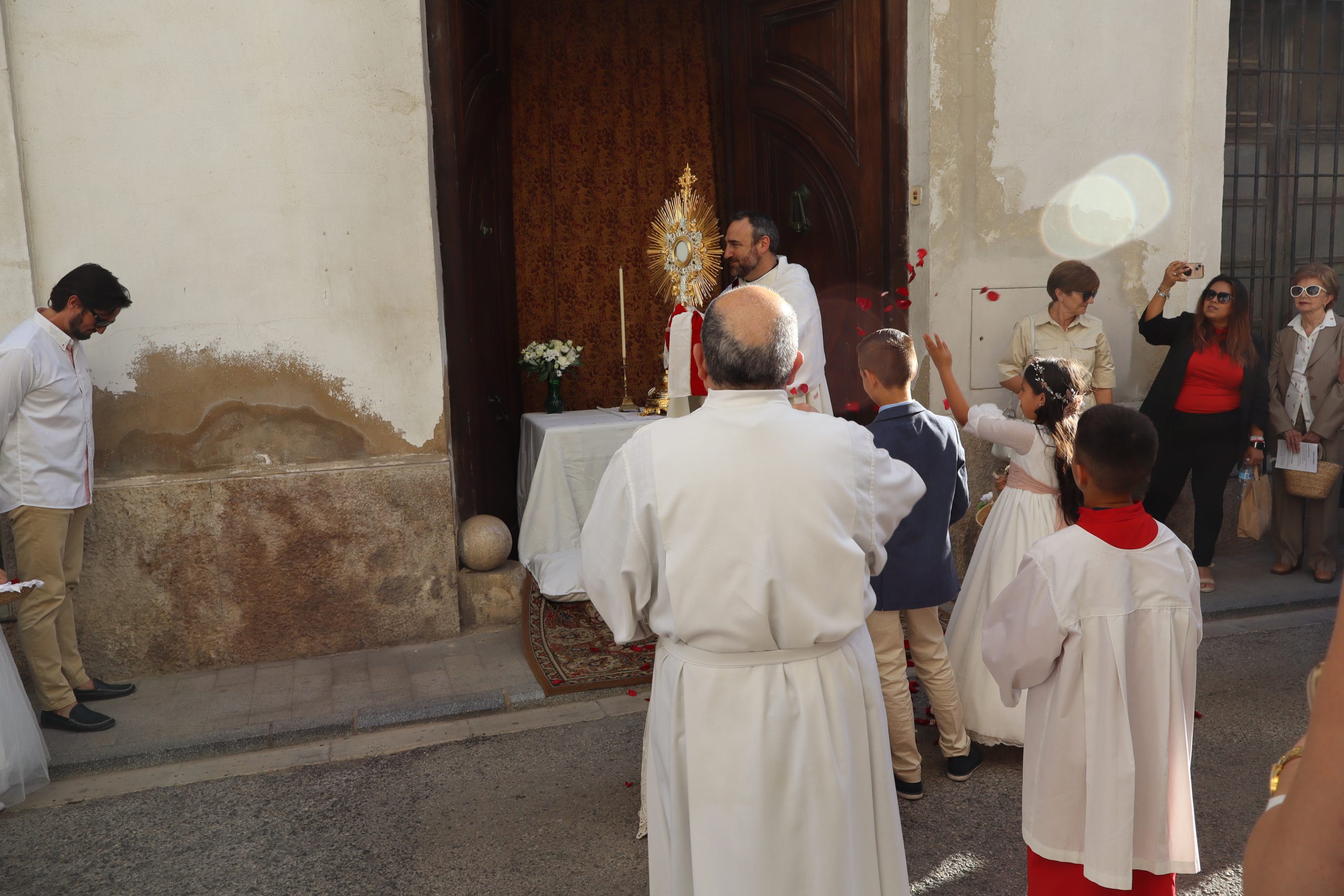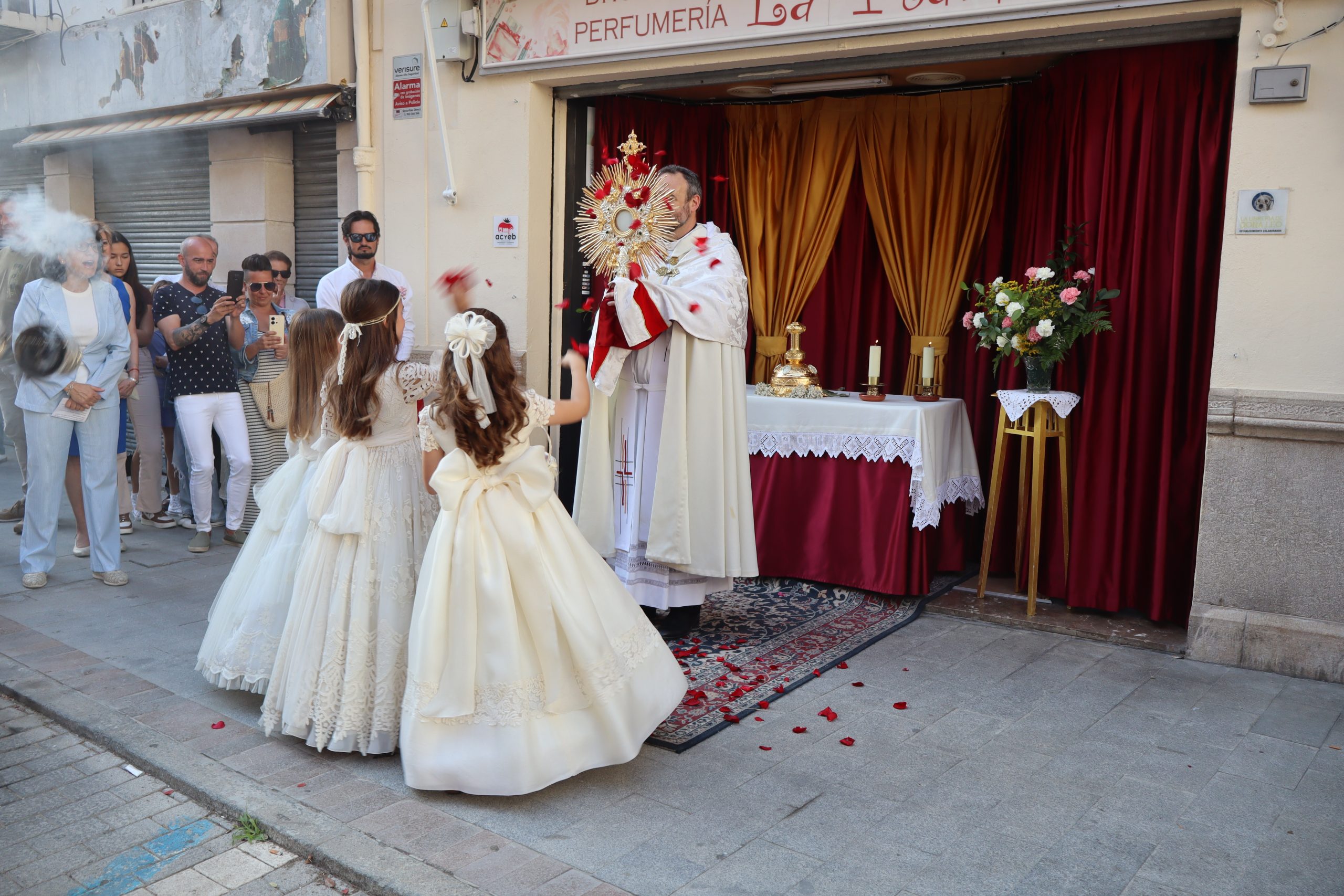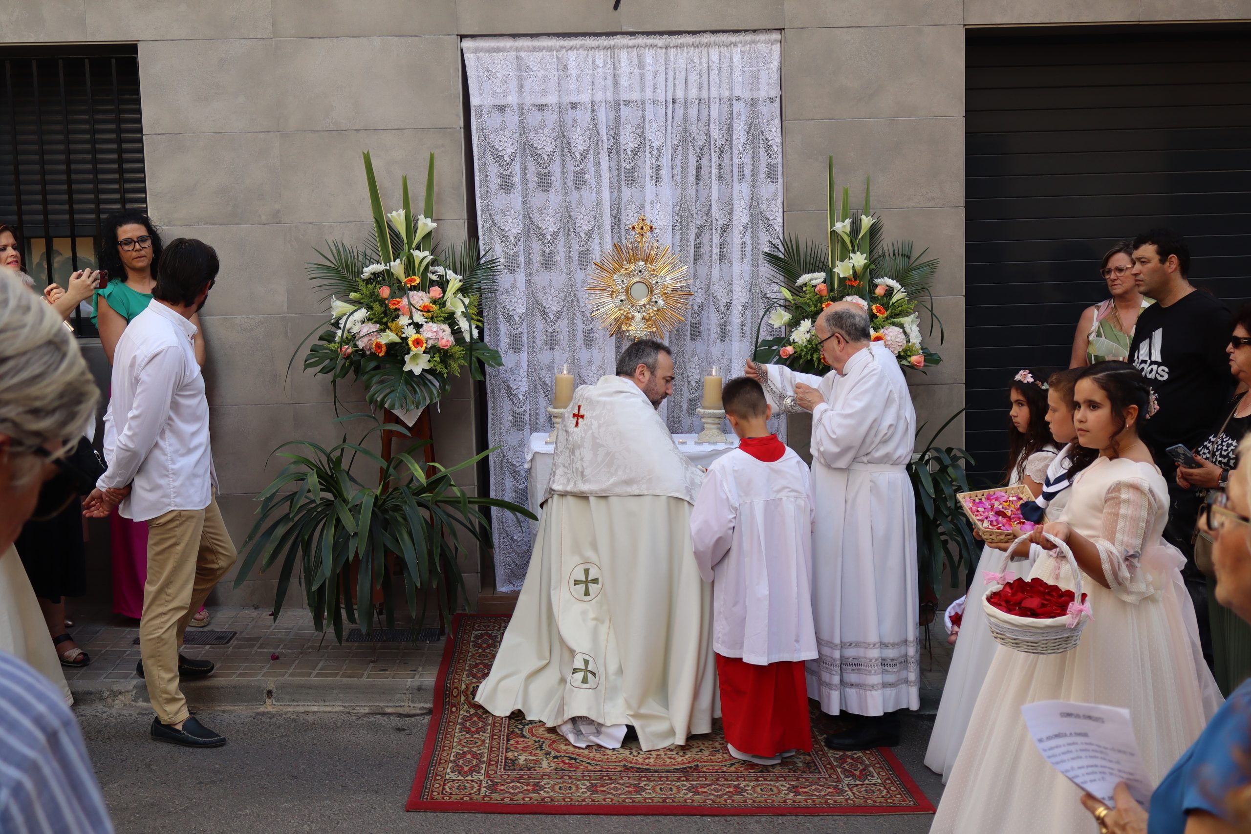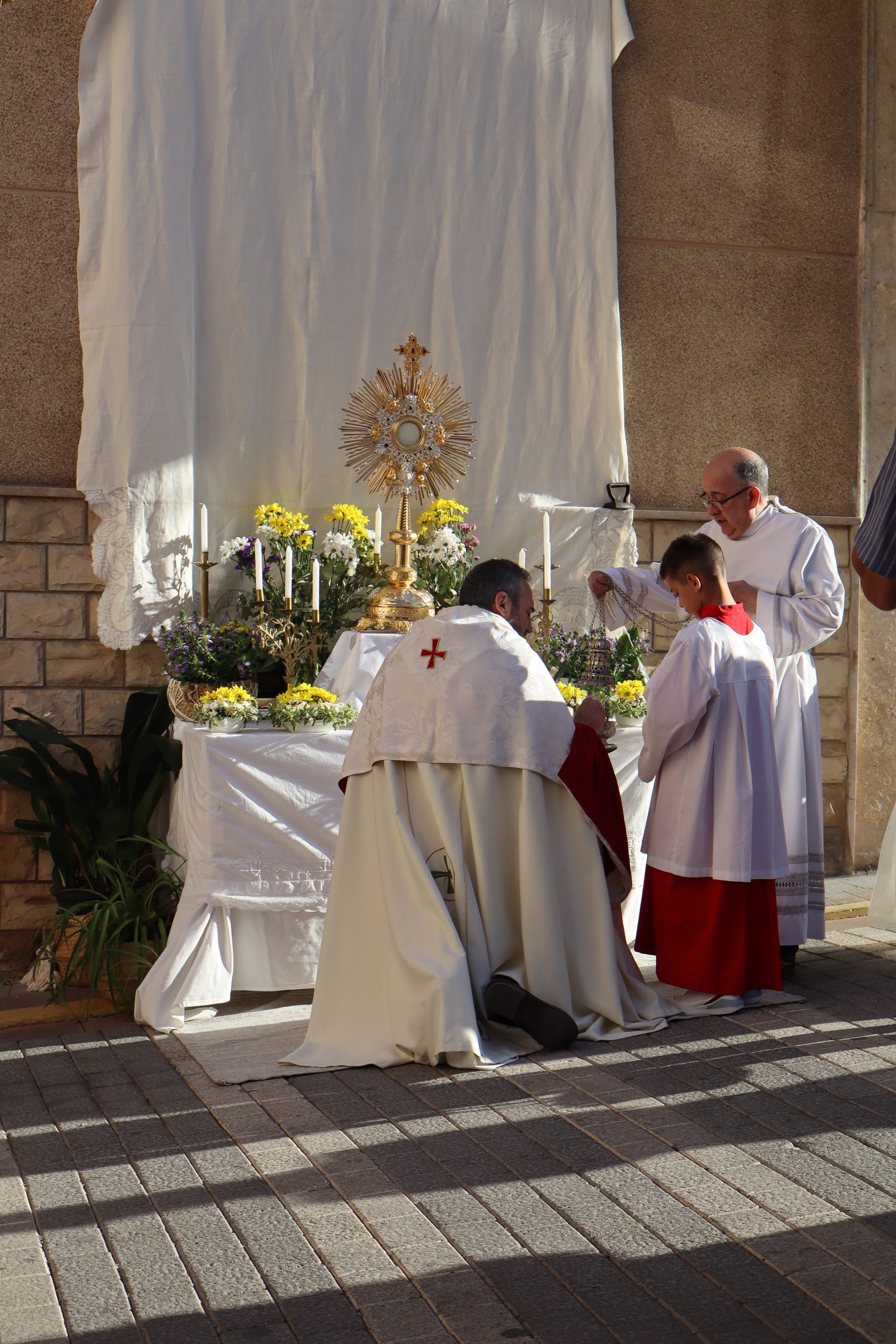 La comitiva estuvo encabezada por la Cruz Procesional, que fue portada por el sacristán Pepe, de la parroquia Nuestra Señora de los Dolores. Tras la Cruz, los niños y niñas de ambas parroquias de localidad, que este año han tomado su primera comunión. Justo detrás, iba la Custodia, portada por el párroco de la localidad Enrique Boronat, que iba bajo palio portado por varios padres de los pequeños. Desde la parroquia y en todo el recorrido fue incensado el sacristán de la parroquia San Pedro Apóstol Luís Carrascosa. A lo largo del recorrido se realizaron diferentes paradas en varios altares que preparan en las puertas de las viviendas los propios vecinos. Cuando el sacerdote alzaba la Custodia para bendecir a los asistentes, los niños y niñas le echaban pétalos de rosa. Cerrando la procesión marchaban las Misses, directiva y Banda Juvenil del Centro Instructivo La Armónica.