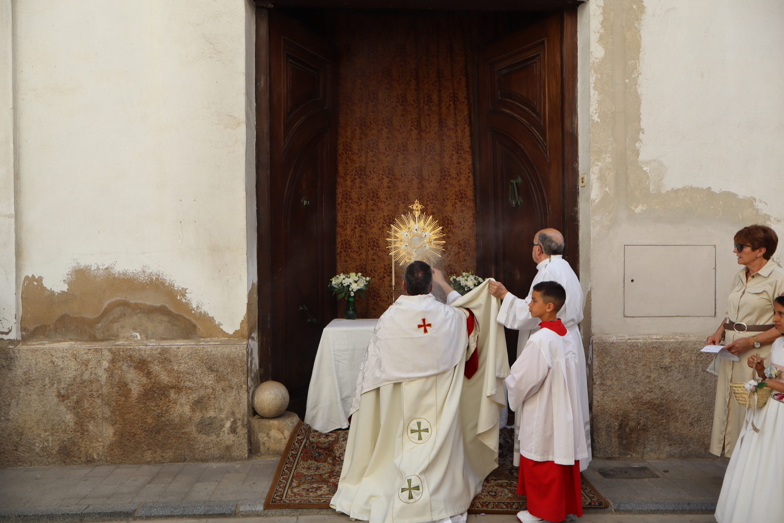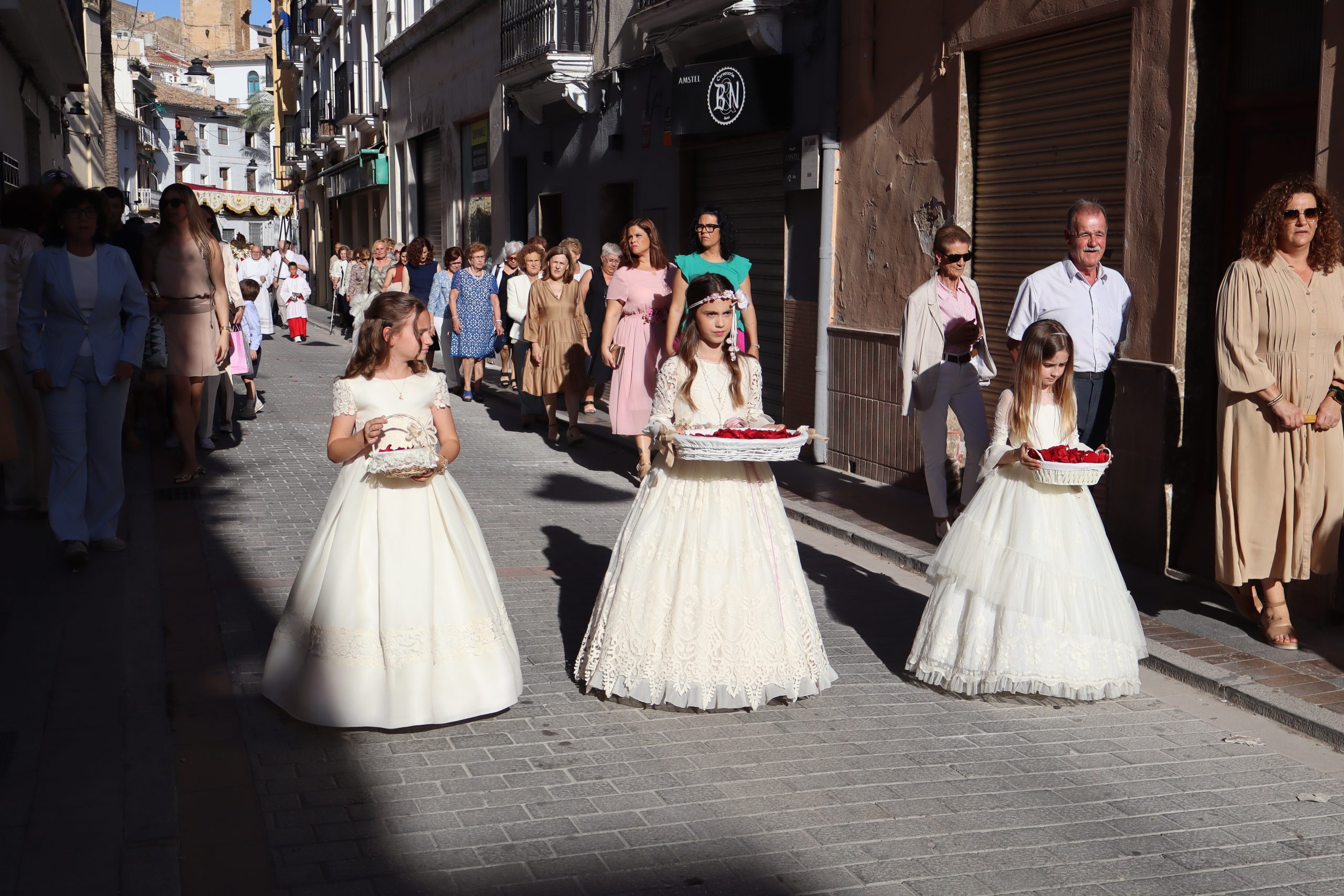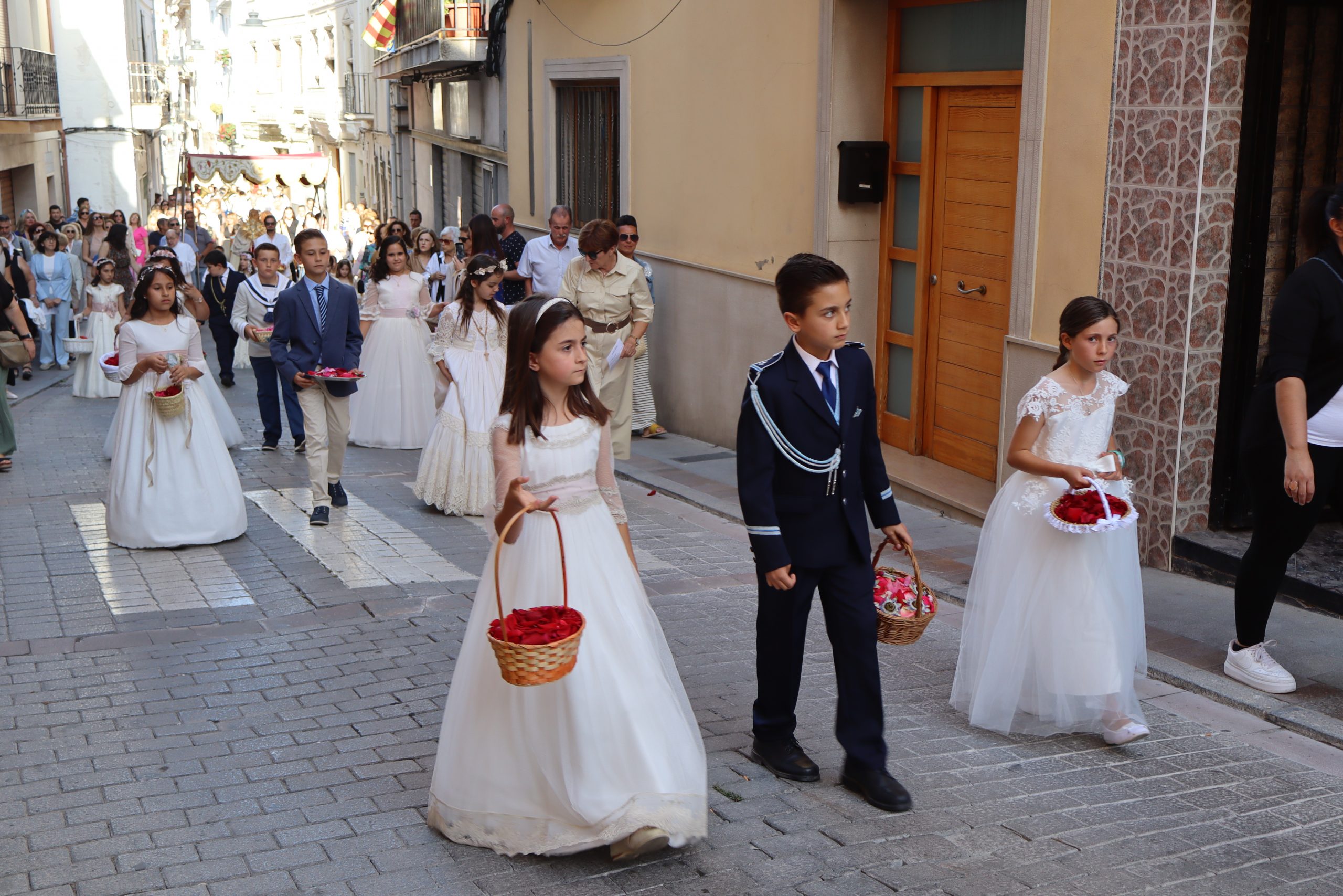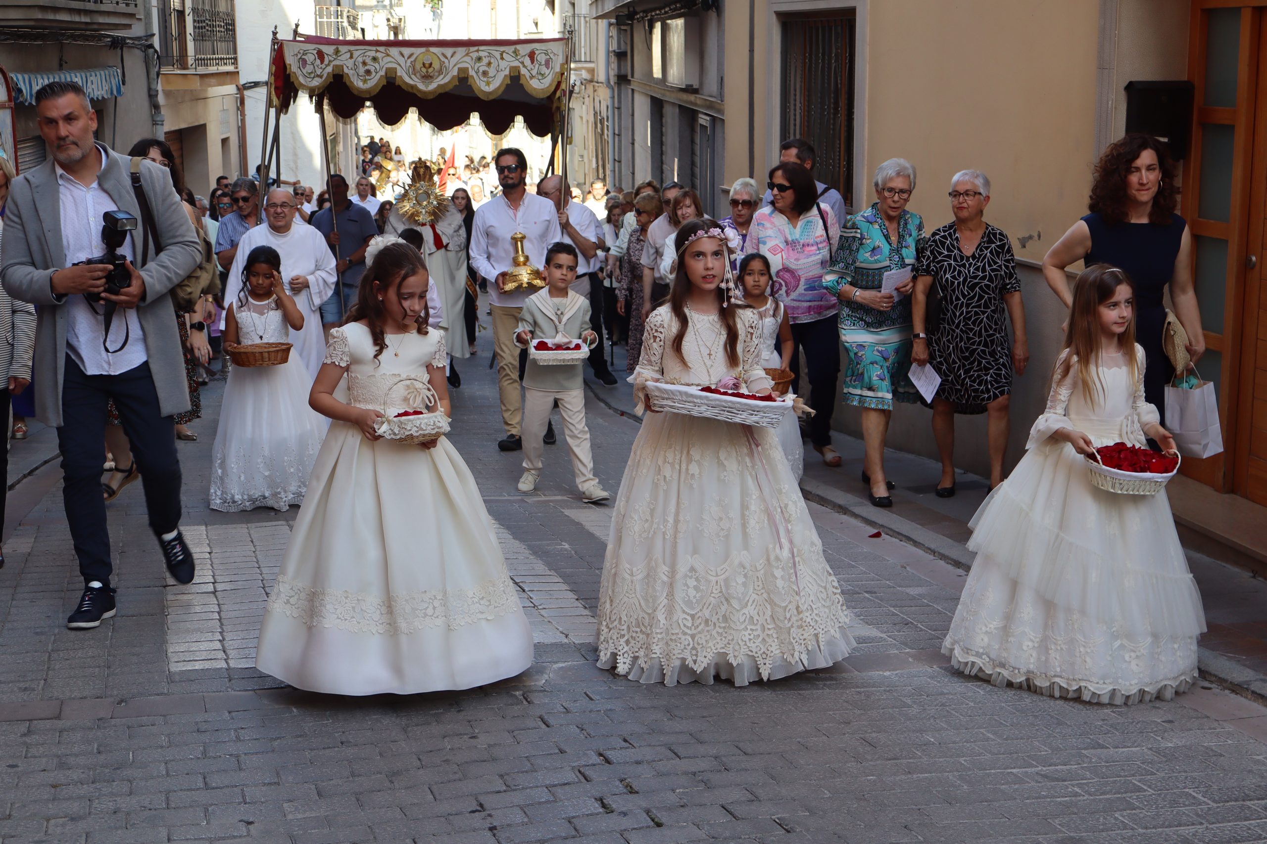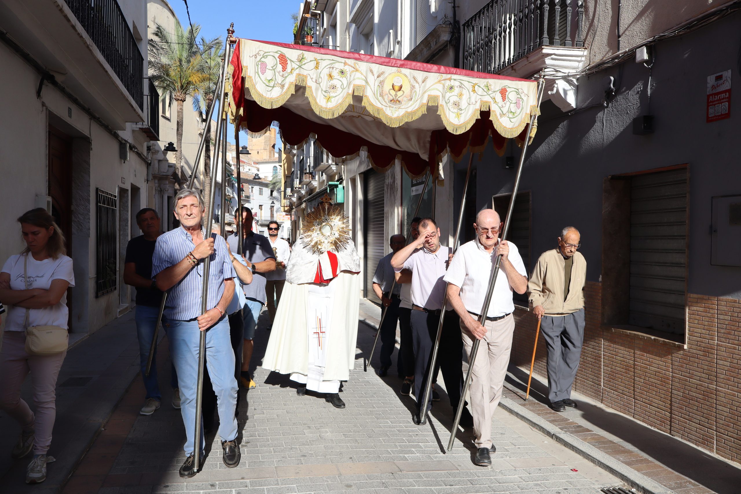 La comitiva estuvo encabezada por la Cruz Procesional, que fue portada por el sacristán Pepe, de la parroquia Nuestra Señora de los Dolores. Tras la Cruz, los niños y niñas de ambas parroquias de localidad, que este año han tomado su primera comunión. Justo detrás, iba la Custodia, portada por el párroco de la localidad Enrique Boronat, que iba bajo palio portado por varios padres de los pequeños. Desde la parroquia y en todo el recorrido fue incensado el sacristán de la parroquia San Pedro Apóstol Luís Carrascosa. A lo largo del recorrido se realizaron diferentes paradas en varios altares que preparan en las puertas de las viviendas los propios vecinos. Cuando el sacerdote alzaba la Custodia para bendecir a los asistentes, los niños y niñas le echaban pétalos de rosa. Cerrando la procesión marchaban las Misses, directiva y Banda Juvenil del Centro Instructivo La Armónica.