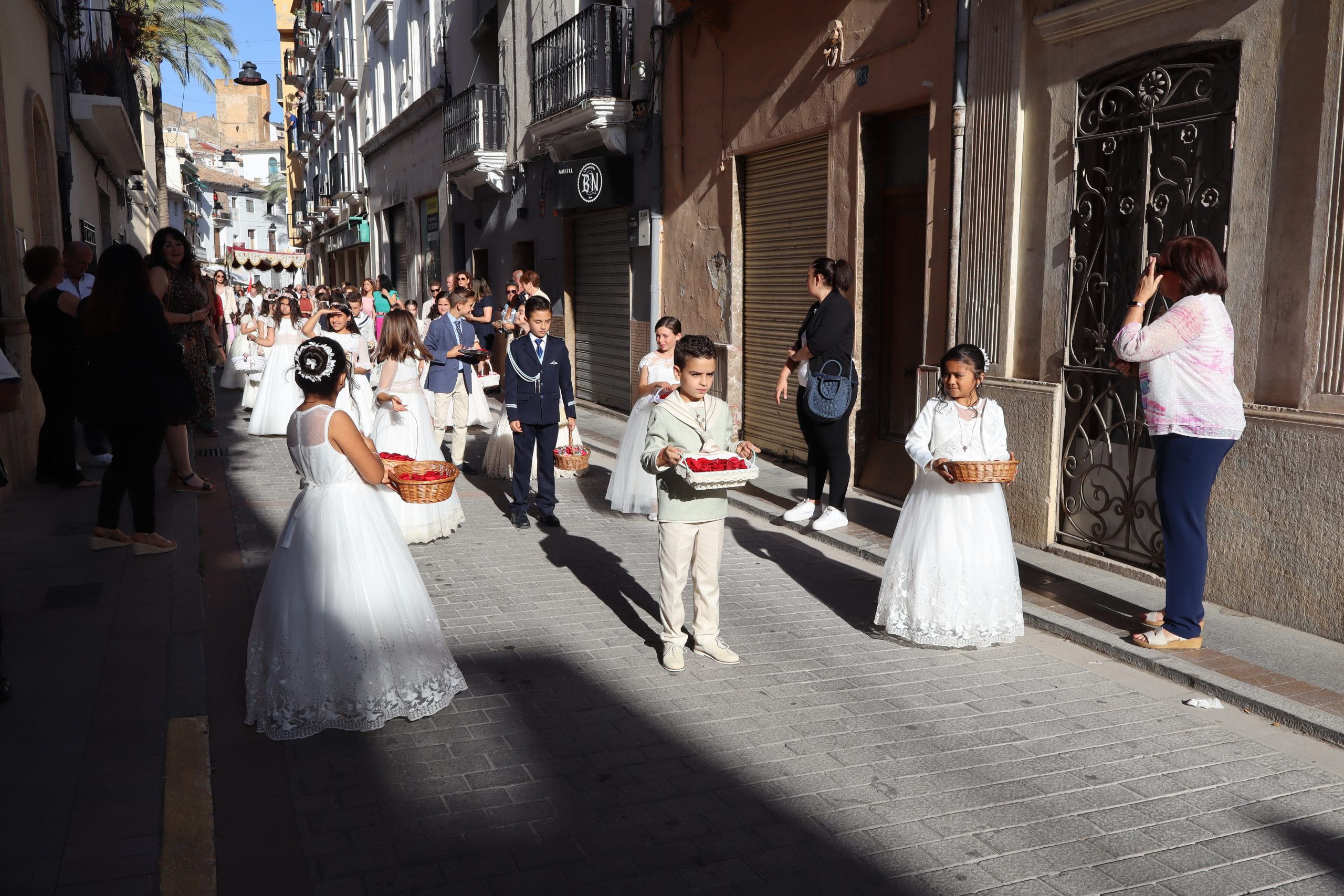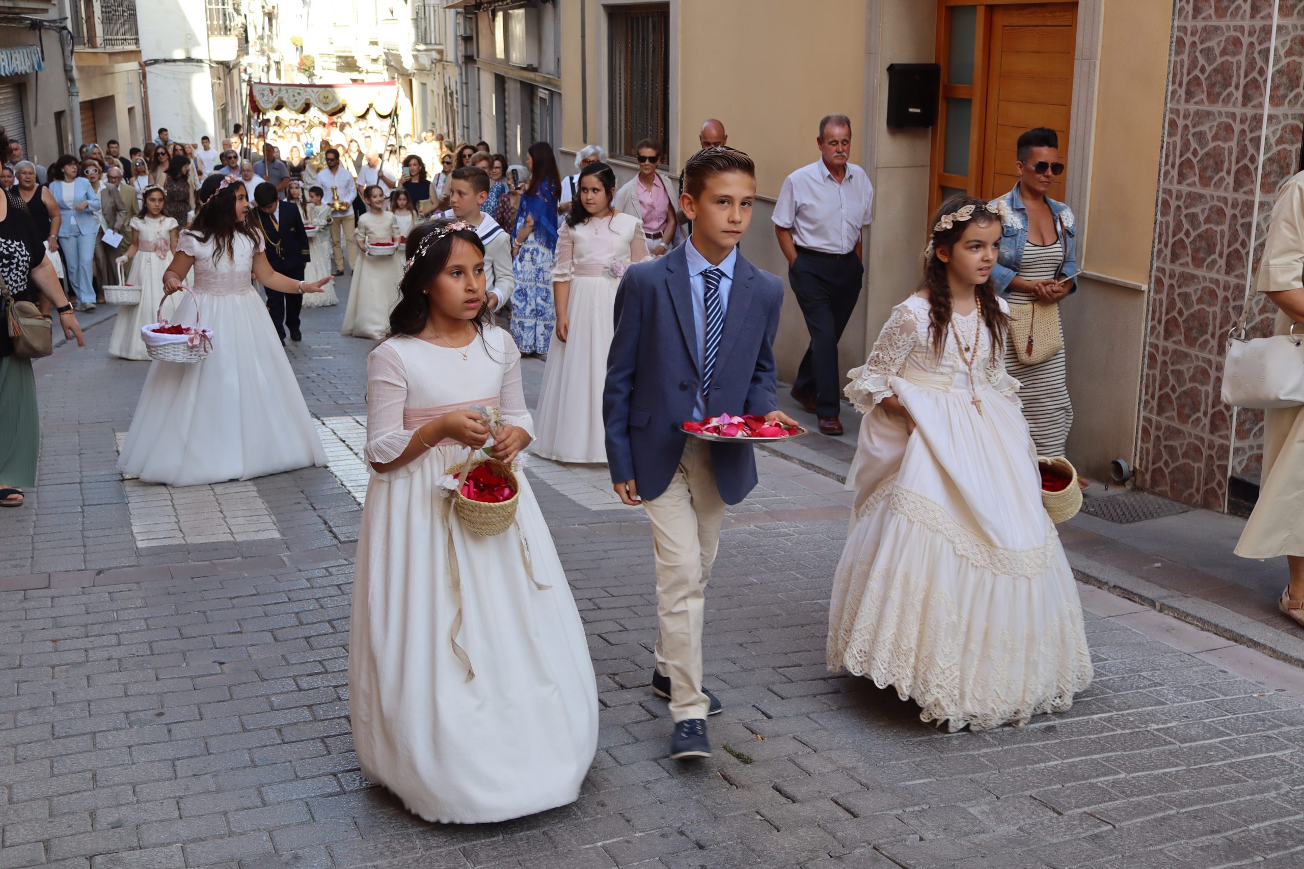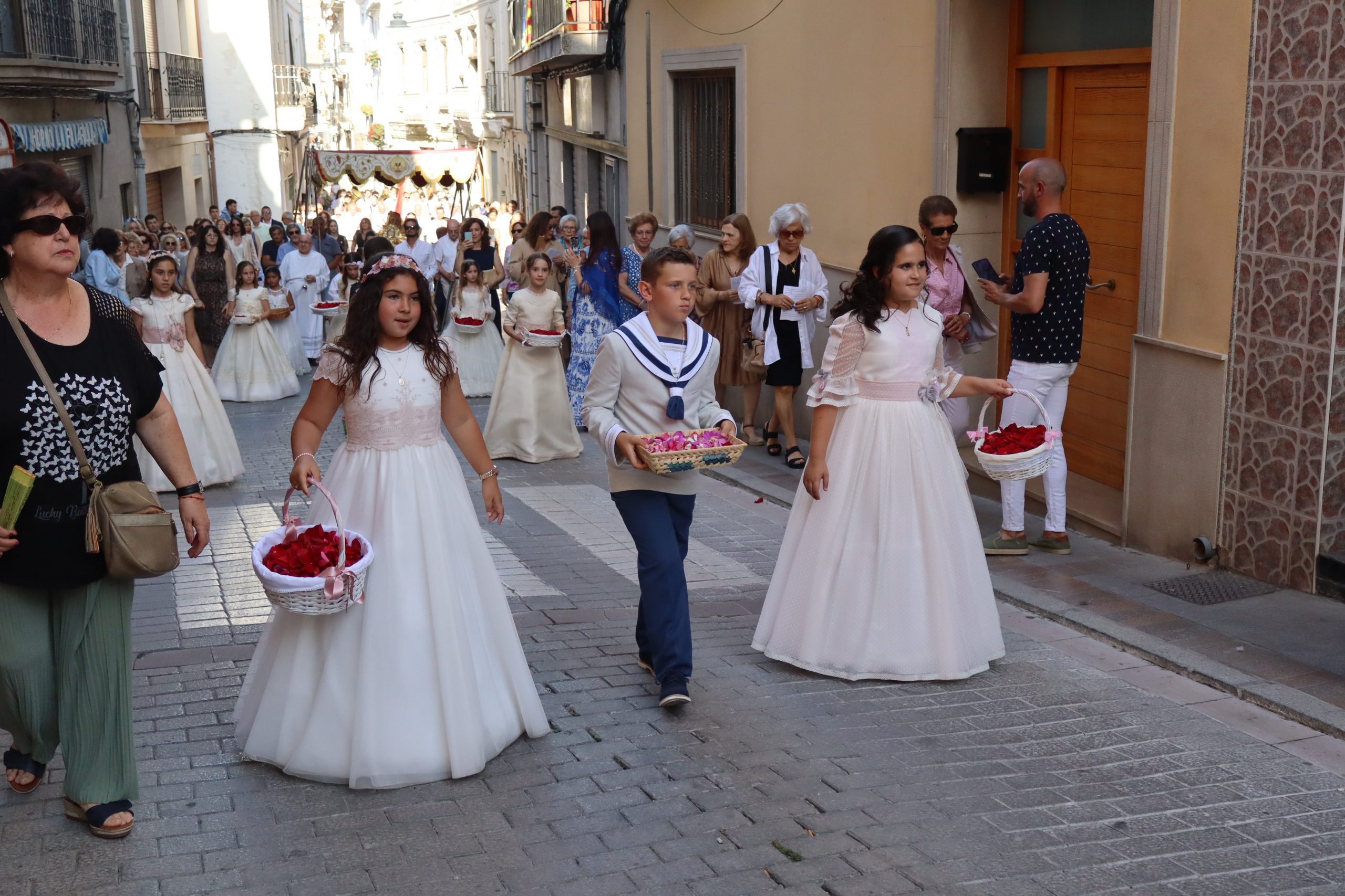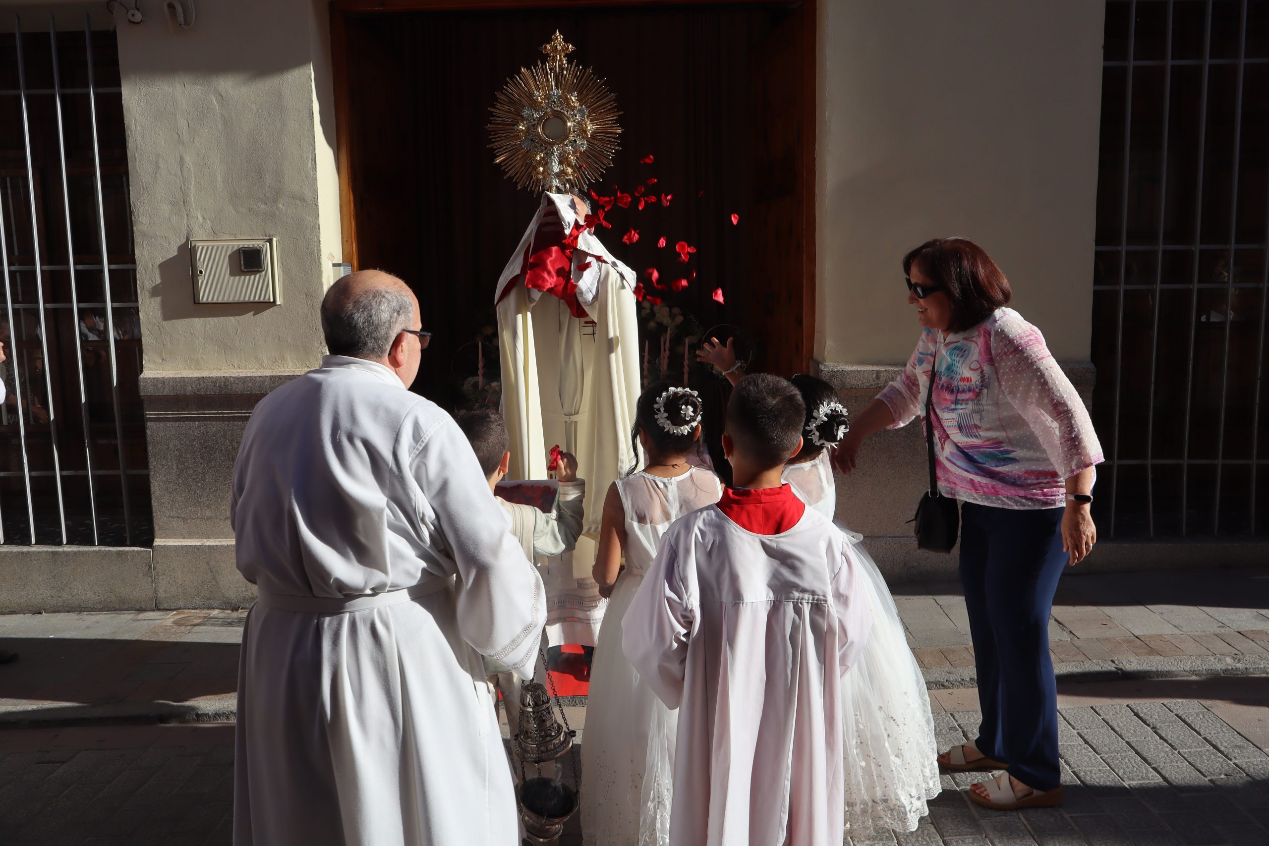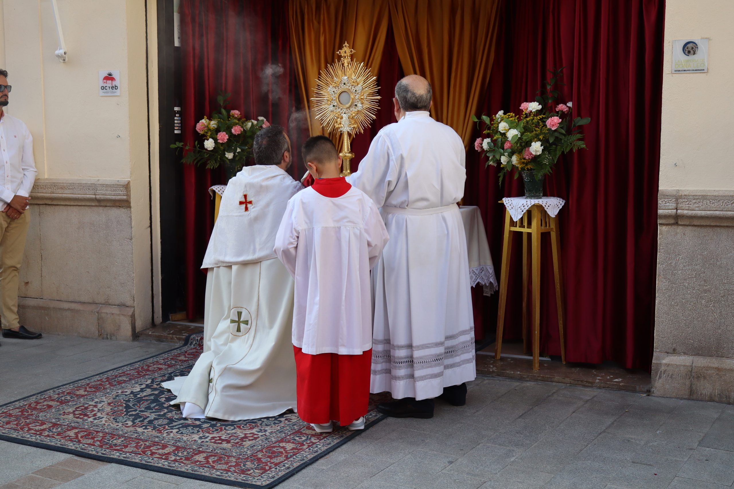 La comitiva estuvo encabezada por la Cruz Procesional, que fue portada por el sacristán Pepe, de la parroquia Nuestra Señora de los Dolores. Tras la Cruz, los niños y niñas de ambas parroquias de localidad, que este año han tomado su primera comunión. Justo detrás, iba la Custodia, portada por el párroco de la localidad Enrique Boronat, que iba bajo palio portado por varios padres de los pequeños. Desde la parroquia y en todo el recorrido fue incensado el sacristán de la parroquia San Pedro Apóstol Luís Carrascosa. A lo largo del recorrido se realizaron diferentes paradas en varios altares que preparan en las puertas de las viviendas los propios vecinos. Cuando el sacerdote alzaba la Custodia para bendecir a los asistentes, los niños y niñas le echaban pétalos de rosa. Cerrando la procesión marchaban las Misses, directiva y Banda Juvenil del Centro Instructivo La Armónica.