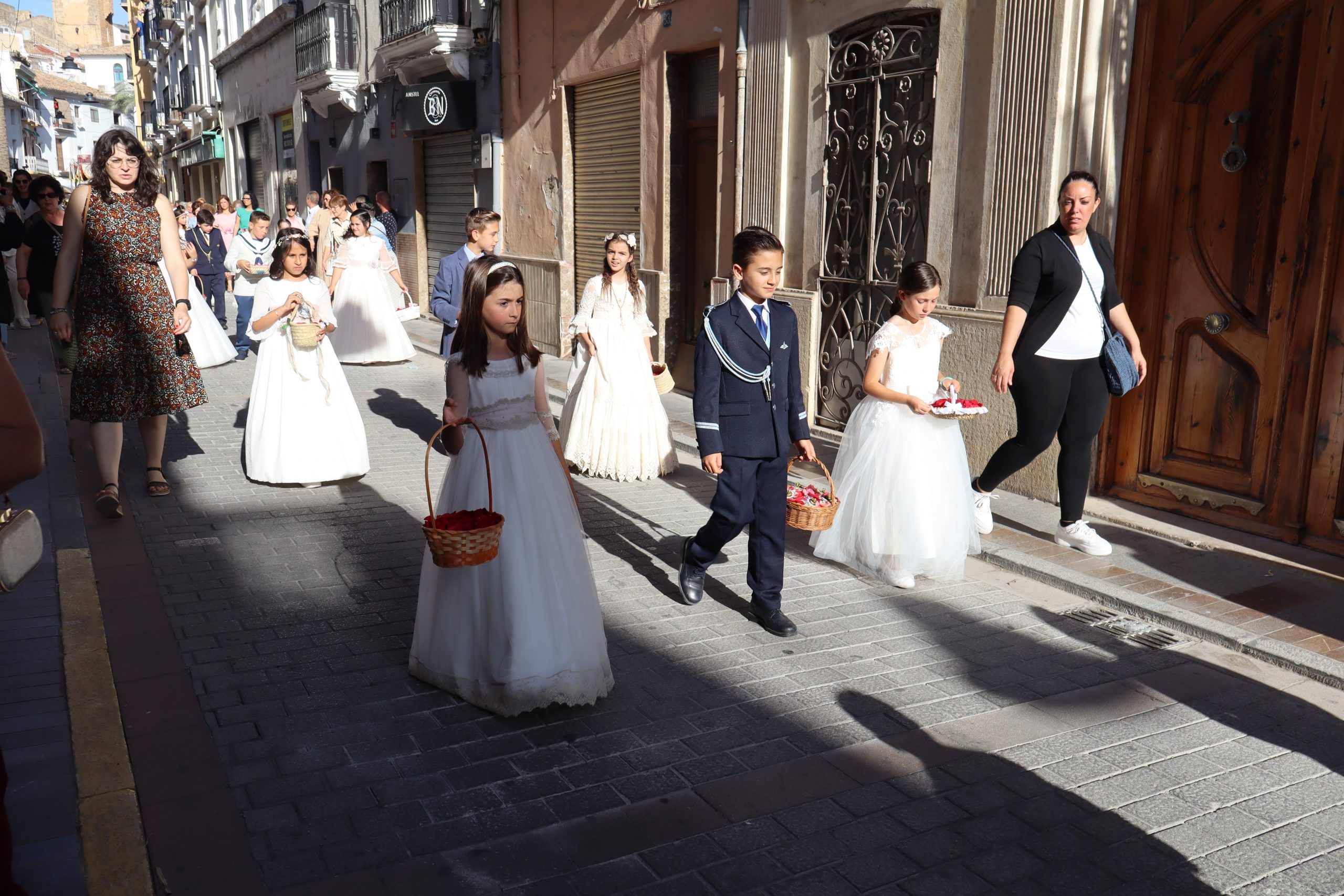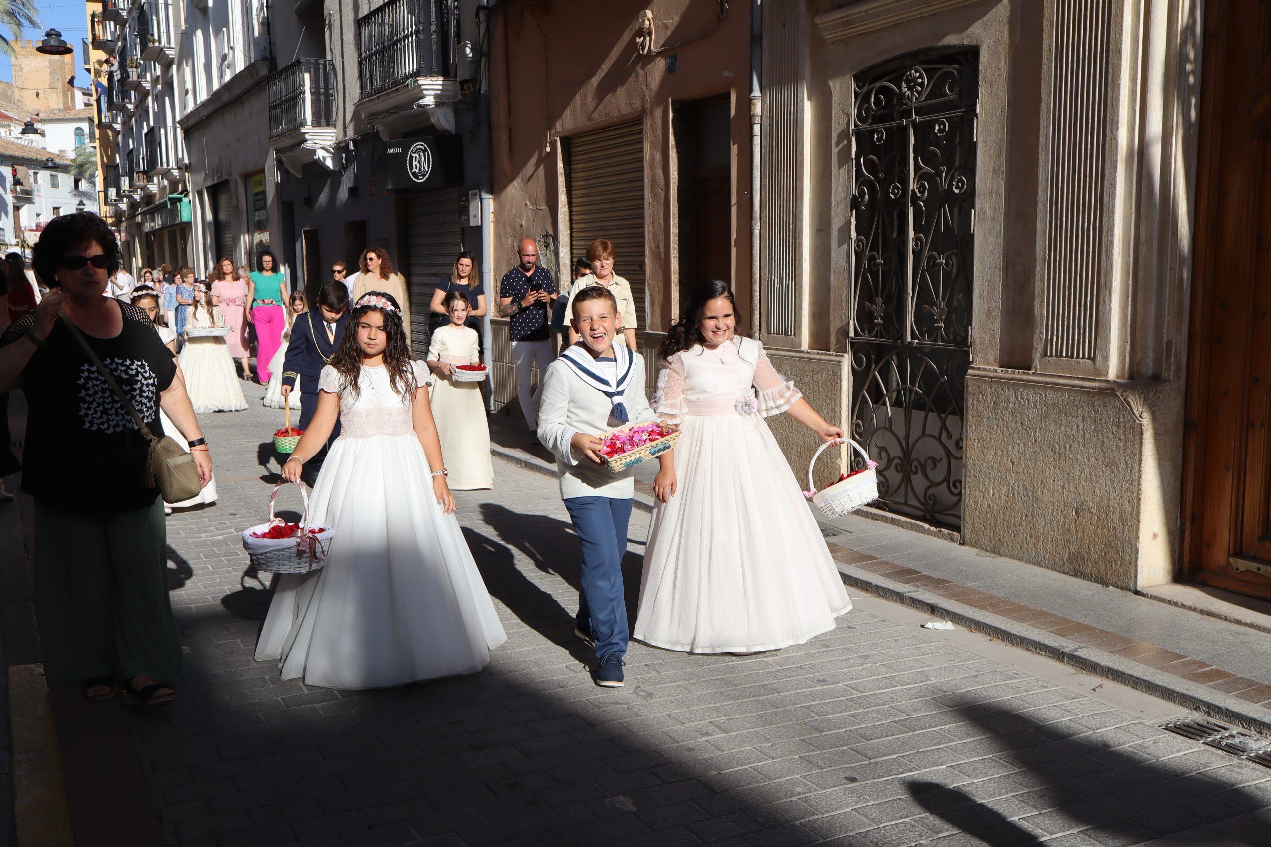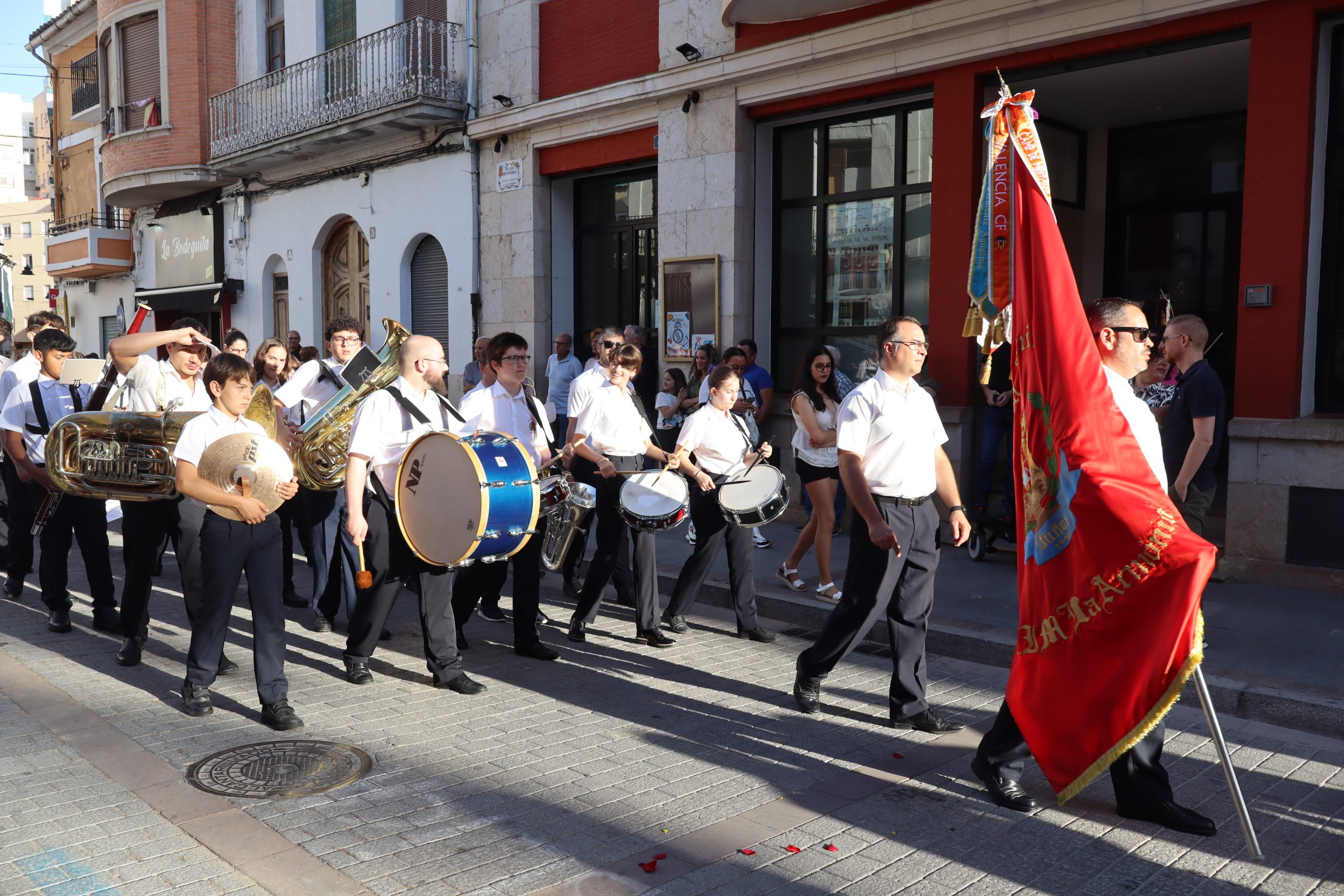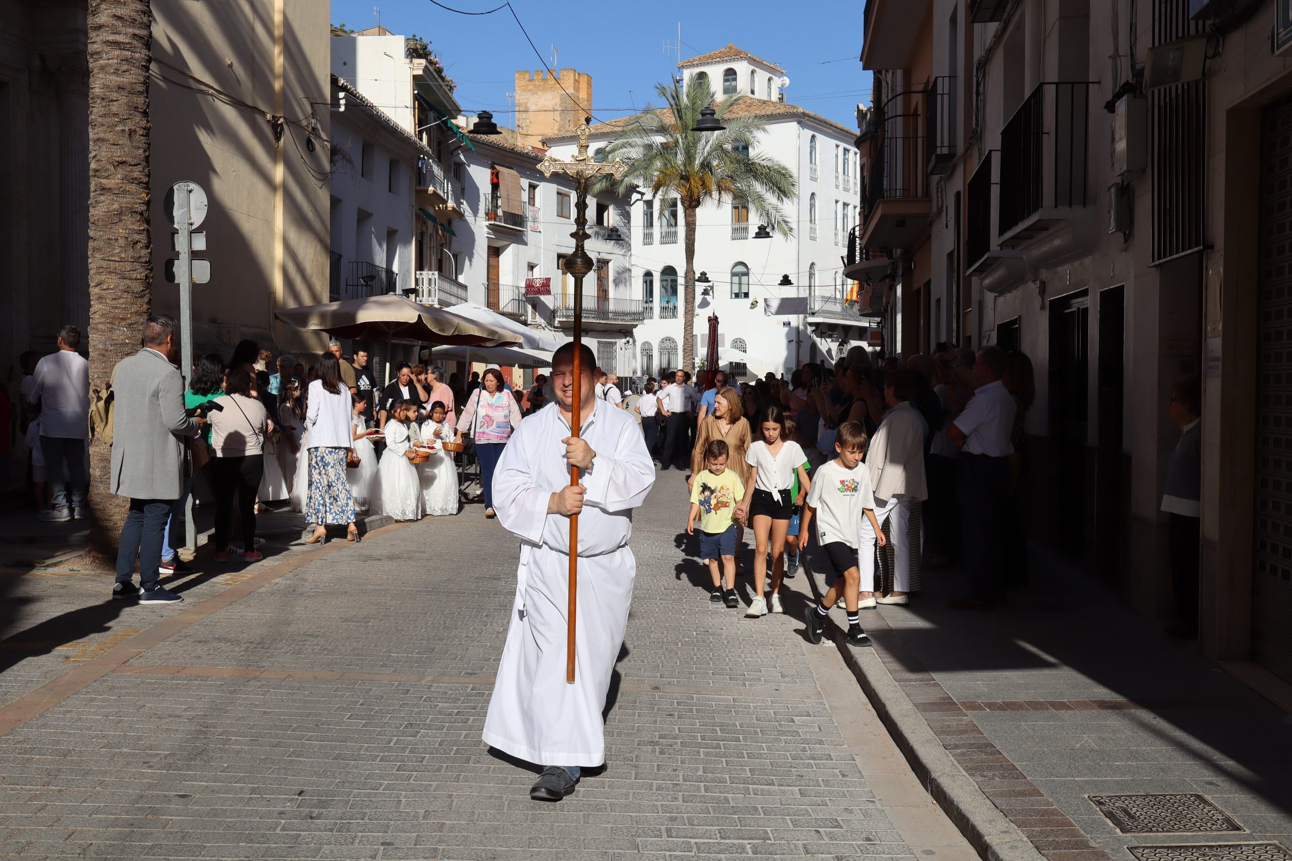 La comitiva estuvo encabezada por la Cruz Procesional, que fue portada por el sacristán Pepe, de la parroquia Nuestra Señora de los Dolores. Tras la Cruz, los niños y niñas de ambas parroquias de localidad, que este año han tomado su primera comunión. Justo detrás, iba la Custodia, portada por el párroco de la localidad Enrique Boronat, que iba bajo palio portado por varios padres de los pequeños. Desde la parroquia y en todo el recorrido fue incensado el sacristán de la parroquia San Pedro Apóstol Luís Carrascosa. A lo largo del recorrido se realizaron diferentes paradas en varios altares que preparan en las puertas de las viviendas los propios vecinos. Cuando el sacerdote alzaba la Custodia para bendecir a los asistentes, los niños y niñas le echaban pétalos de rosa. Cerrando la procesión marchaban las Misses, directiva y Banda Juvenil del Centro Instructivo La Armónica.