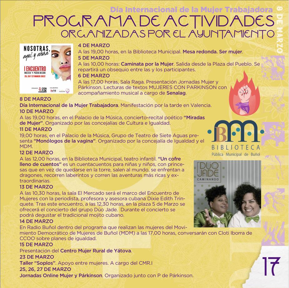 Redacción.- La Concejalía de Igualdad del Ayuntamiento de Buñol, el Movimiento Democrático de Mujeres (MDM), la Concejalía de Cultura, el Club de Correores, la Asociación Valenciana de Amistad con Cuba y con P de Párkinson, organizan hasta el 27 de marzo un amplio conjunto de actividades sobre la mujer.