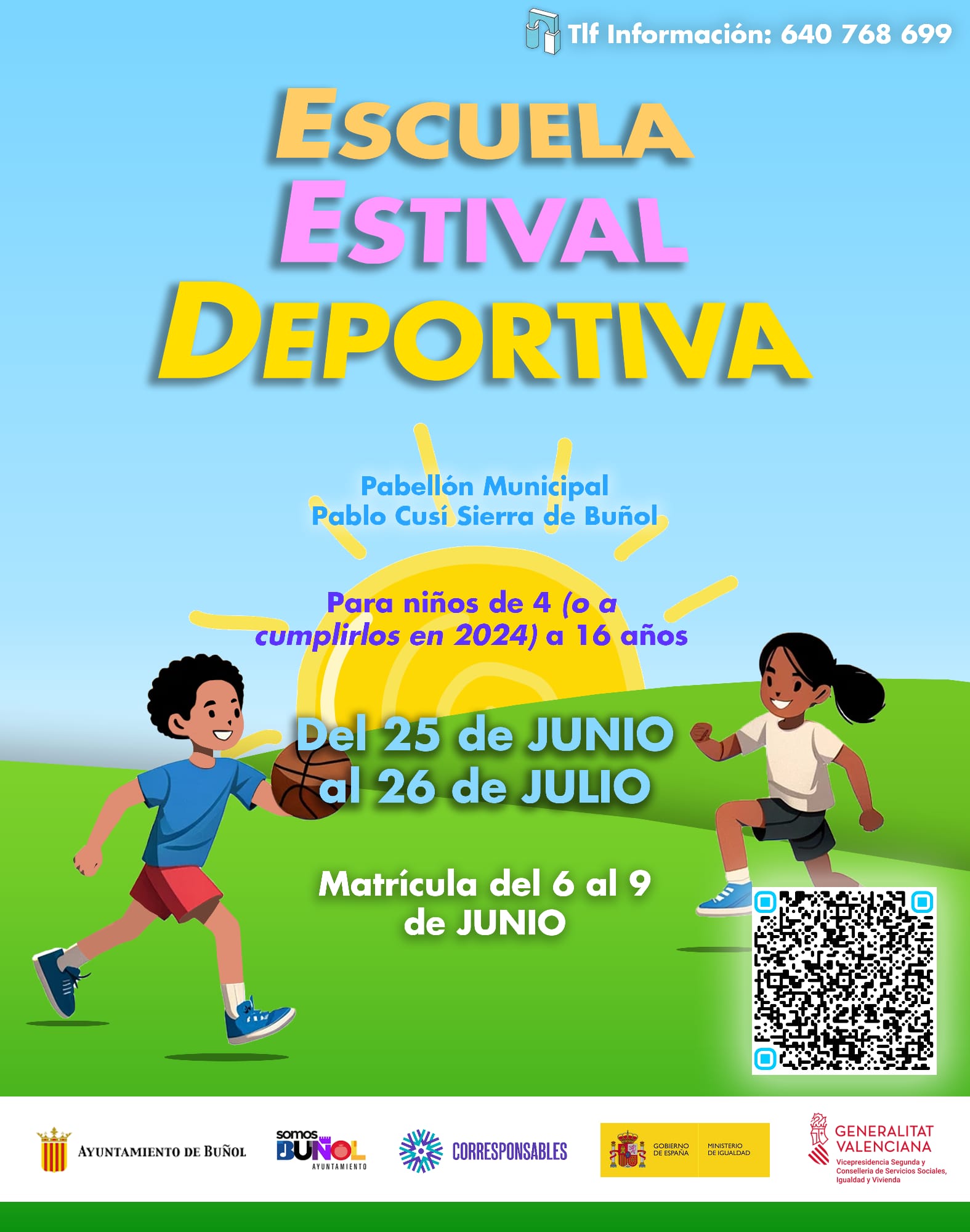 Todos los interesados en apuntar a sus pequeños a la EPI de Buñol para este verano deben reservar la plaza del 11 al 12 de junio por registro de entrada en el Ayuntamiento u on-line por la sede electrónica del Consistorio o mediante cualquiera de los medios art.16 Ley 39/2015 de 1 de octubre. Mientras que para asistir a la Escuela Estival Deportiva deben rellenar la preinscripción a través del QR del 6 al 9 de junio.