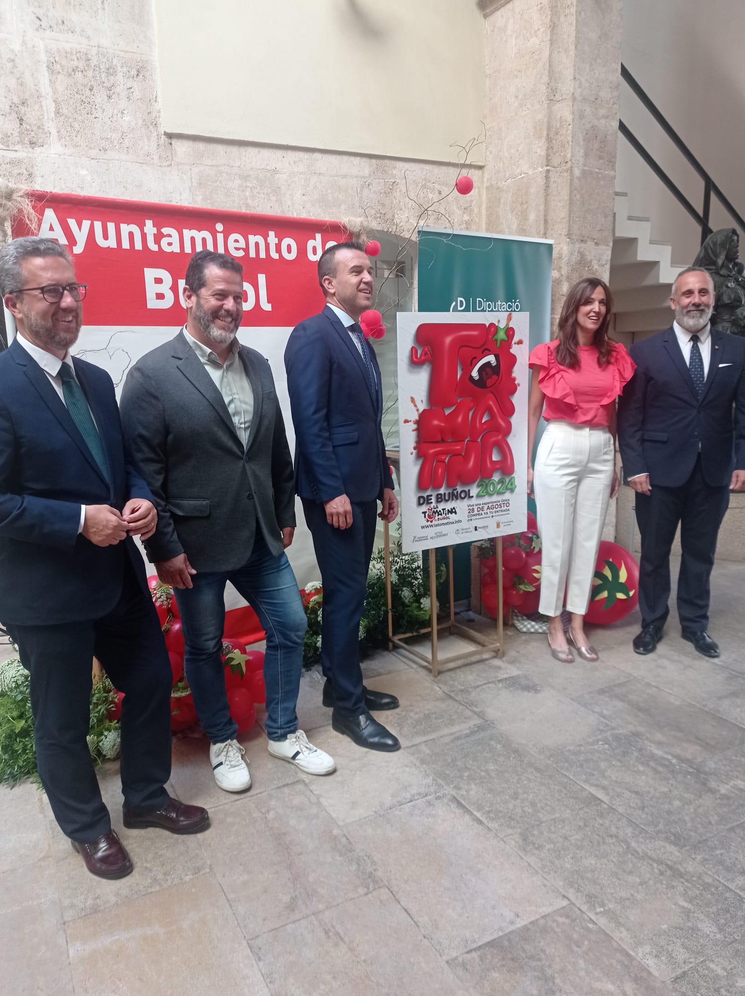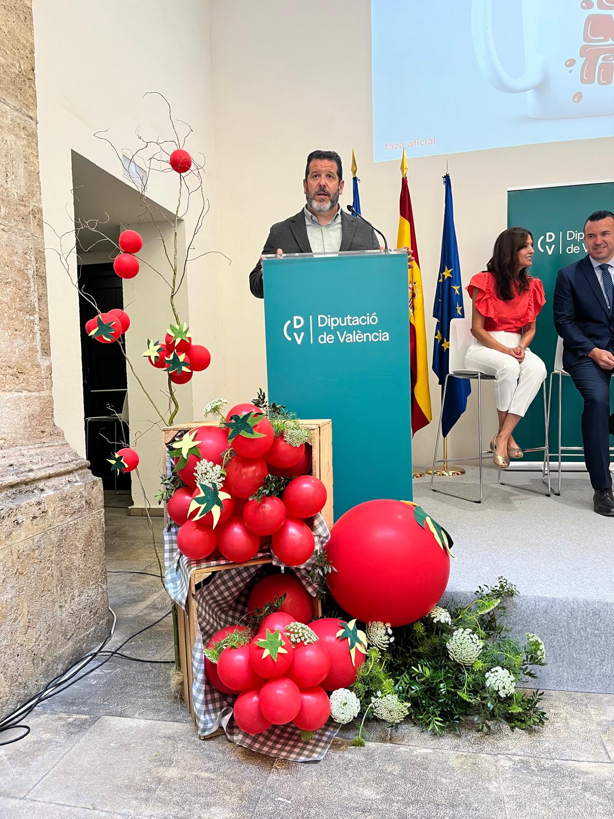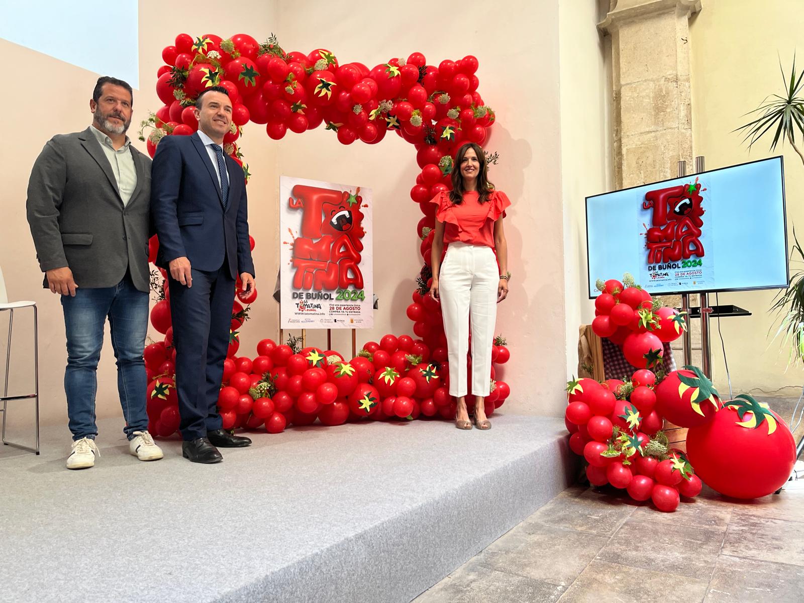 Redacción.- El Palacio Marqués de Scala, en la Plaza Manises de Valencia, ha albergado esta mañana la presentación de la imagen de La Tomatina 2024. Ha contado con las intervenciones de la Alcaldesa de Buñol, Virginia Sanz; el concejal de Fiestas y Tomatina, Sergio Galarza; y el presidente de la Diputación, Vicent Mompó.