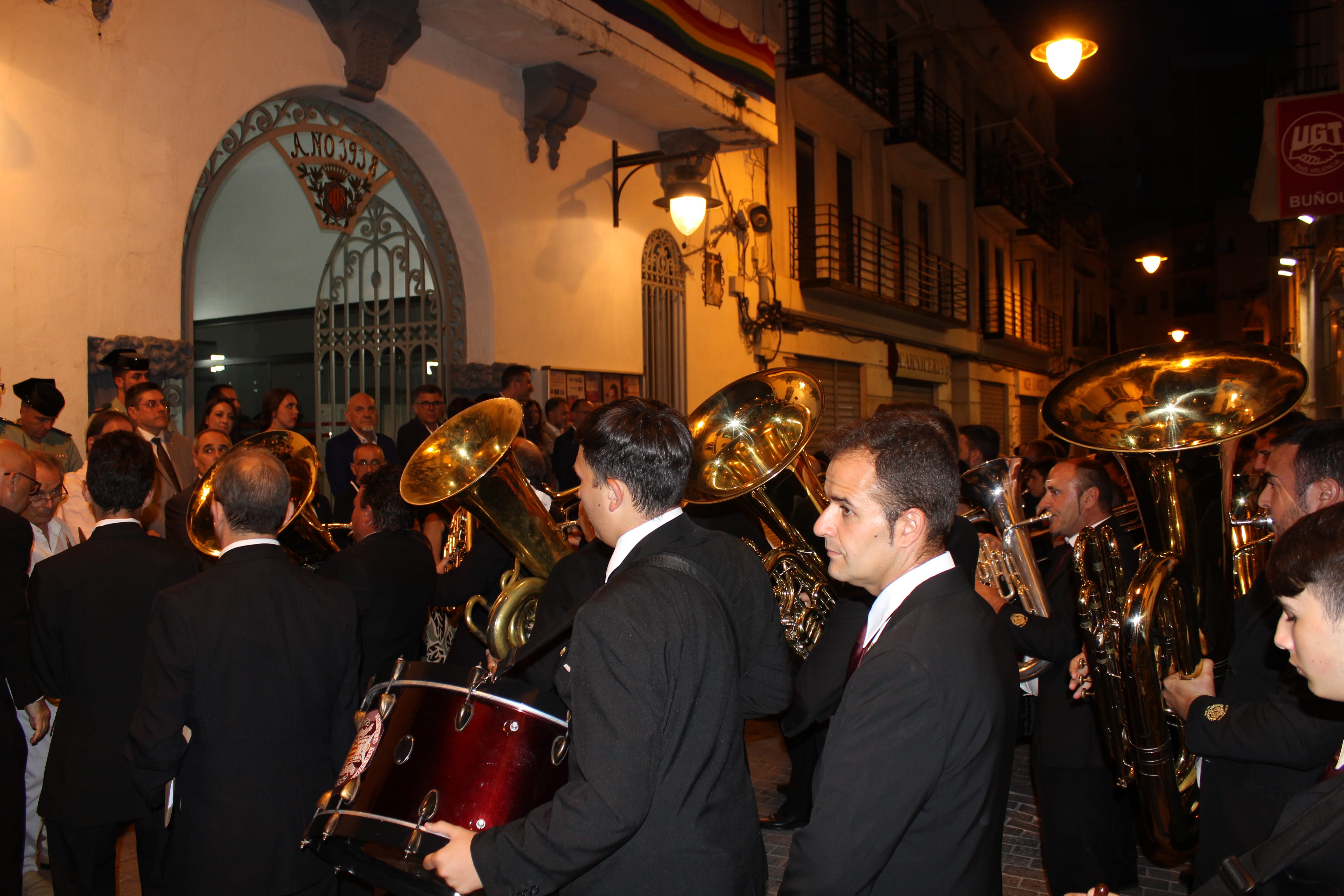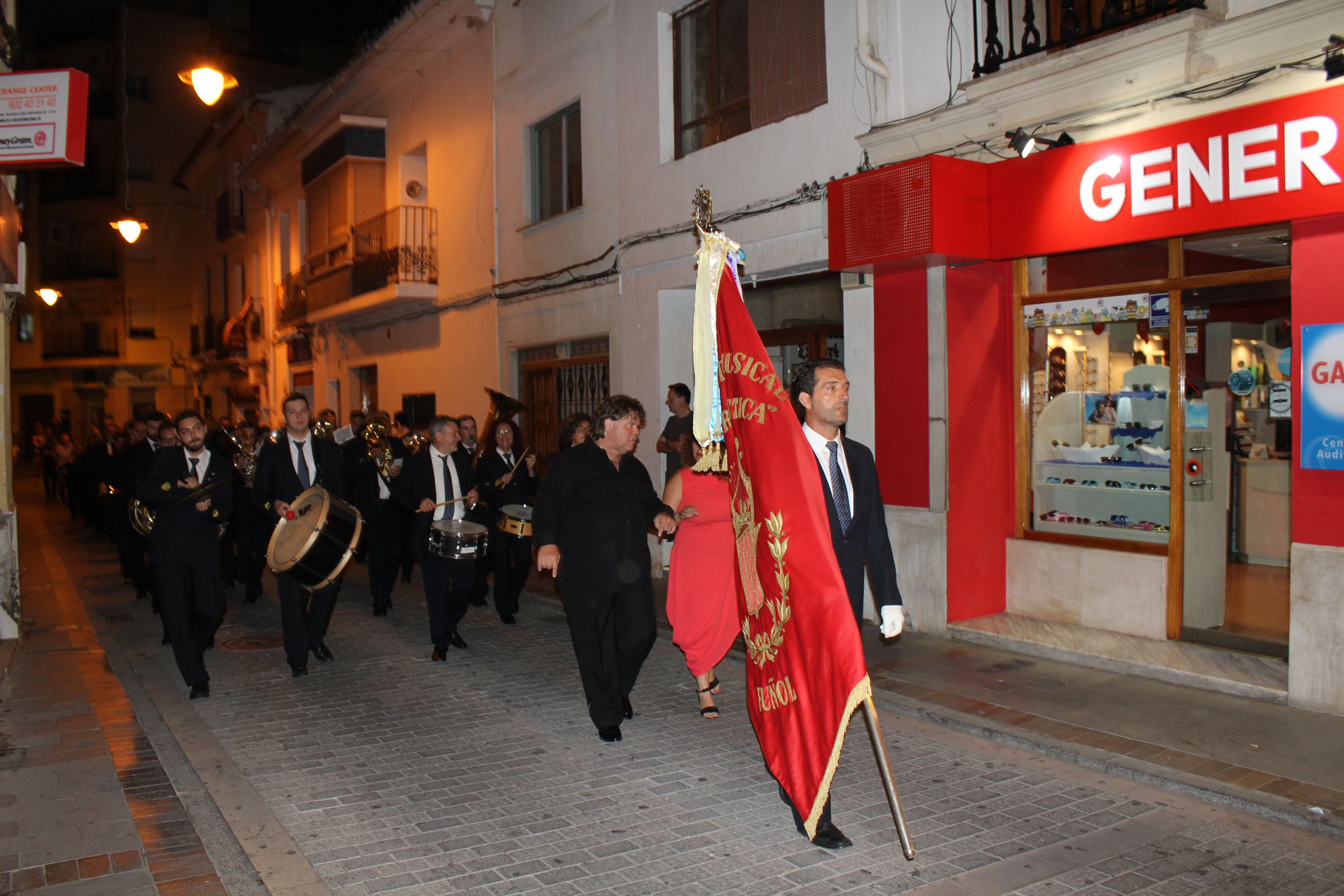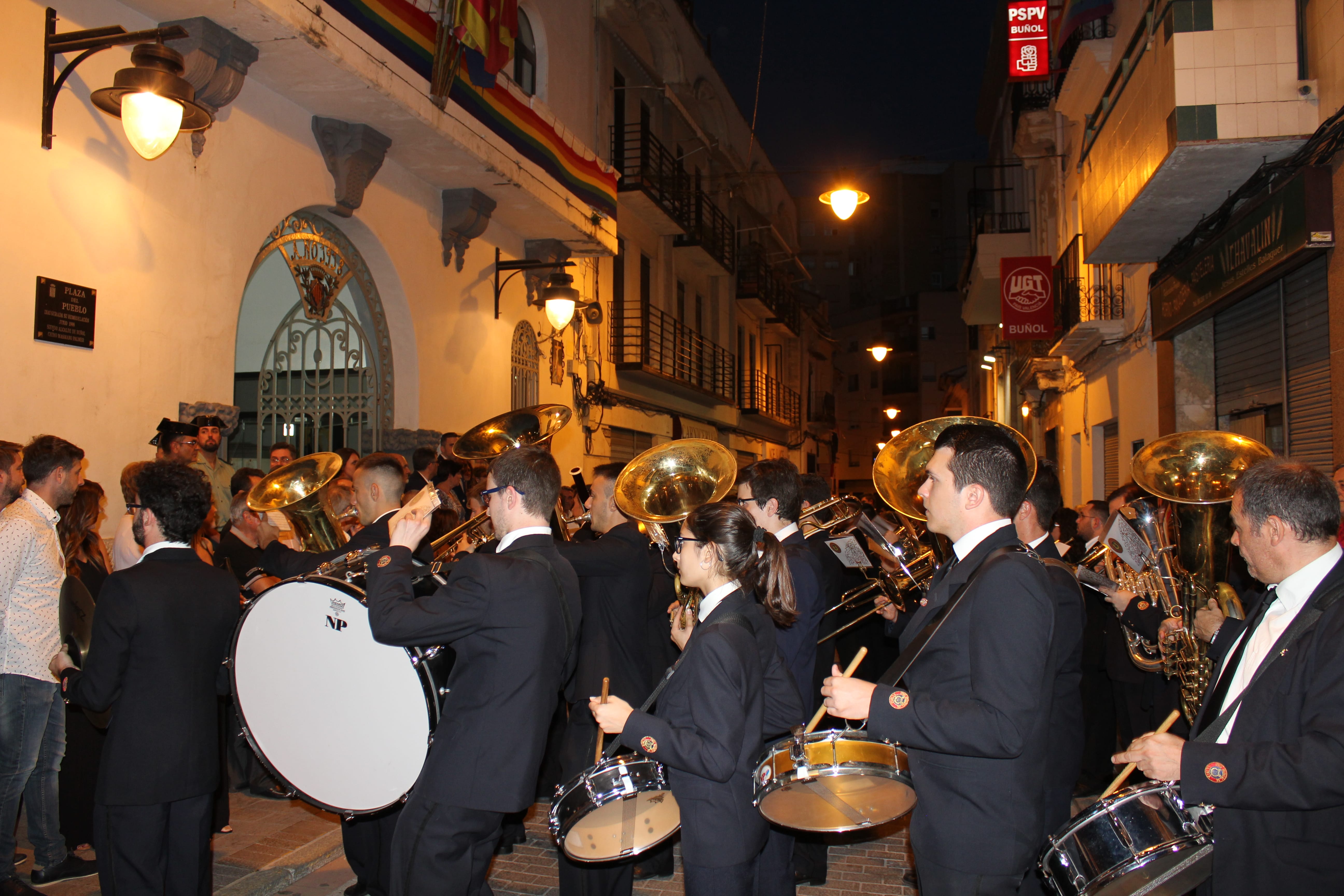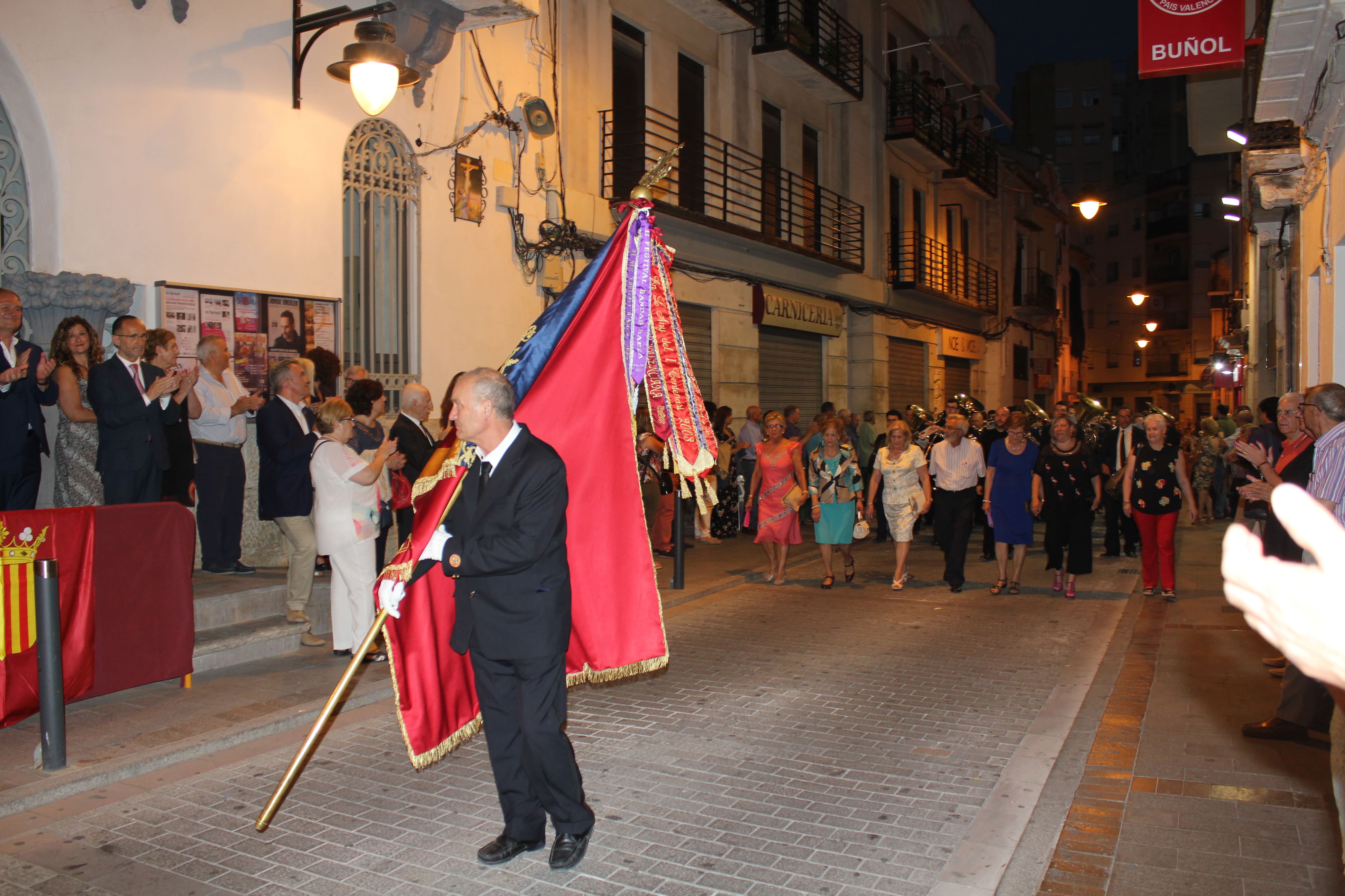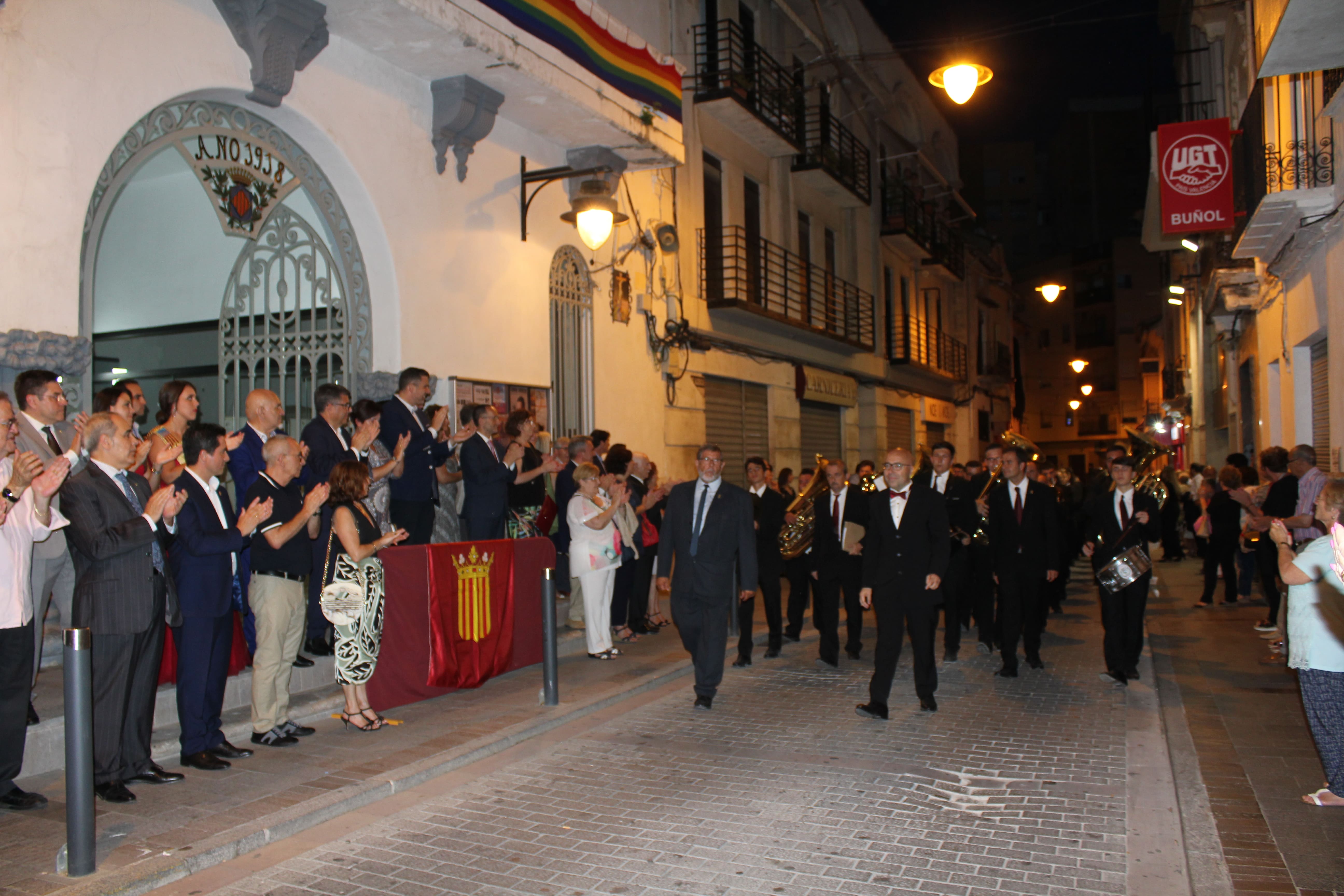 Después de ese acto protocolario, las autoridades se dirigieron a la Avenida de la Violeta desde la que partió el pasacalle de las tres bandas participantes en el concierto. Esta comitiva recorrió las calles de Buñol hasta llegar al Auditorio Municipal, donde a las 23h arrancó el concierto.