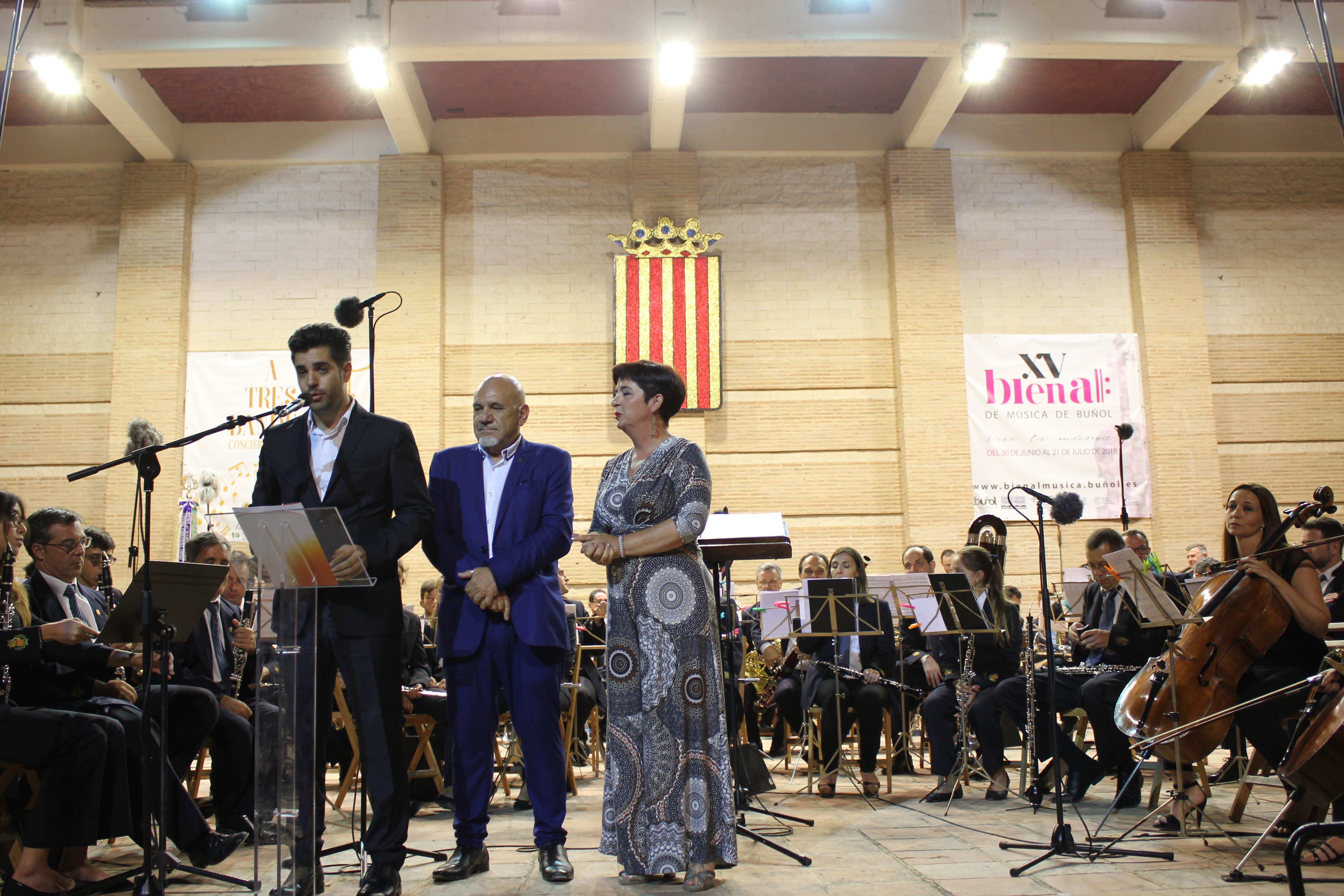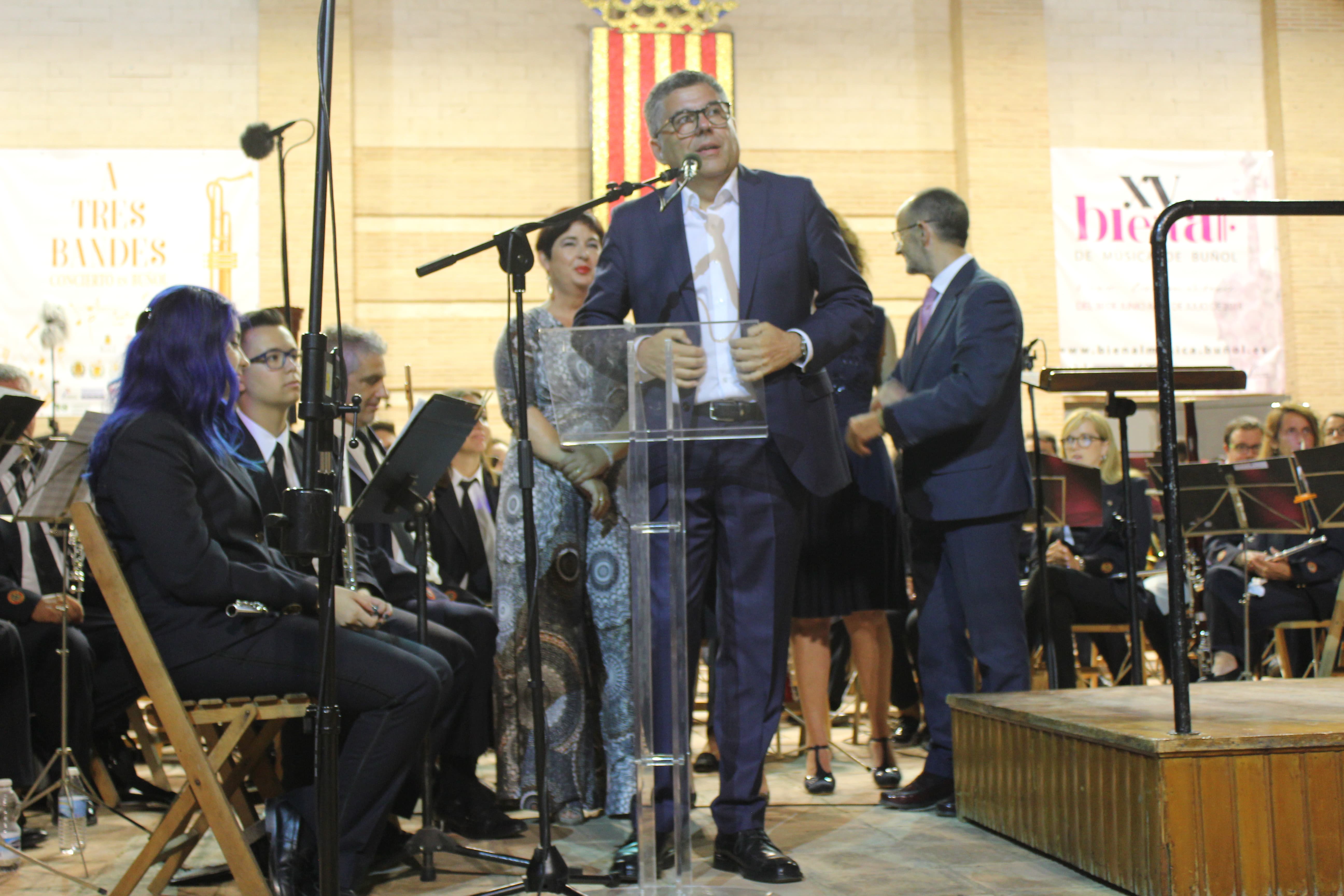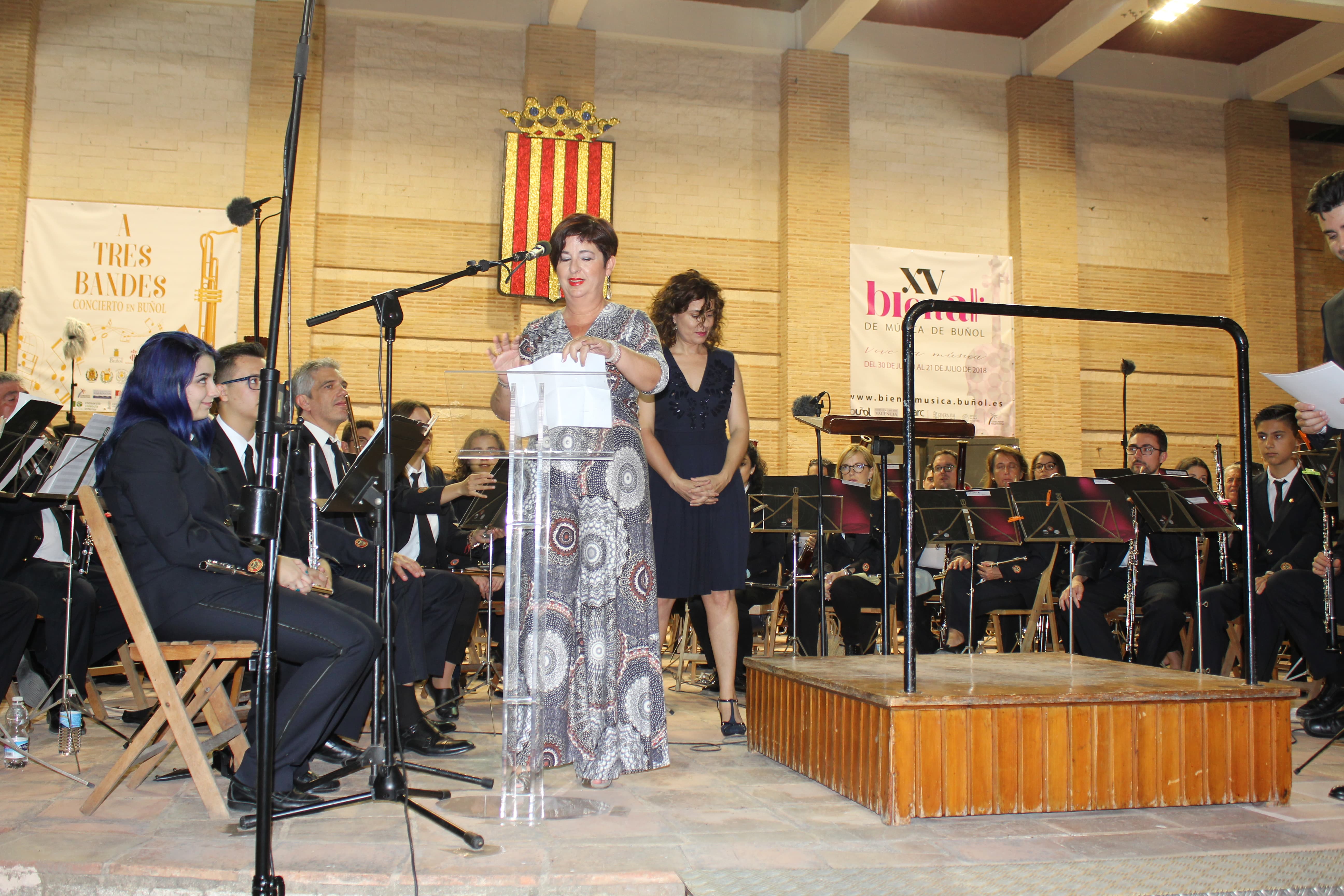 Antes de que los músicos de La Unió tocasen los primeros acordes, fue el momento de los parlamentos. La primera en hablar fue la Alcaldesa de Buñol, Juncal Carrascosa, que agradeció el gran apoyo de las instituciones valencianas y de los propios ayuntamientos a este proyecto «A Tres Bandes». Posteriormente, se dirigió al respetable la actual presidenta de la Asociación Buñol-Cullera-Llíria, Rosario Pardo, quien destacó la gran labor que han hecho todas las sociedades musicales en el seno de este proyecto que une a las seis mejores bandas de la Comunitat.