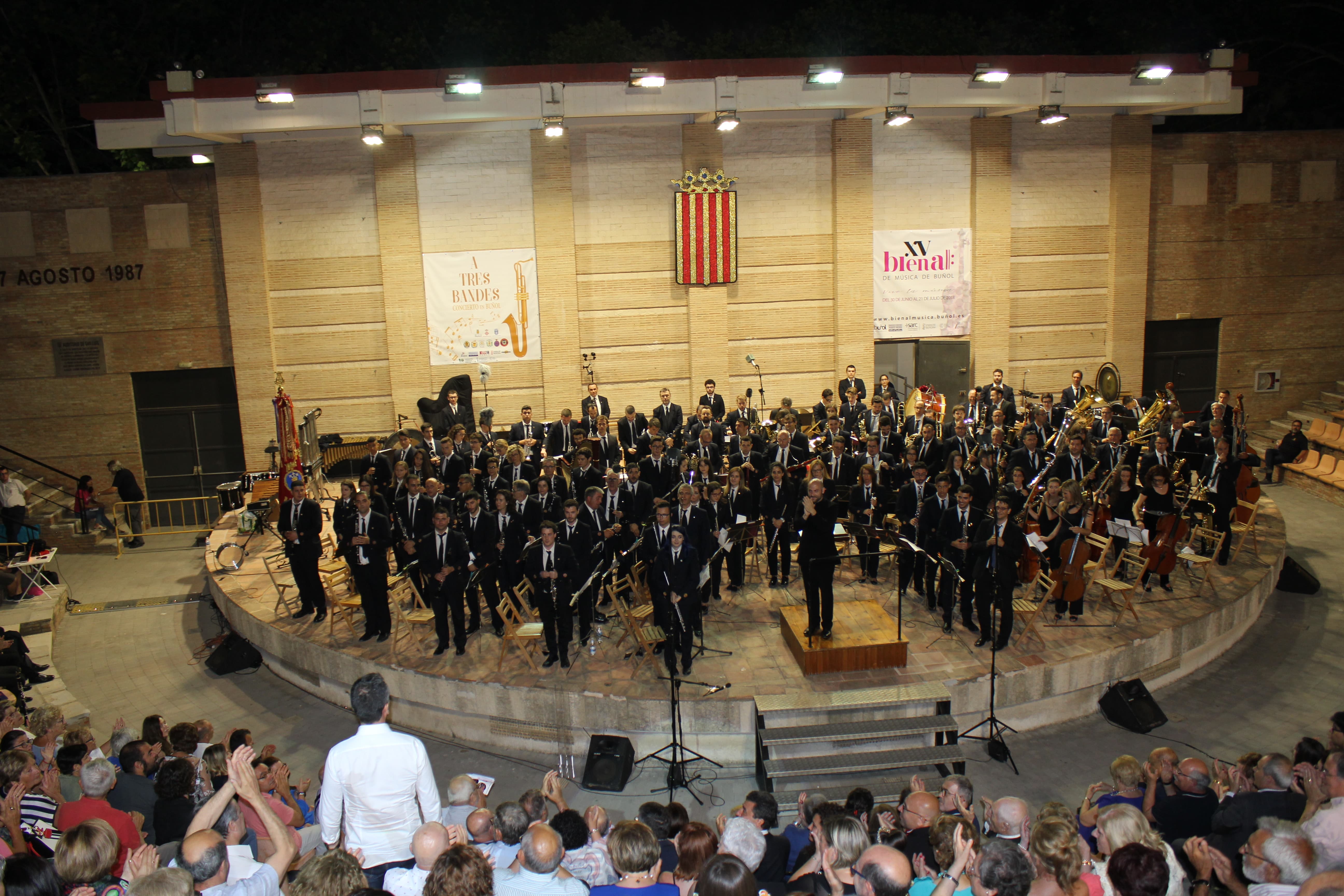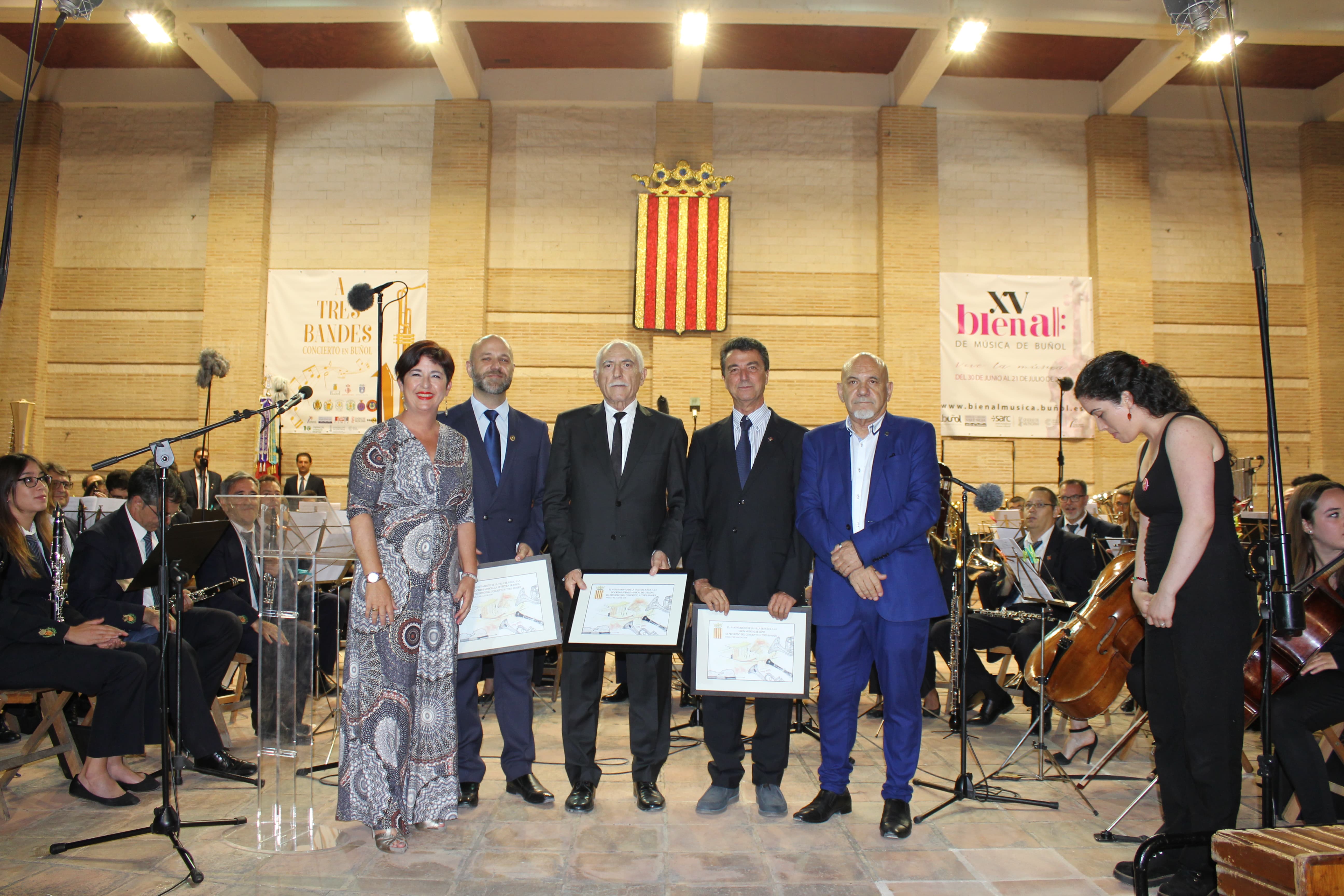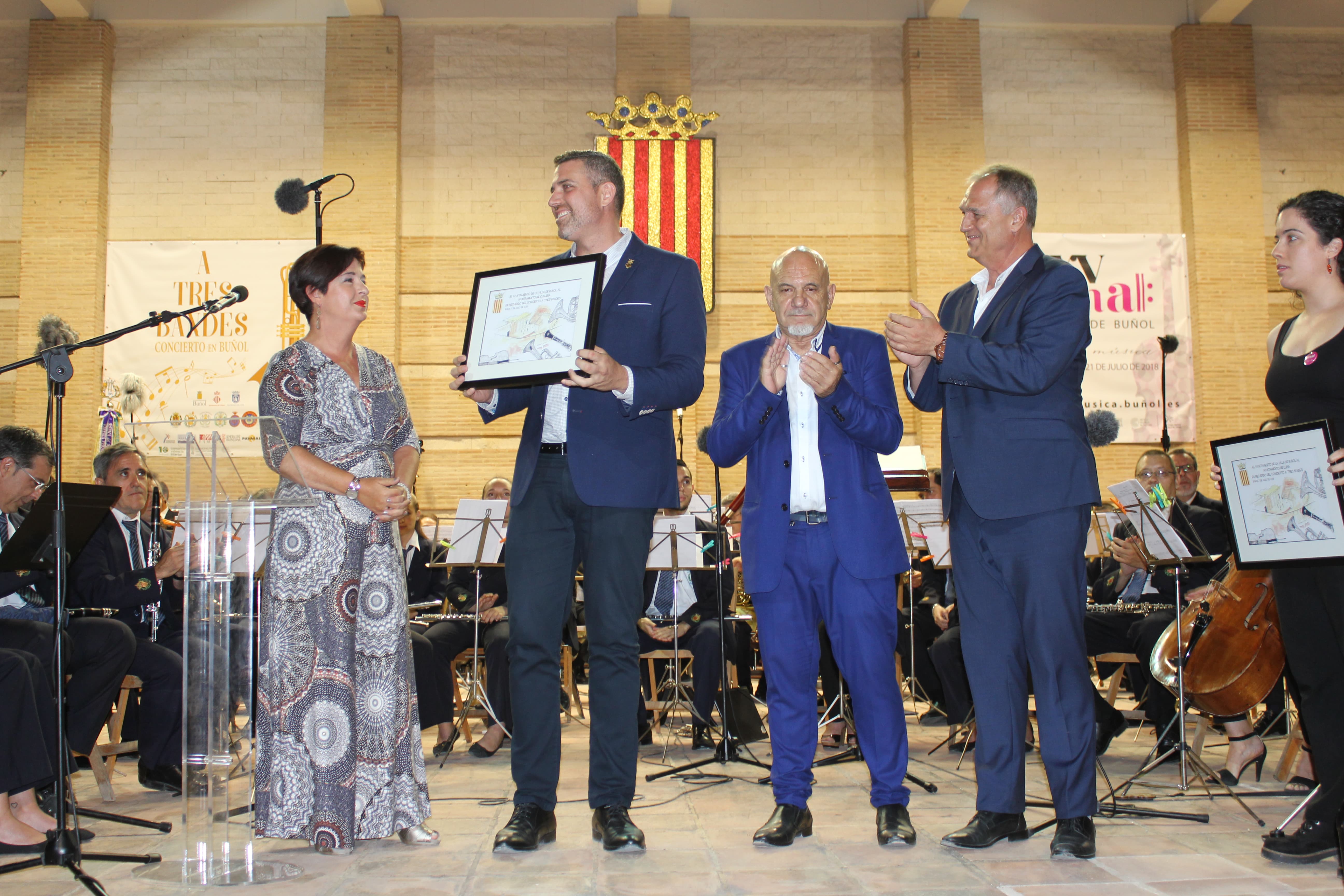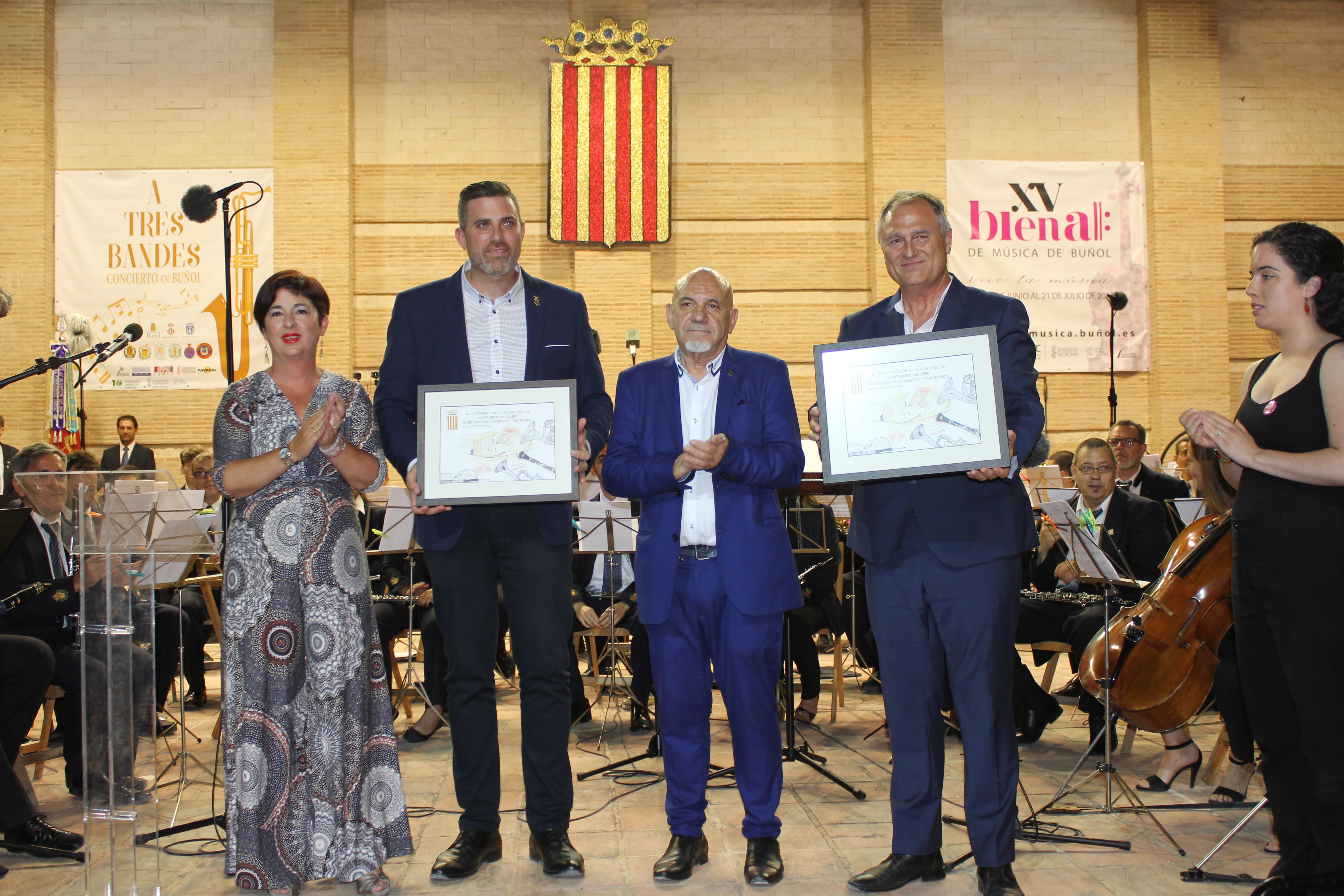 Redacción.- El proyecto «A Tres bandes» se consolidó en Buñol. El tercero de los encuentros de la Asociación Buñol-Cullera-Llíria tuvo como punto neurálgico la localidad buñolense, concretamente su Auditorio Municipal, en el que se pudo disfrutar de un gran espectáculo ofrecido por La Unió de Llíria, el Ateneo Musical de Cullera y «La Artística» de Buñol, que sirvió para inaugurar oficialmente la XV Bienal de Música de Buñol, organizada por la Concejalía de Cultura del Municipio.