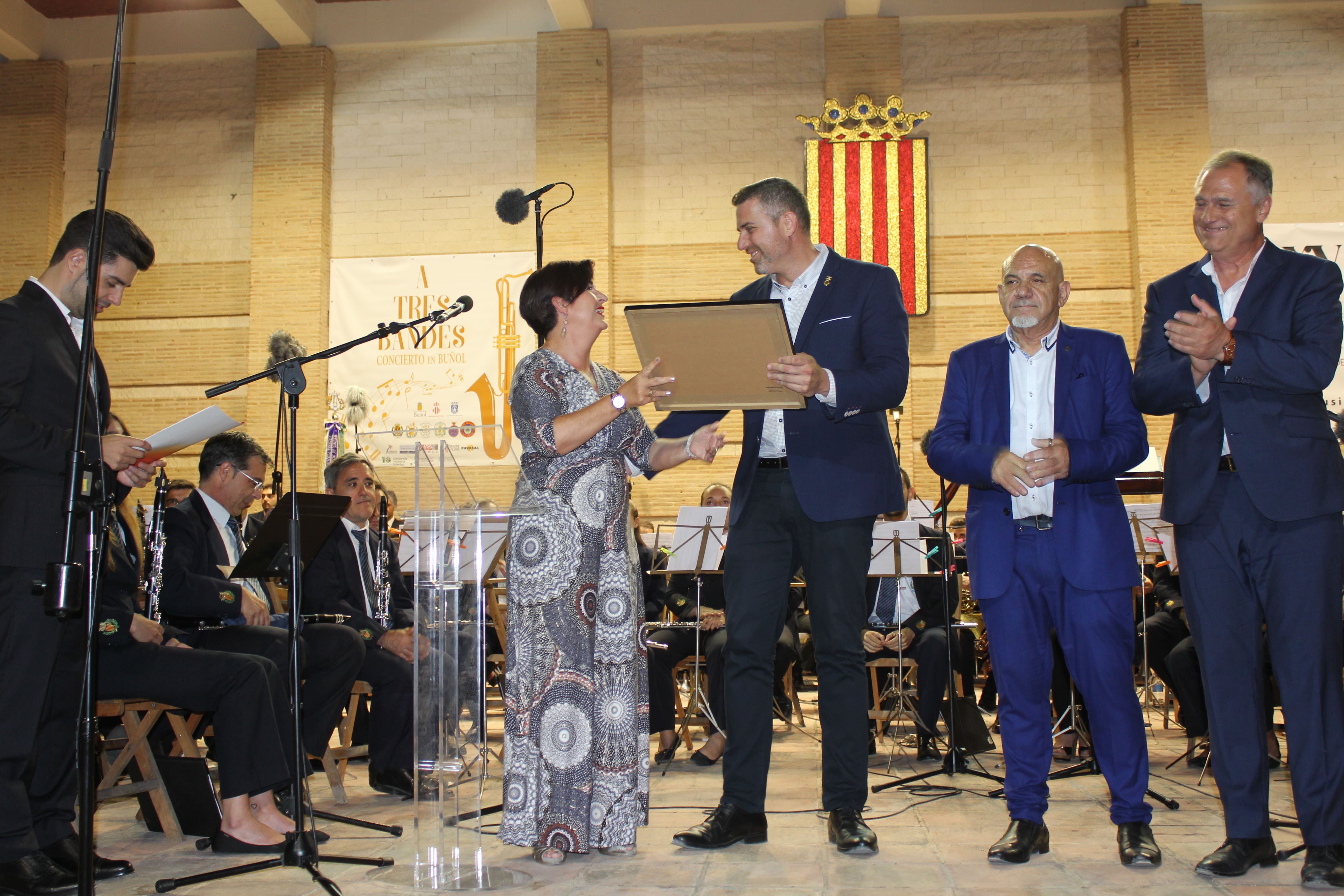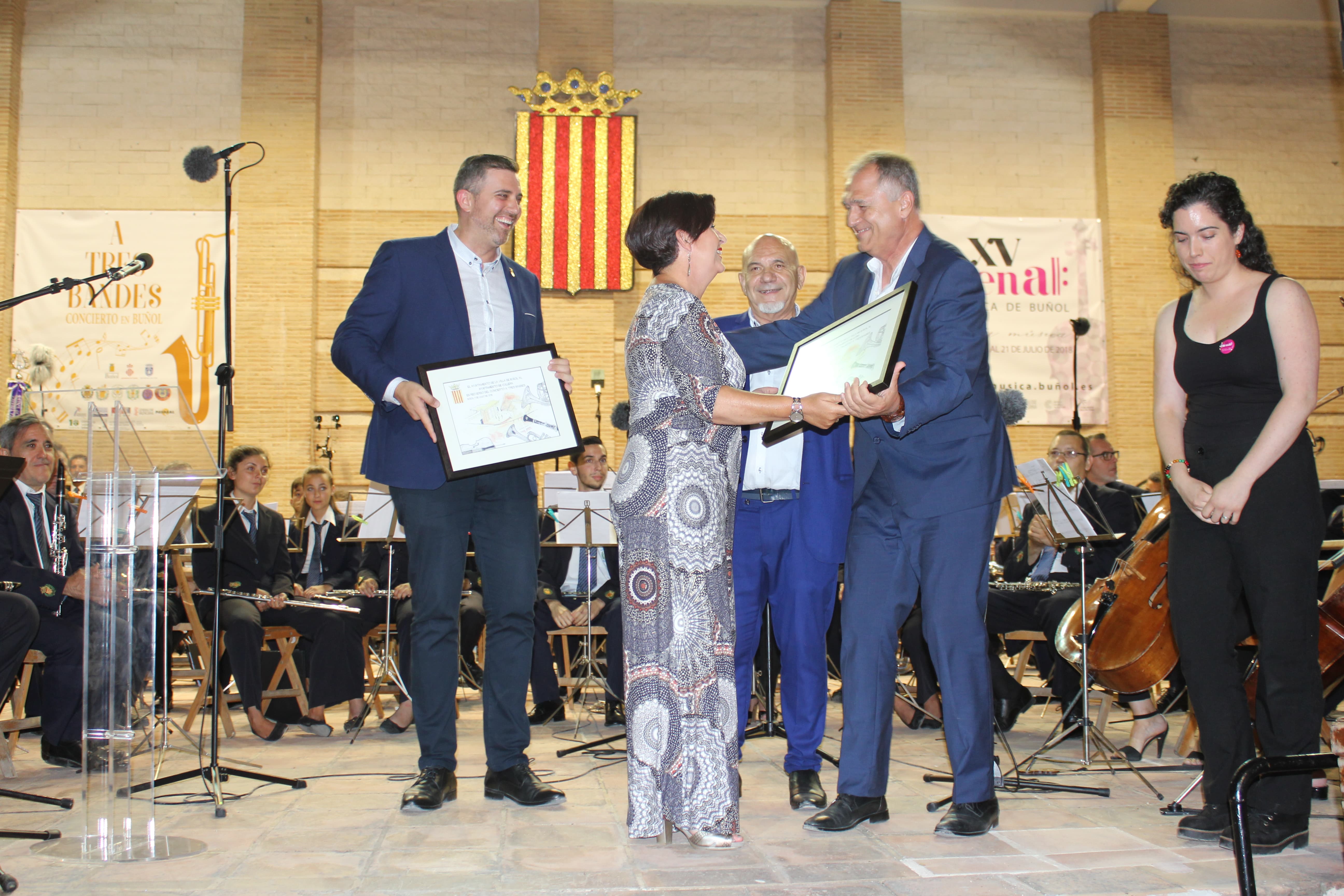 Una vez hecha la entrega de presentes, de nuevo la música. Y la puso «La Artística» con el pasodoble, El Gato Montés de Manuel Penella y On The Waterfront, de Leonard Bernstein, que levantó los aplausos del numeroso público allí presente. Además, «Lo Feos» pusieron la guinda al concierto «A Tres Bandes» con la interpretación del Himno a Buñol, de Guzmán Cárcel y el maestro Chillida.