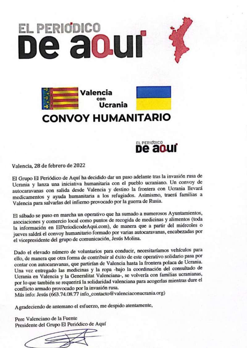 Redacción.- El primer convoy humanitario impulsado por El Periódico de Aquí con ropa, medicamentos y comida para el pueblo ucraniano parte de la Plaza de Manises de Valencia mañana miércoles. Una treintena de Ayuntamientos, entre los que se encuentra el Ayuntamiento de Buñol, comercios locales, asociaciones y empresas ya se han sumado a esta causa solidaria, que traerá familias de Ucrania del infierno provocado por la invasión de Rusia. El Grupo El Periódico de Aquí decidió el pasado viernes dar un paso adelante tras la invasión rusa de Ucrania y lanzar una iniciativa humanitaria con el pueblo ucraniano. Un convoy de autocaravanas y furgonetas con salida desde Valencia y destino la frontera con Ucrania llevará medicamentos y ayuda humanitaria a los refugiados. Asimismo, traerá familias a Valencia para salvarlas del infierno provocado por la guerra de Rusia y para su acogida, »padres e hijos juntos para que no se produzca más dolor ni desarraigo familiar», como ha explicado el vicepresidente del grupo de comunicación, Jesús Molina, quien encabezará esta iniciativa. Molina acaba de ser nombrado por el cónsul de Ucrania en Valencia, coordinador de desplazamientos dentro de un grupo que está creando con la Generalitat Valenciana.