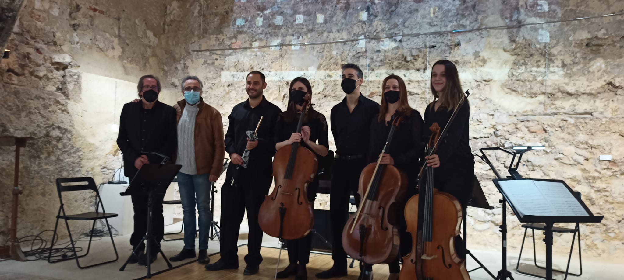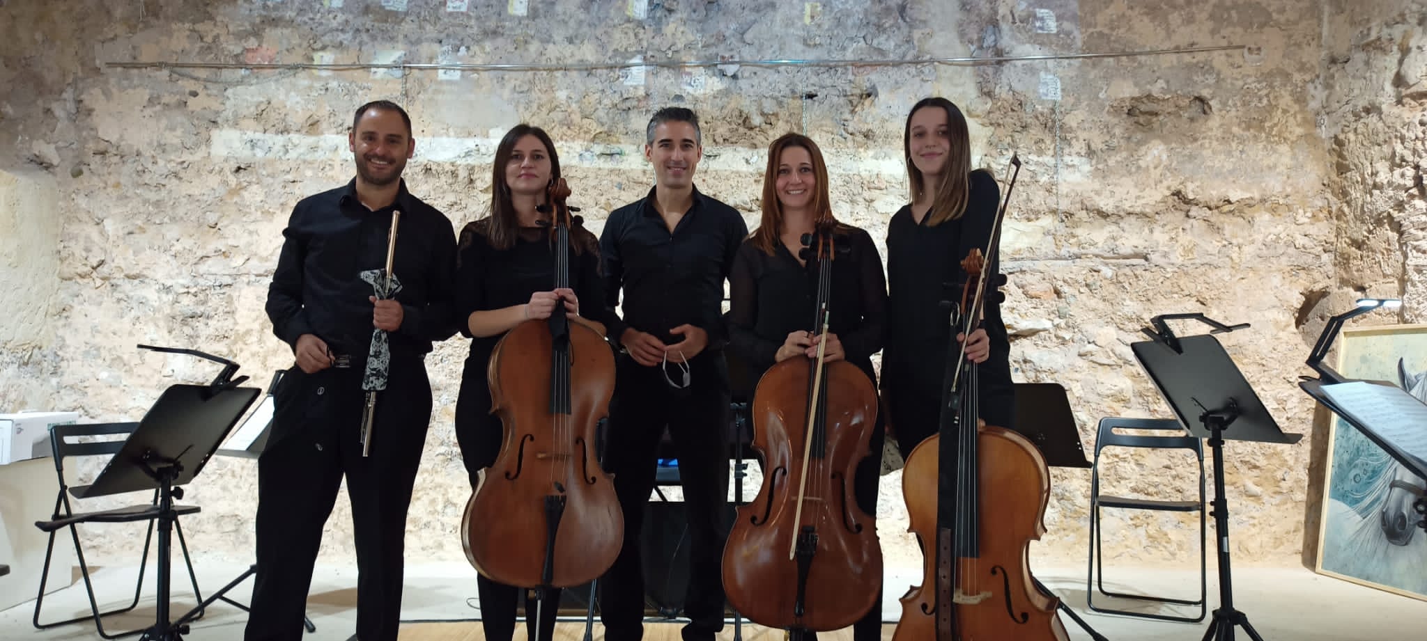 Un quinteto compuesto por 4 violonchellos, un piano y una flauta, al frente Manuel Carrascosa Pérez, inspirándose en paisajes de Canadá, nos hizo disfrutar de «Canadian Portraits». Diez movimientos en la «Sala del Oscurico», al ritmo de imágenes de paisajes proyectadas, melodías relajantes y al mismo tiempo nostálgicas.