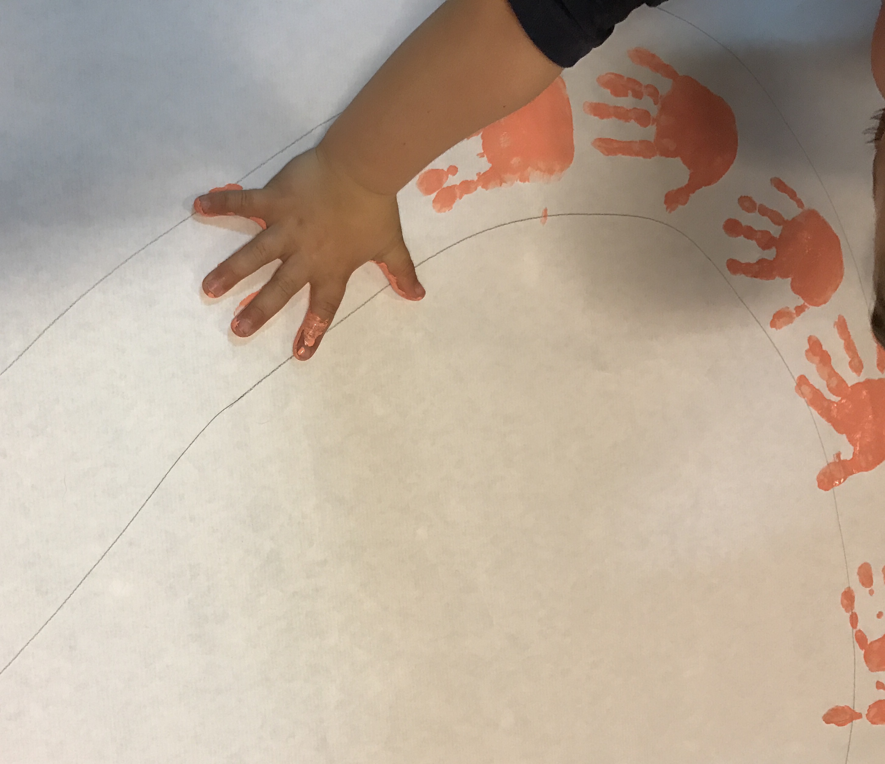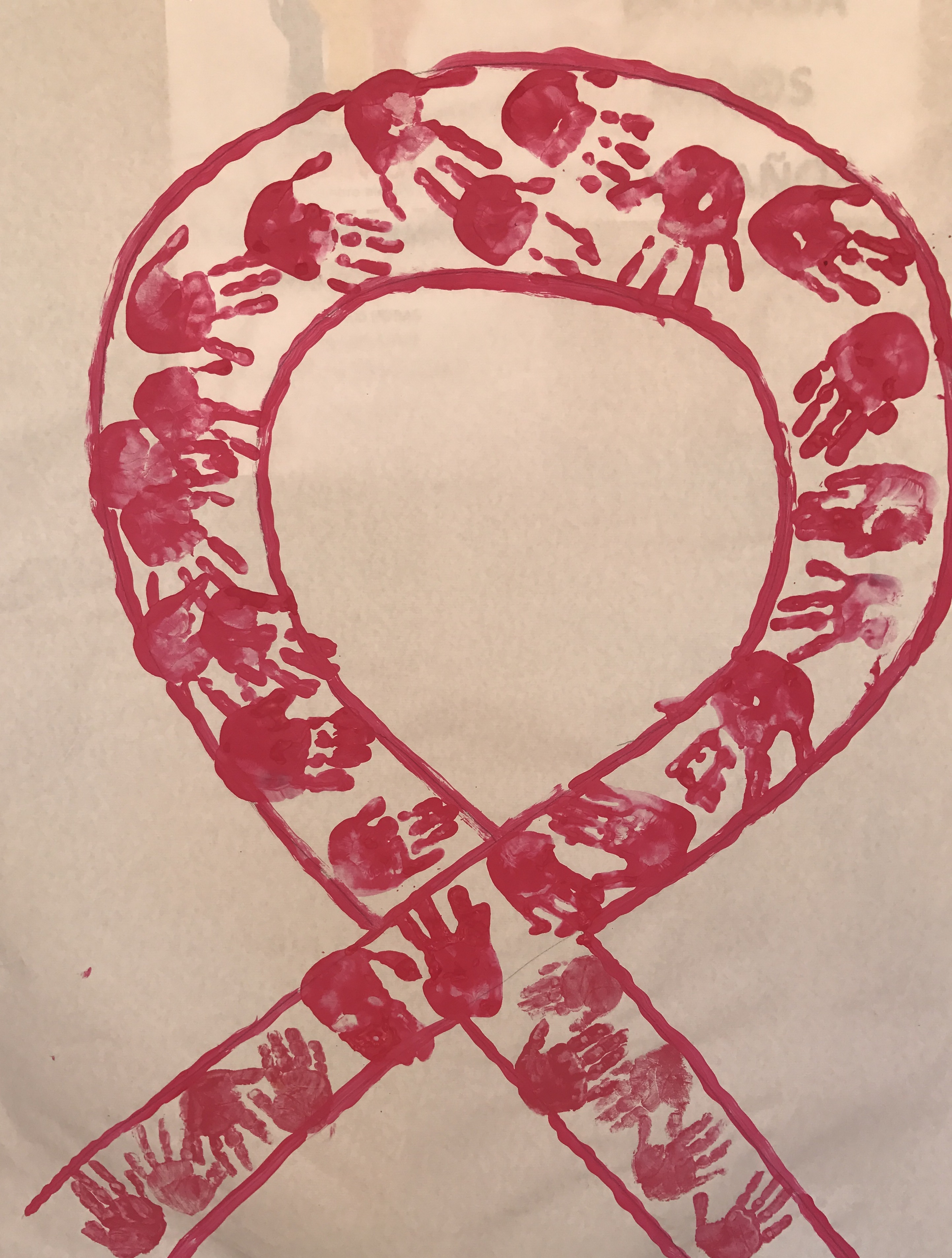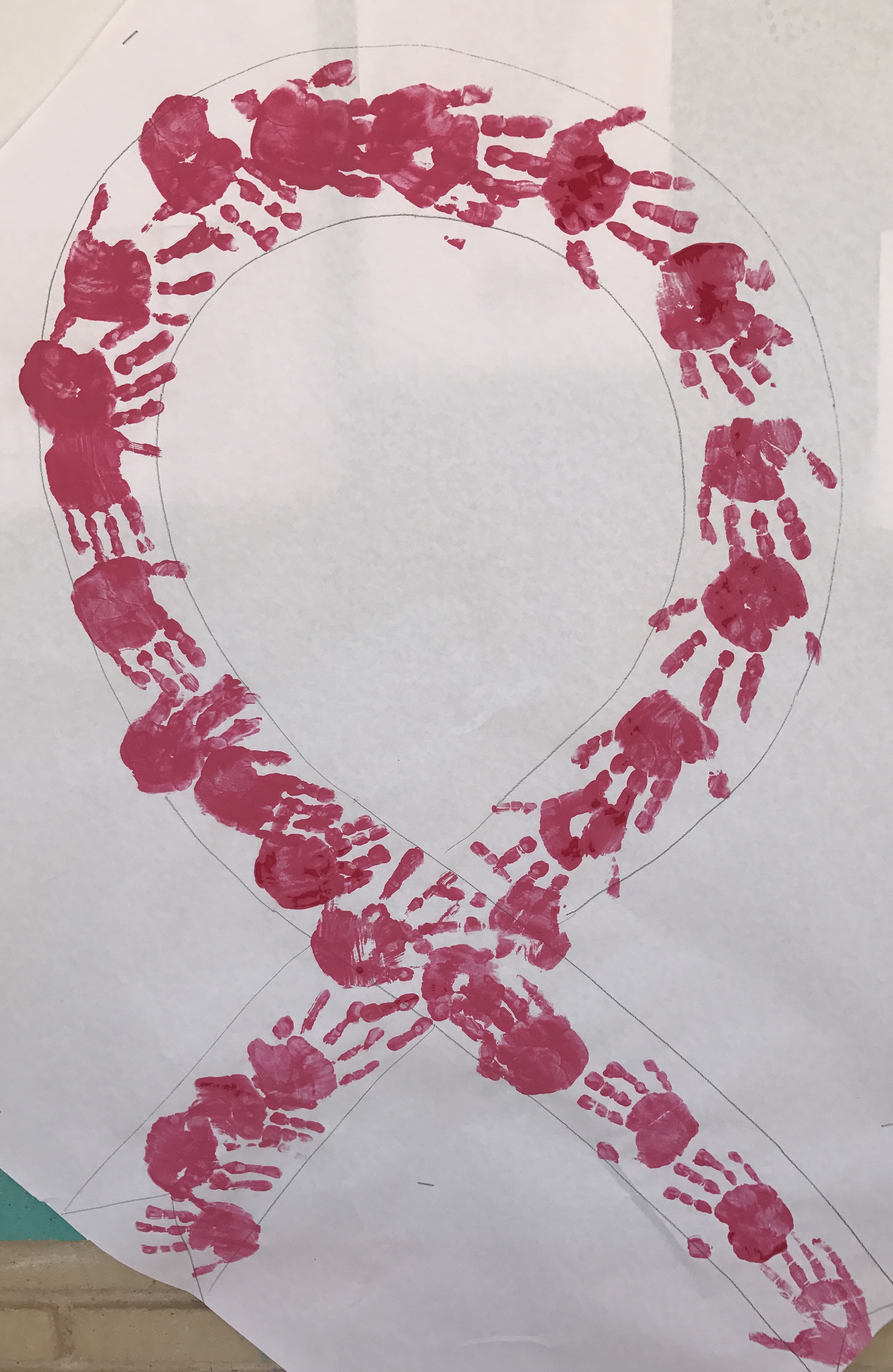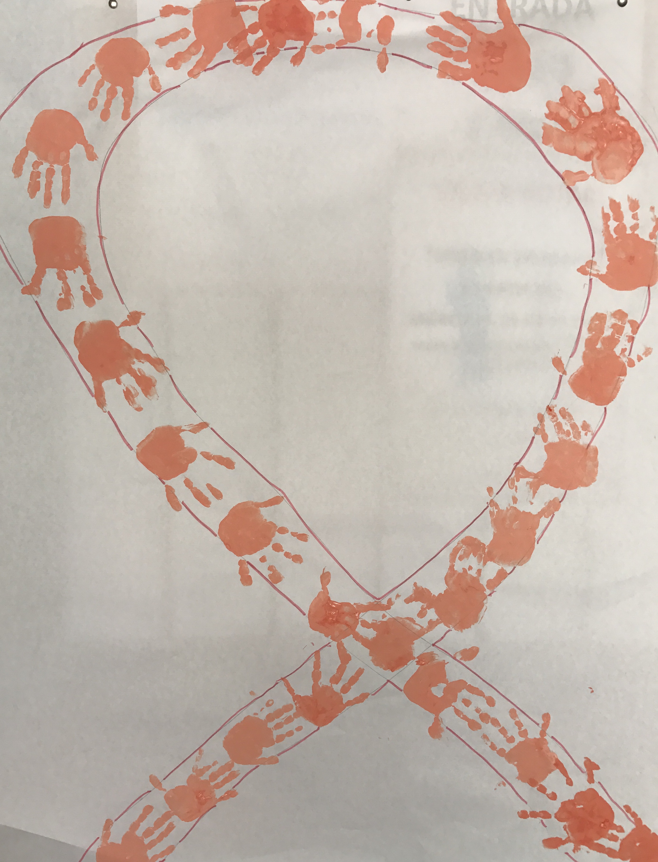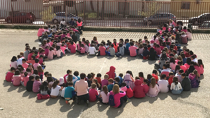 Todo el alumnado, desde primero hasta sexto de primaria, junto con sus profesores y profesoras, vestidos con colores rosados, formaron en el patio un gran lazo. Por su parte, los más pequeños del colegio estamparon sus manos en unos lazos que adornaron las entradas del aulario de infantil.