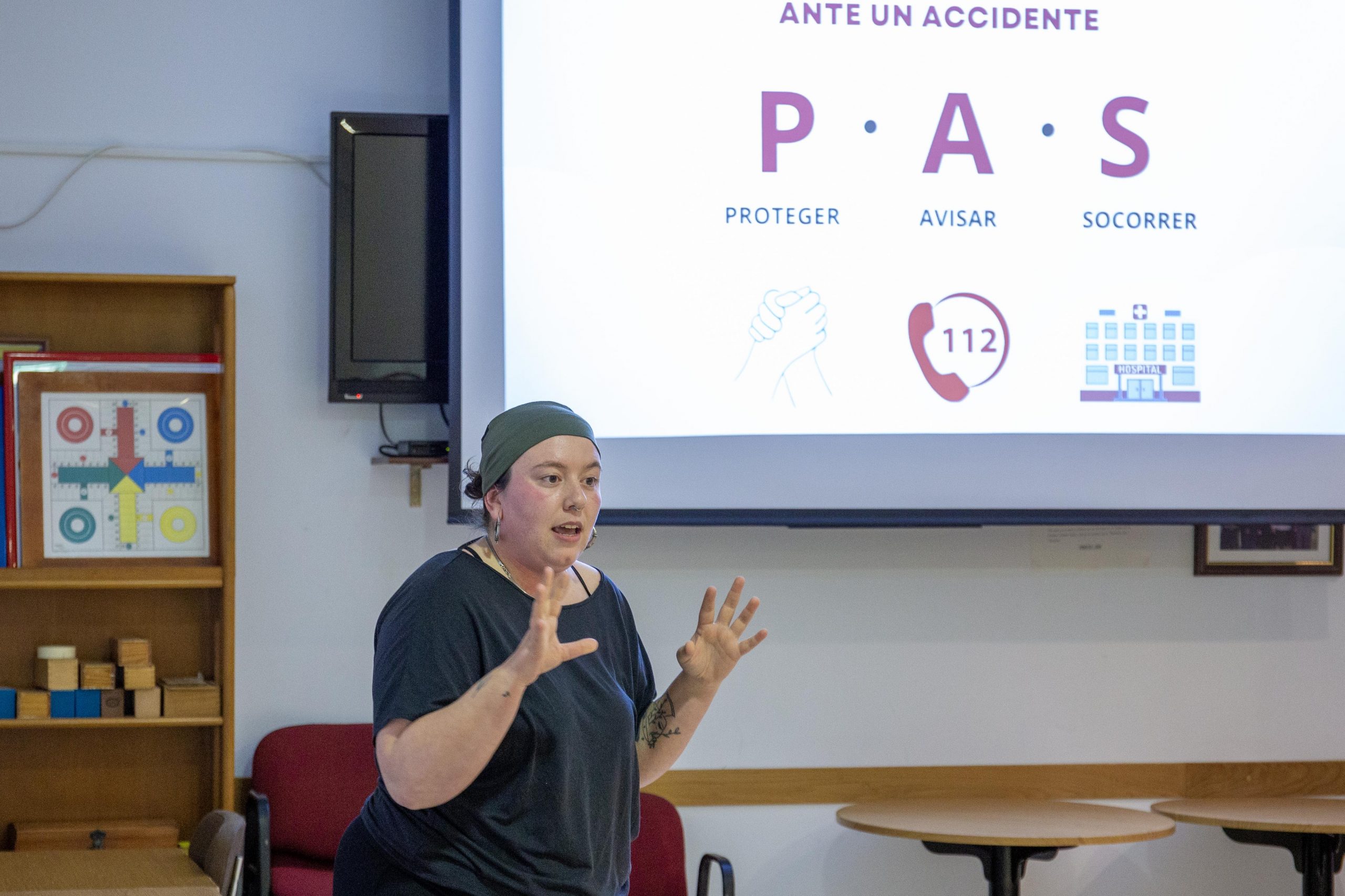 La experta comenzó la charla explicando la regla fundamental a seguir ante un accidente, que responde a las siglas de PAS: Proteger, Avisar y Socorrer. “Lo más importante en un contexto de emergencia es que, antes de poder ayudar a cualquier persona, lo primero que tenemos que hacer es protegernos a nosotros mismos, evaluar el contexto y saber si podemos ayudar o no, si nos ponemos en riesgo; lo segundo que tenemos que hacer es avisar al 112, y el tercer paso sería ya socorrer a la persona que tenemos delante”, explicaba Fora. “Lo que necesita saber el 112 cuando llamamos es qué ha pasado, cómo está la persona y dónde estamos, para que puedan venir a socorrernos”.