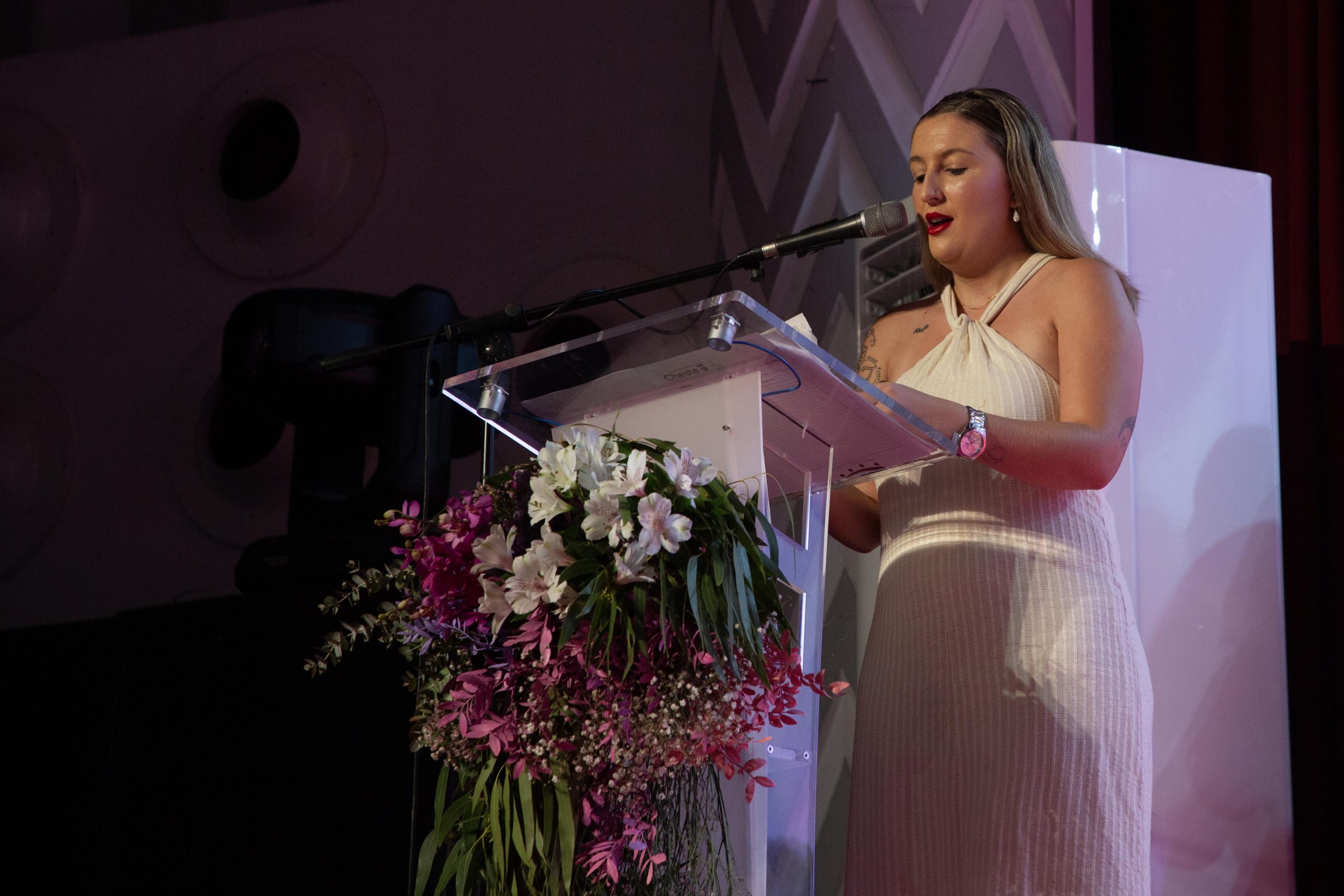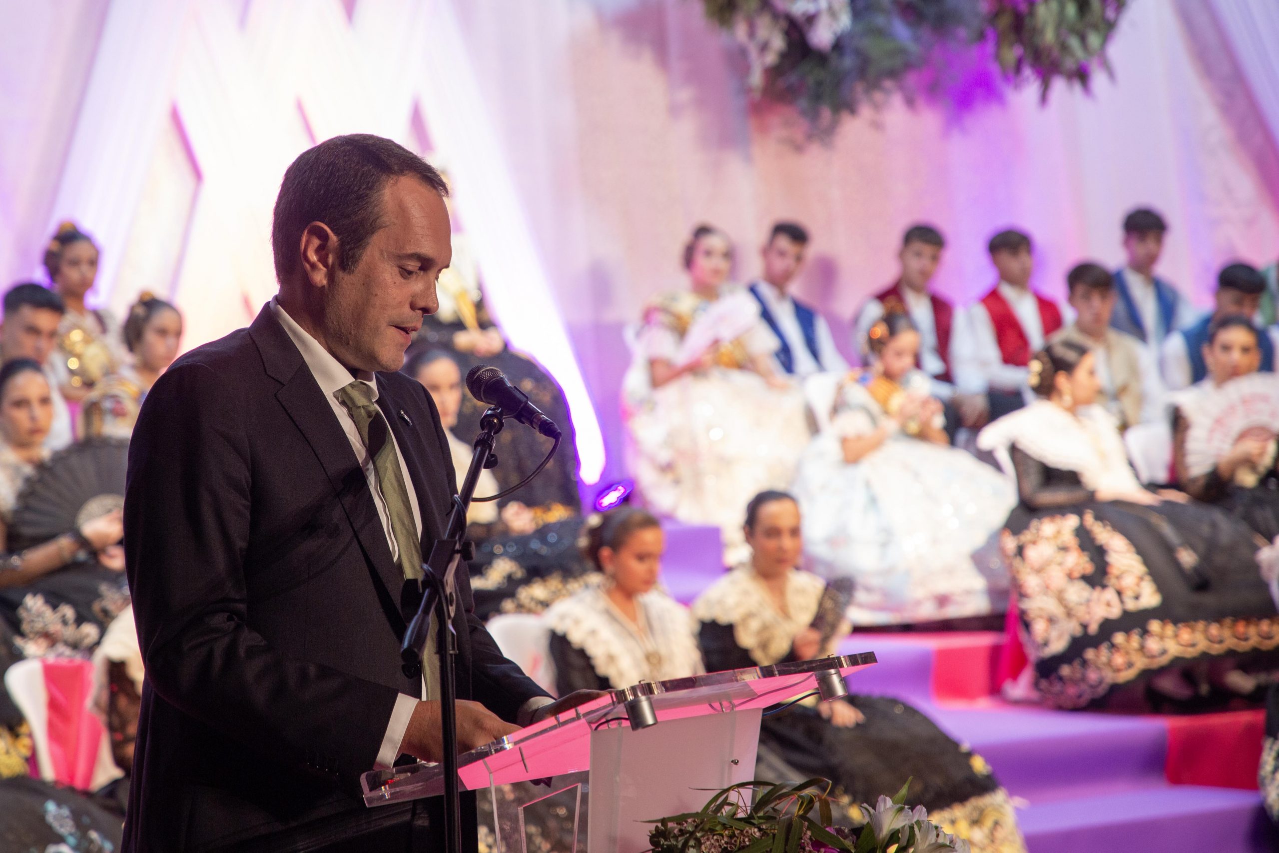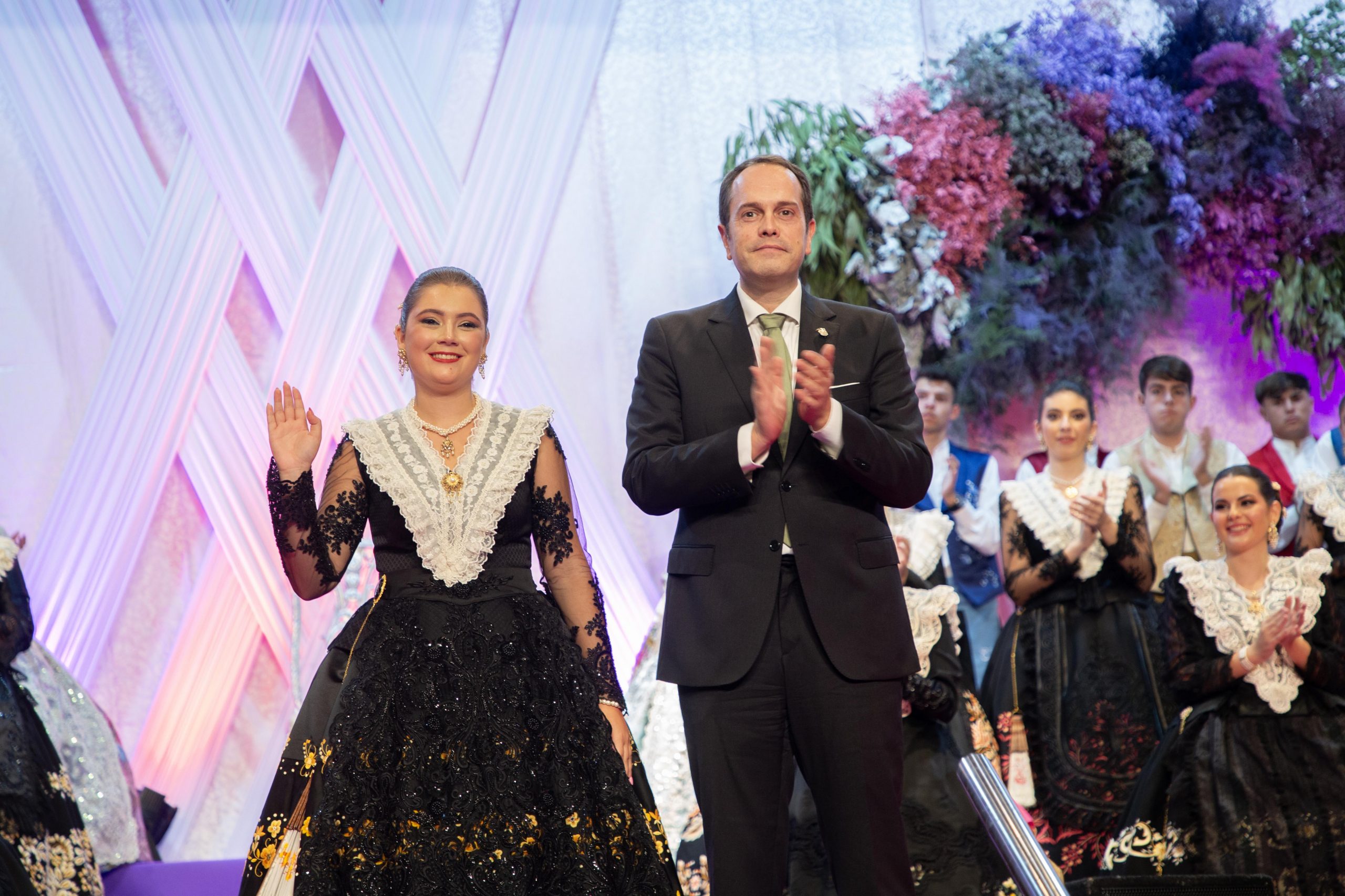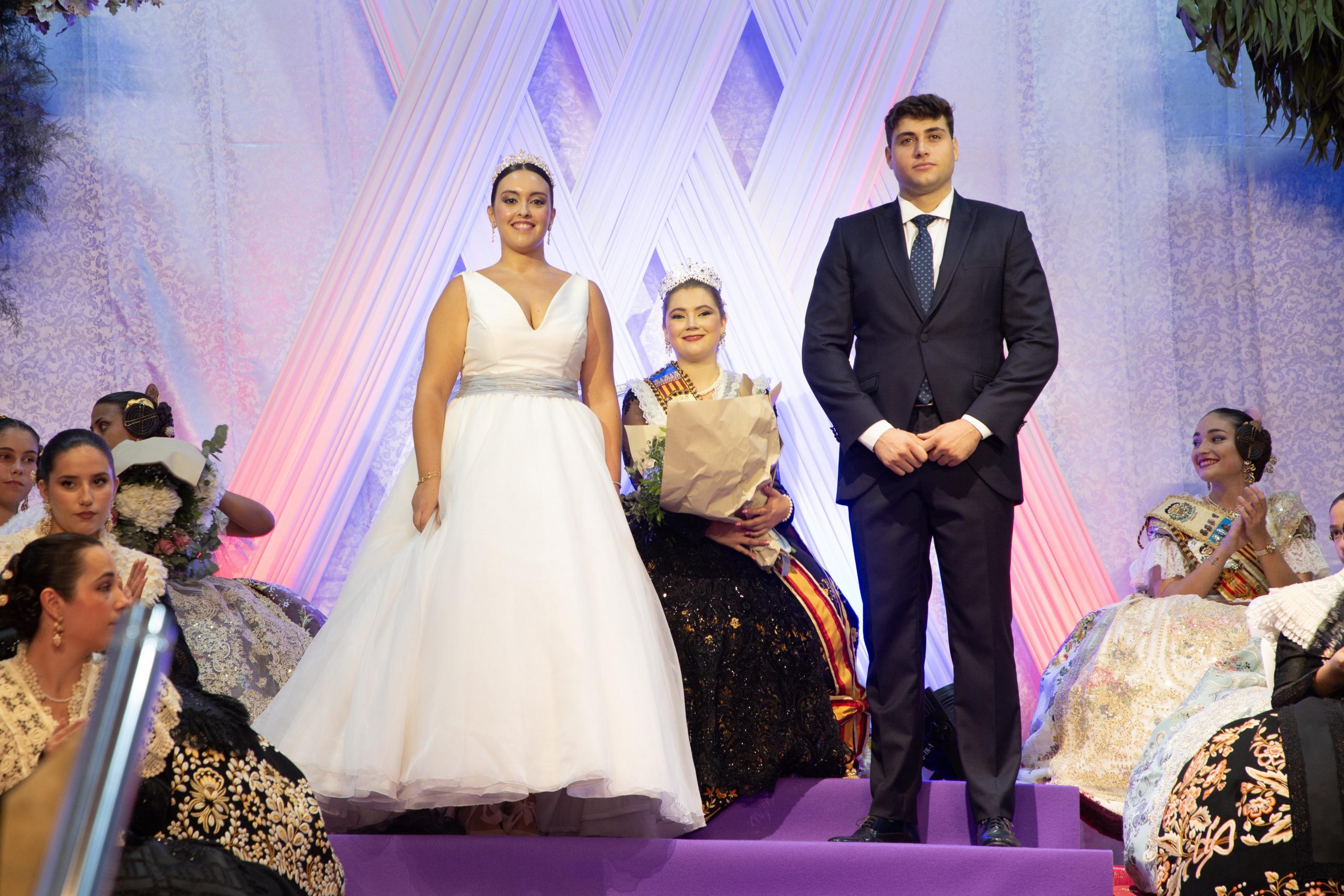 Los representantes de las Fallas locales, la Junta Local Fallera y de los Clavarios 2025 subieron al escenario también para ofrecer sus ramos de flores y sus obsequios a Rocío Toledano Horta y, ya entrando en la recta final del acto, en un momento muy emotivo, los abuelos de las reina le hicieron entrega de una cesta floral y su madre le dedicó unas cálidas palabras, leídas en su nombre por Lucía Sánchez García.