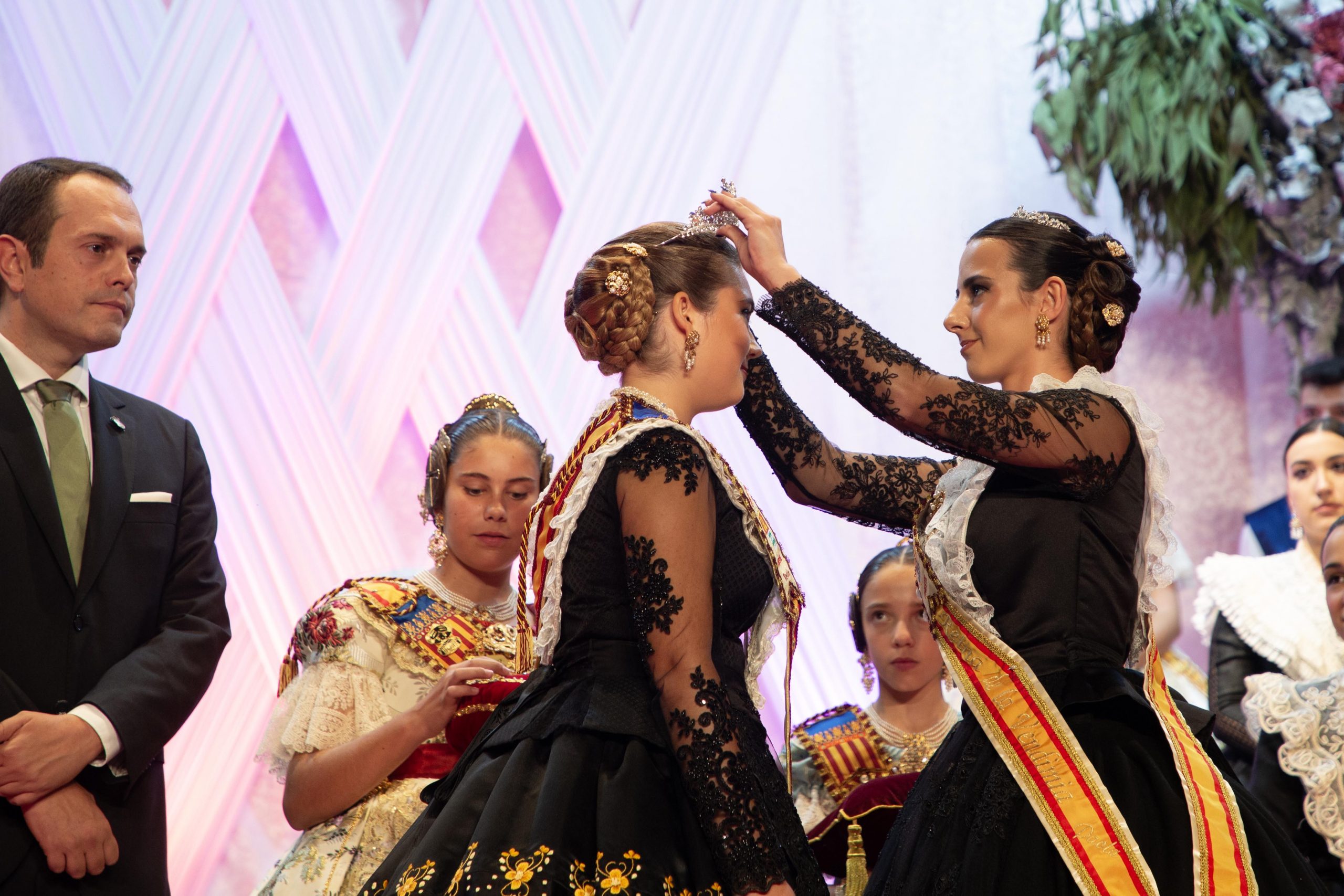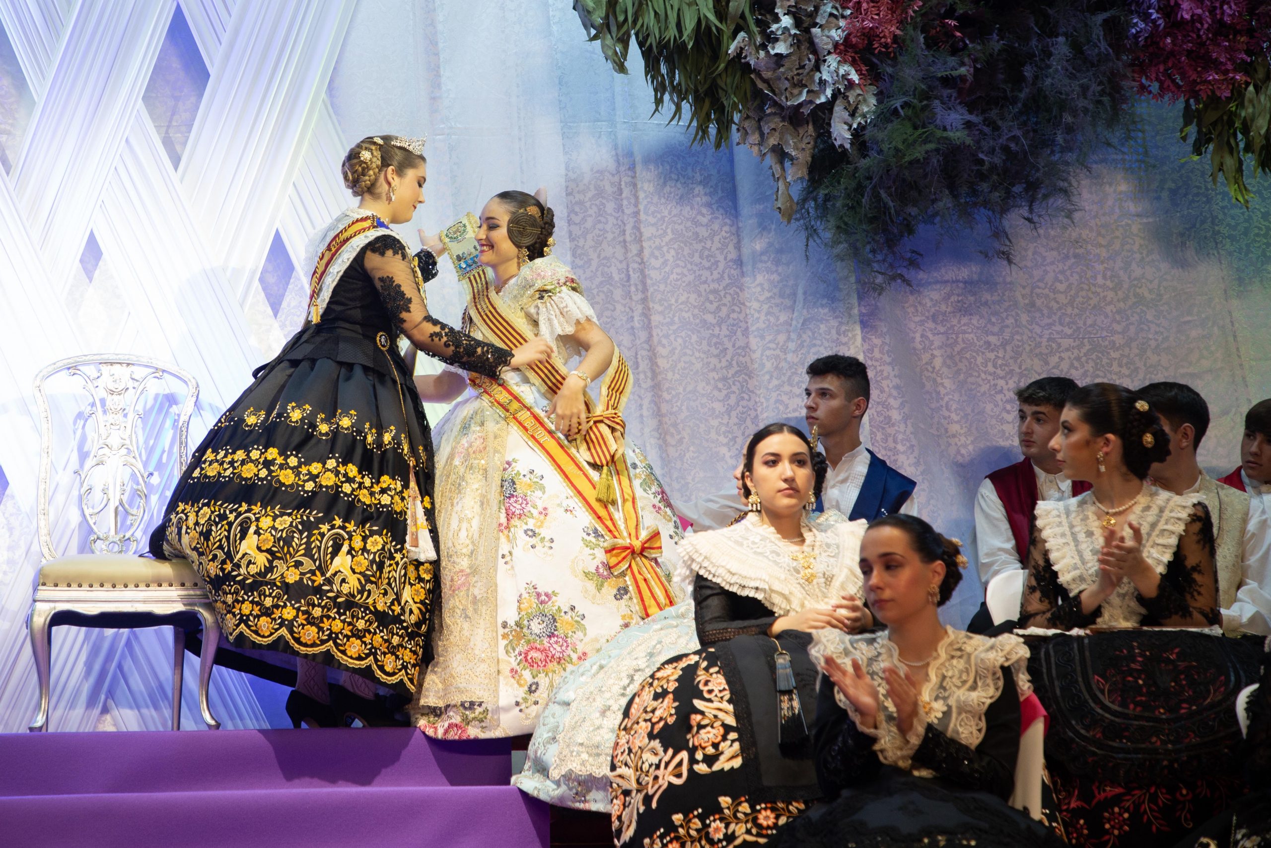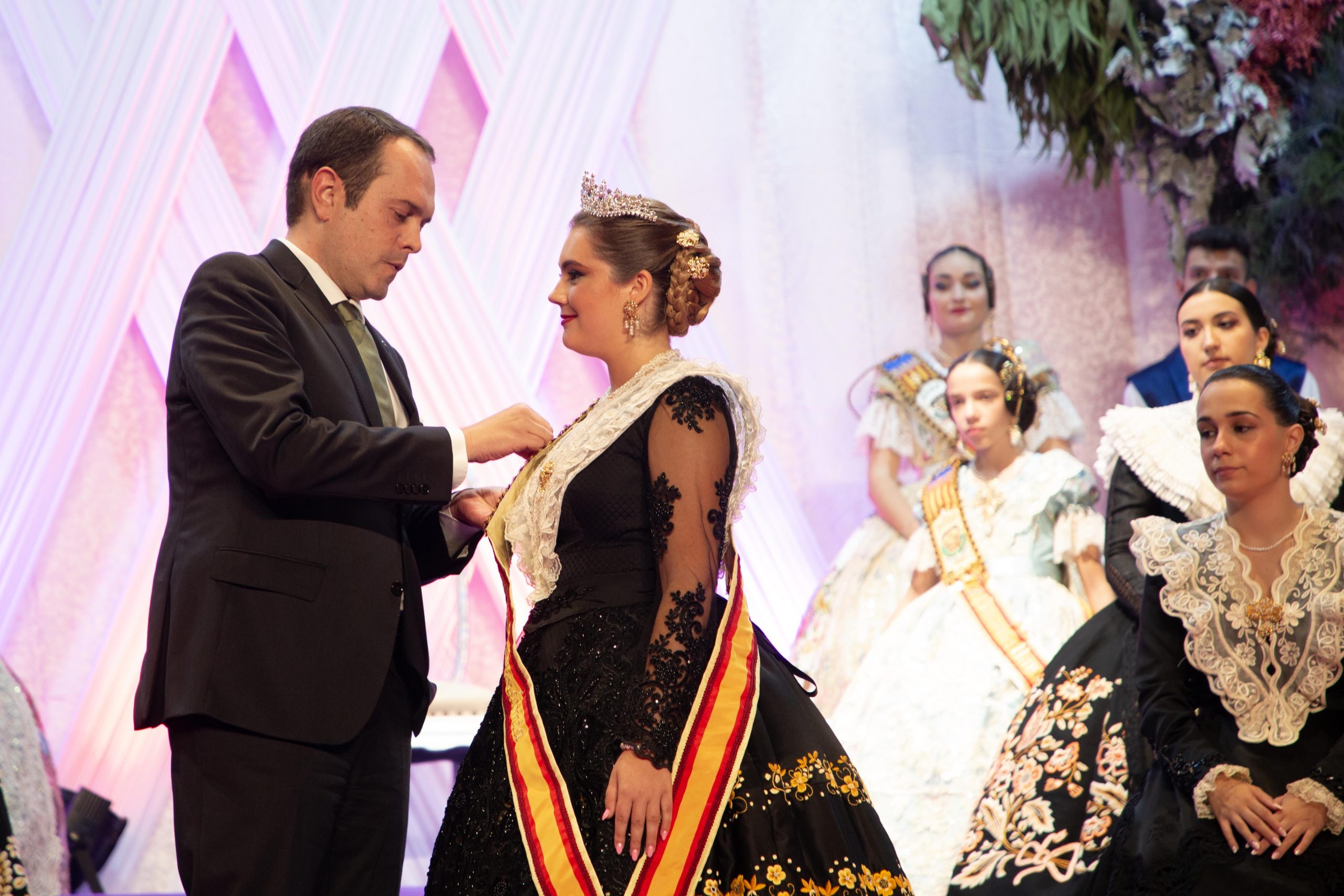 La nueva reina, ya en el ejercicio de su mandato, impuso las bandas a sus damas de honor, las falleras mayores de las dos fallas, Ángela García Pérez, por parte del Barrio de La Alegría, y Ana Ruíz Domingo, por parte del Barrio Industria y Comercio.