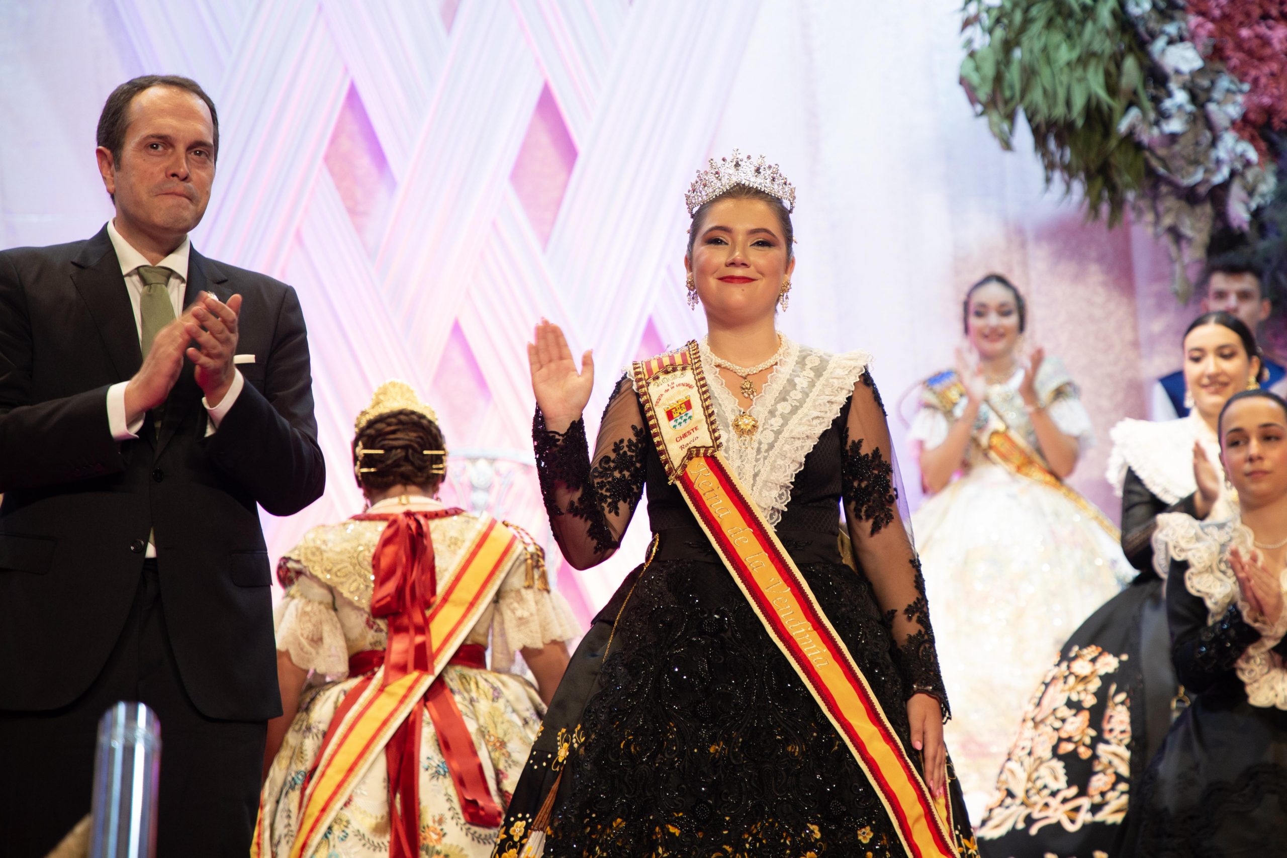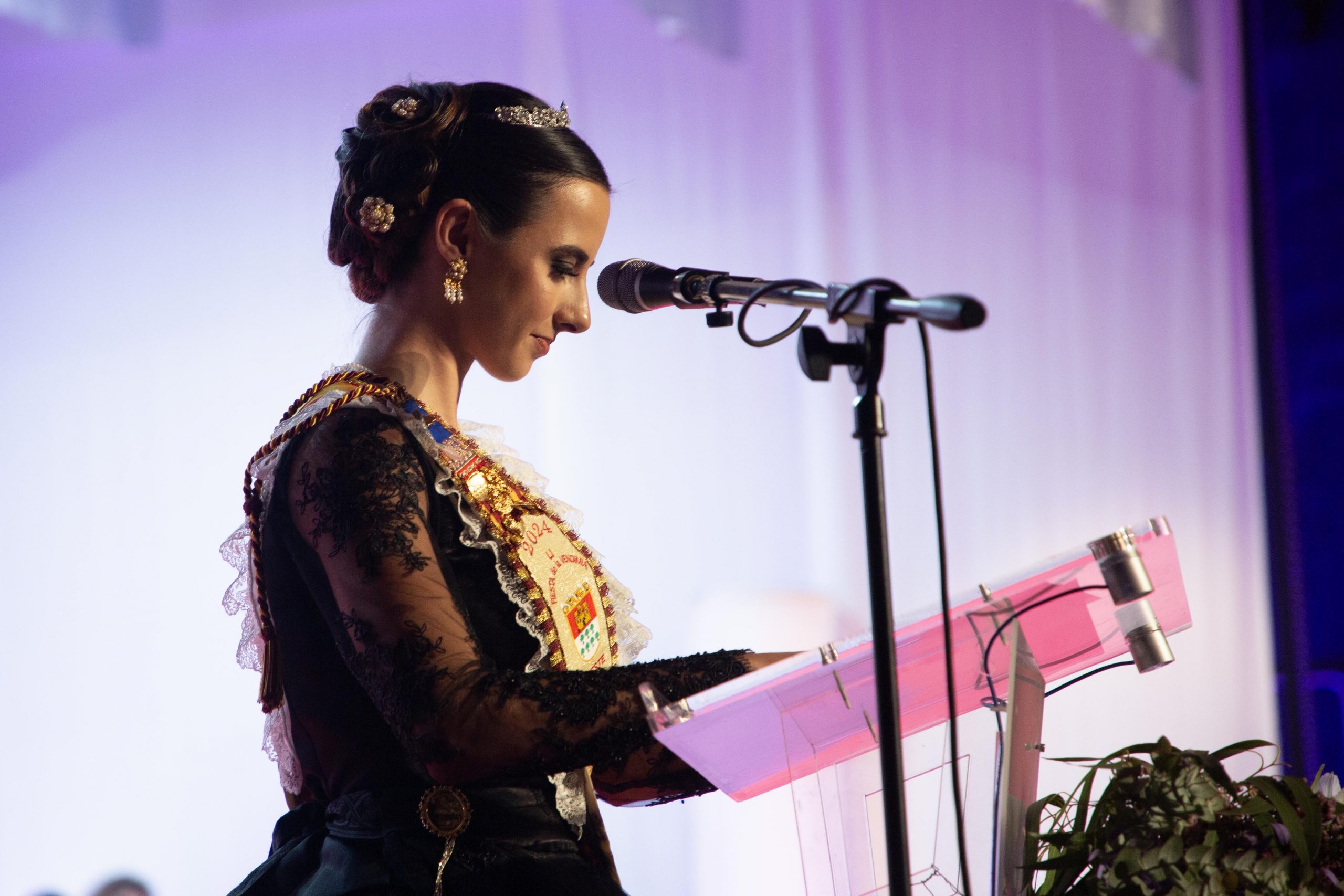 La reina saliente se despidió de su reinado ofreciendo un sentido agradecimiento a la población y deseando unas fiestas llenas de alegría a Rocío y recibió un ramo por parte del concejal de Fiestas, Óscar Galdón. Después del discurso se reconoció a las reinas de hace 50, 25 y 10 años, Carmen Balaguer Haro, Patricia Sánchez Zapater y Paula Aroca Verduch, respectivamente, que desfilaron hasta el escenario y ocupar su sitio en el trono.