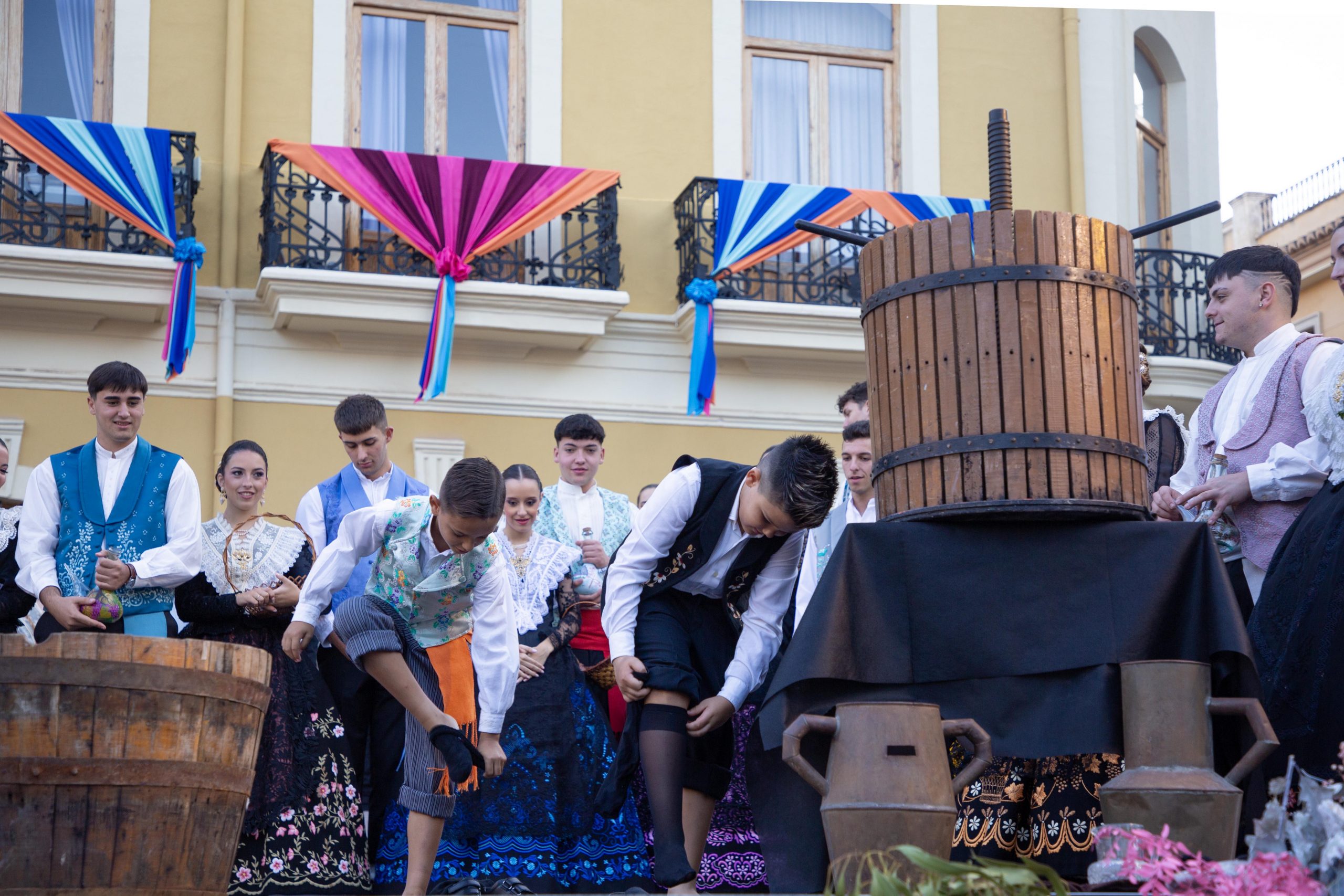 Tras la actuación, los conductores del acto, Óscar Bayo Gisbert y Bárbara de Lacruz Morell fueron llamando al escenario a todas las parejas de Vendimia 2025, que desfilaron por el escenario para depositar sus uvas en una prensa antigua. Los niños Eric Gamundi Linares y Sergio Molina García, pisaron la uva y la reina fue la encargada de recoger el mosto en una jarra, que posteriormente se ofrecería al patrón de Cheste, San Lucas Evangelista, en la Iglesia.