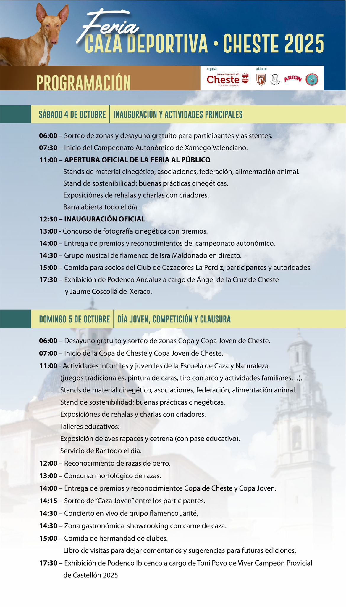 El programa completo se puede consultar en las redes sociales municipales y en la web cheste.es: https://www.cheste.es/evento/feria-caza-deportiva-cheste