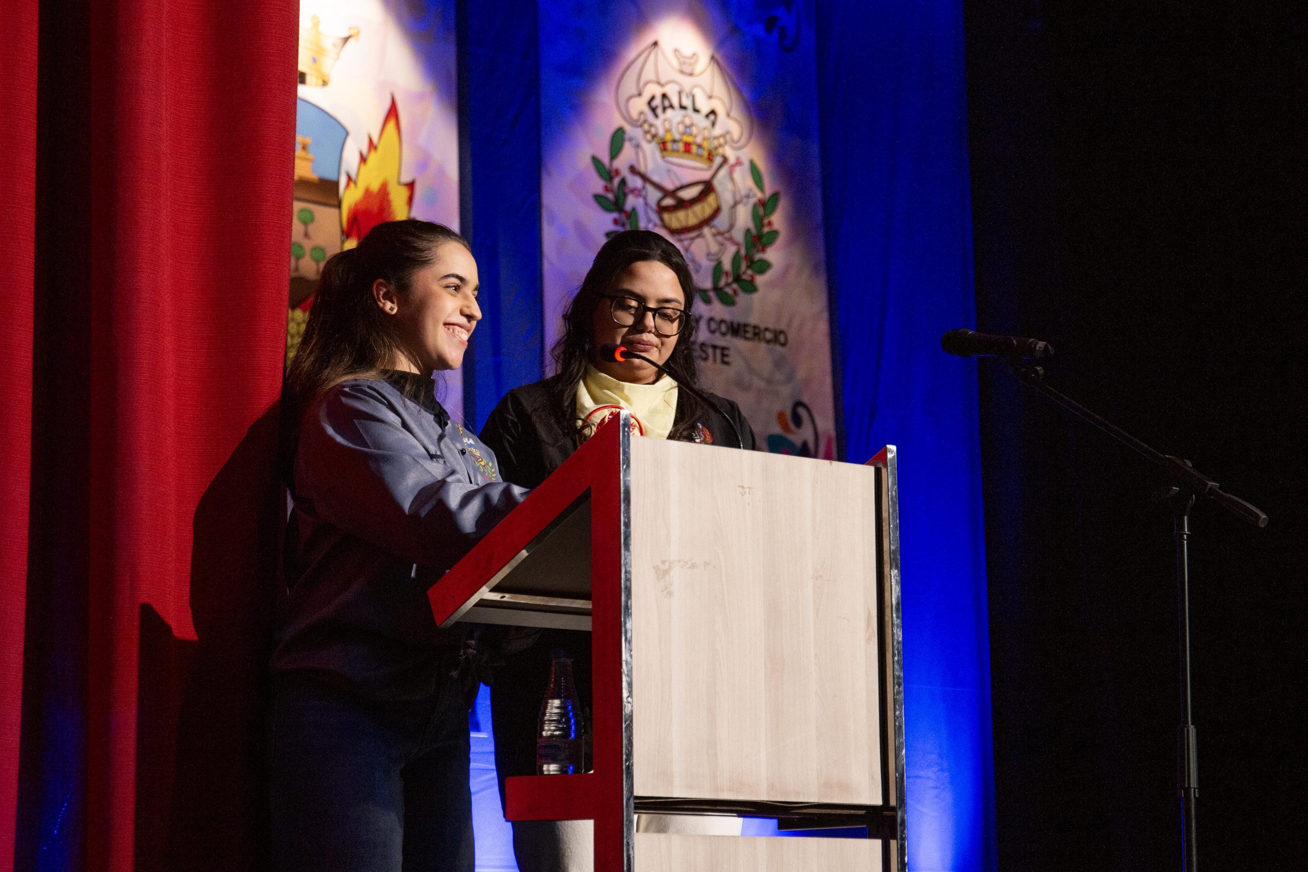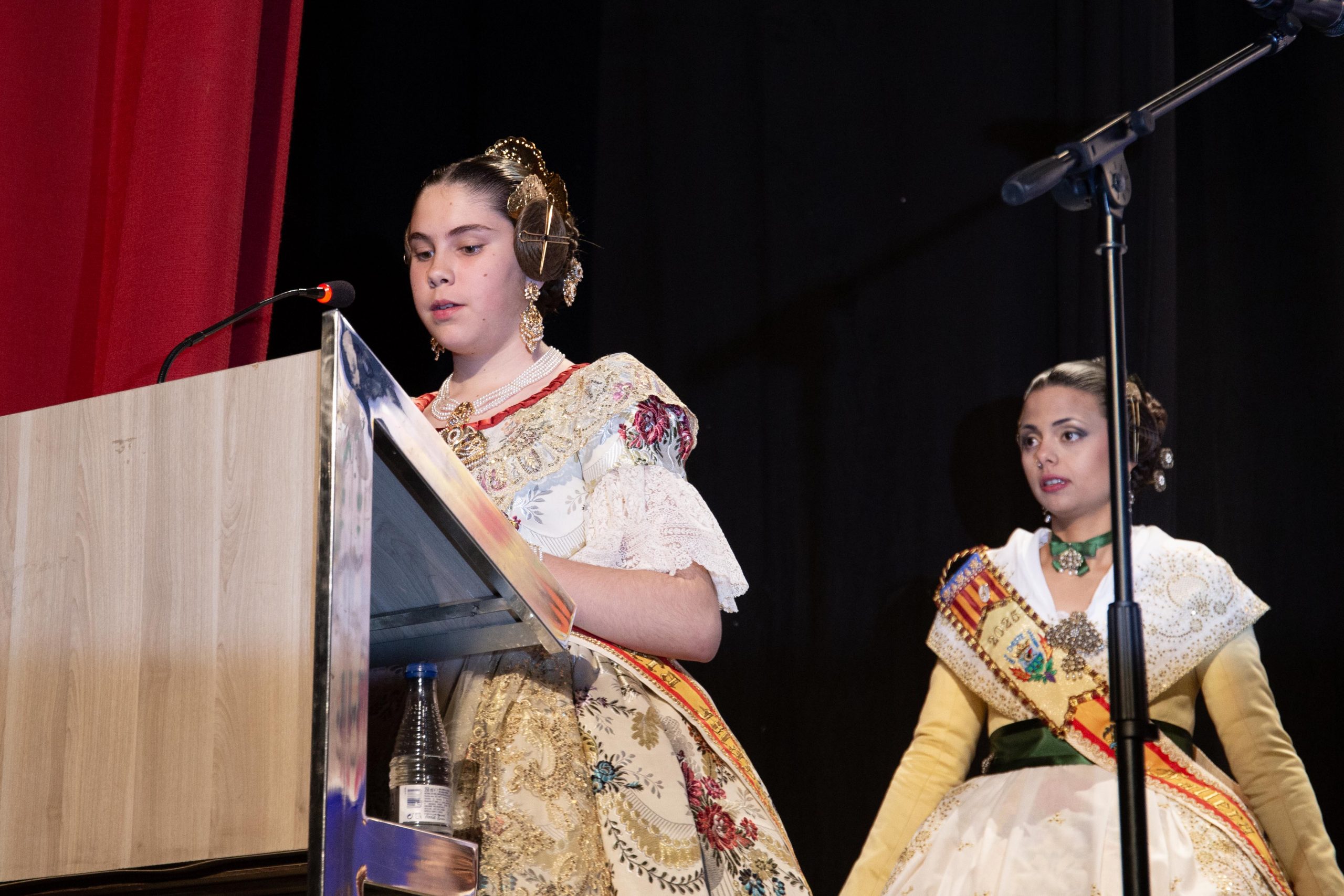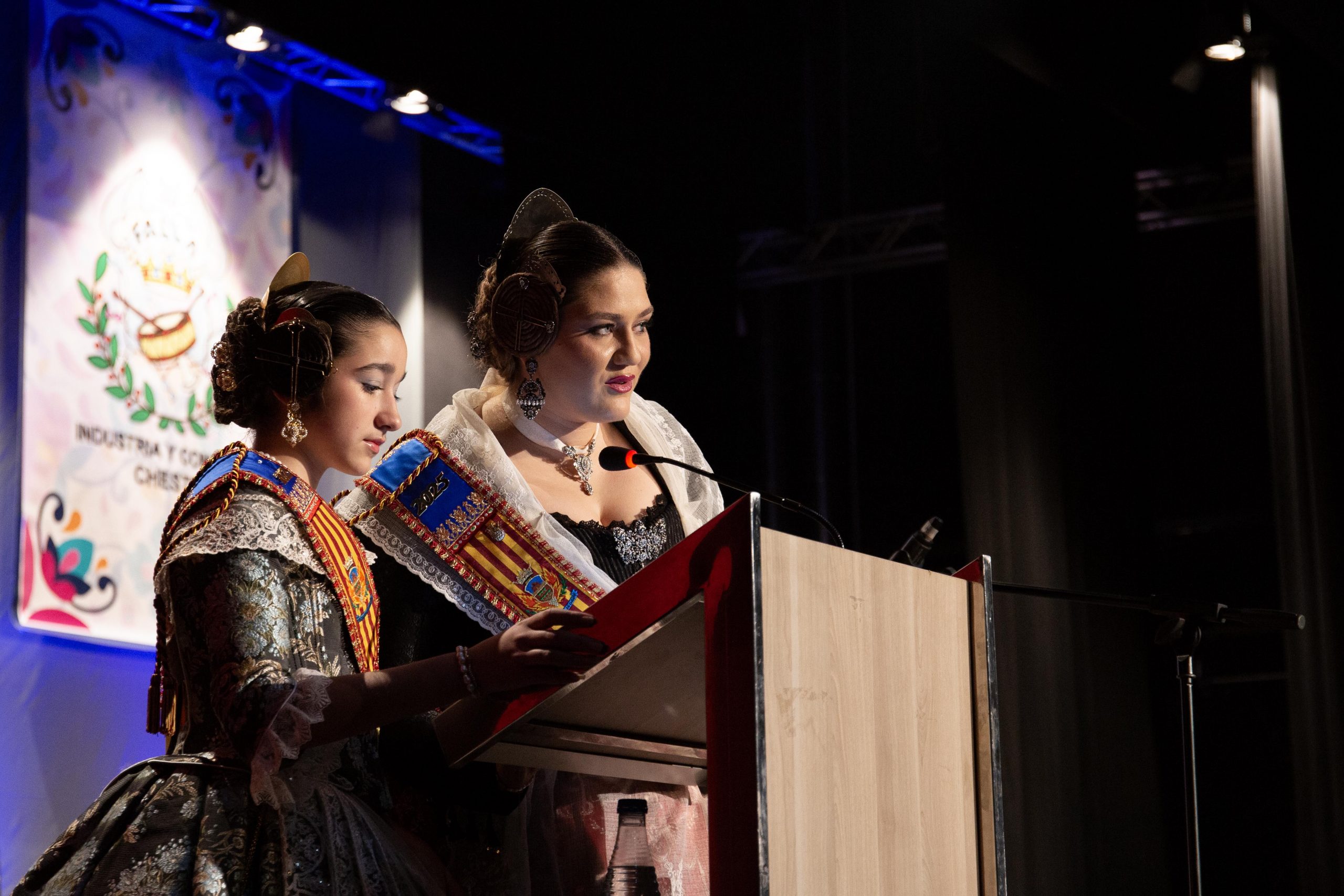 Las falleras Celia García Pérez, de la Falla Barrio de la Alegría, y Beatriz Catalá Fuertes, de la Falla Barrio Industria y Comercio, fueron las encargadas de conducir la Gala, abriendo el acto con unas palabras dedicadas a las poblaciones afectadas por la DANA, destacando la fortaleza y la resiliencia del pueblo valenciano ante la adversidad.