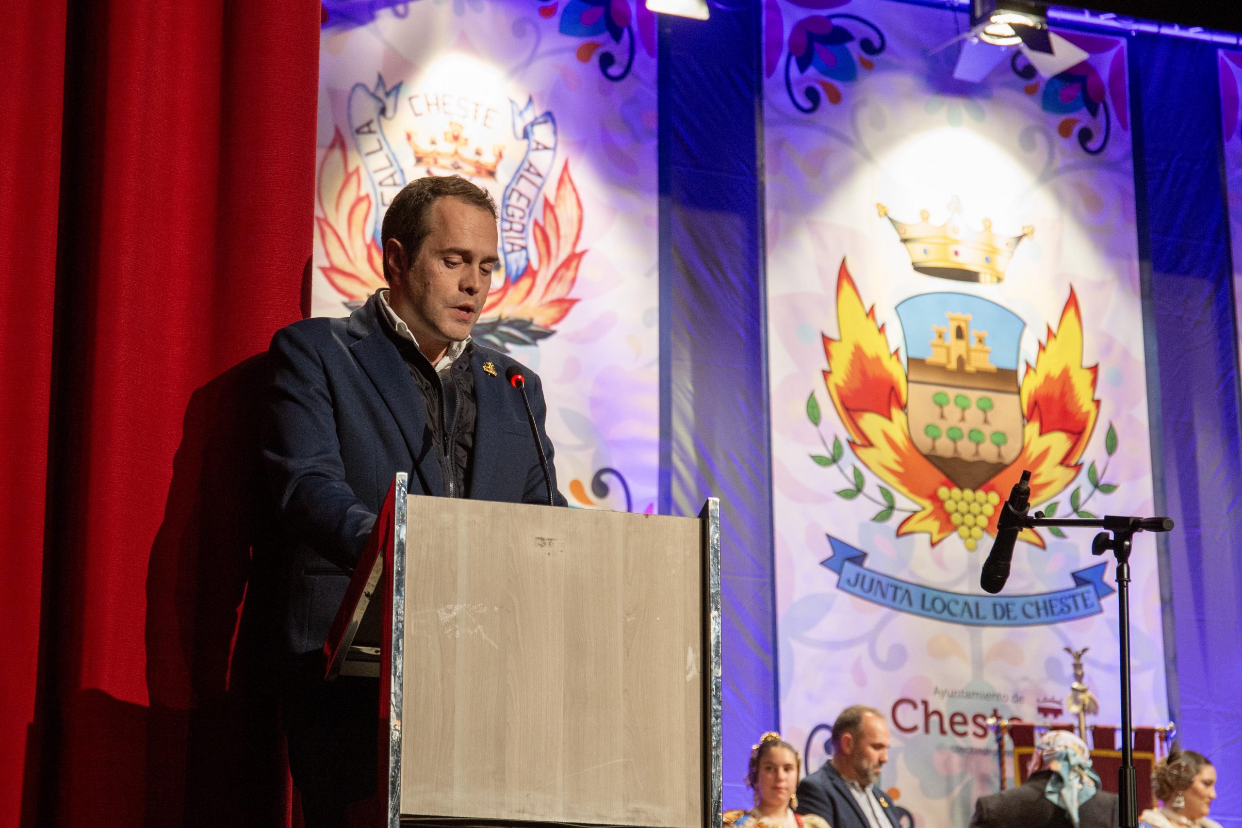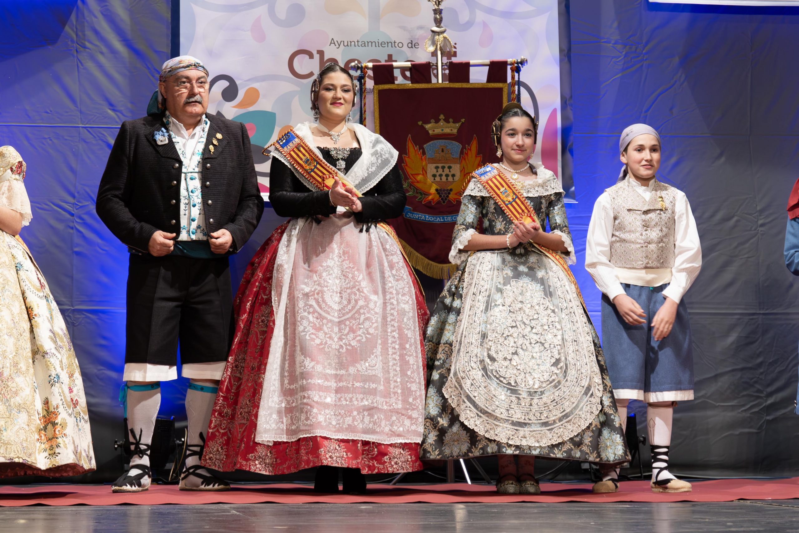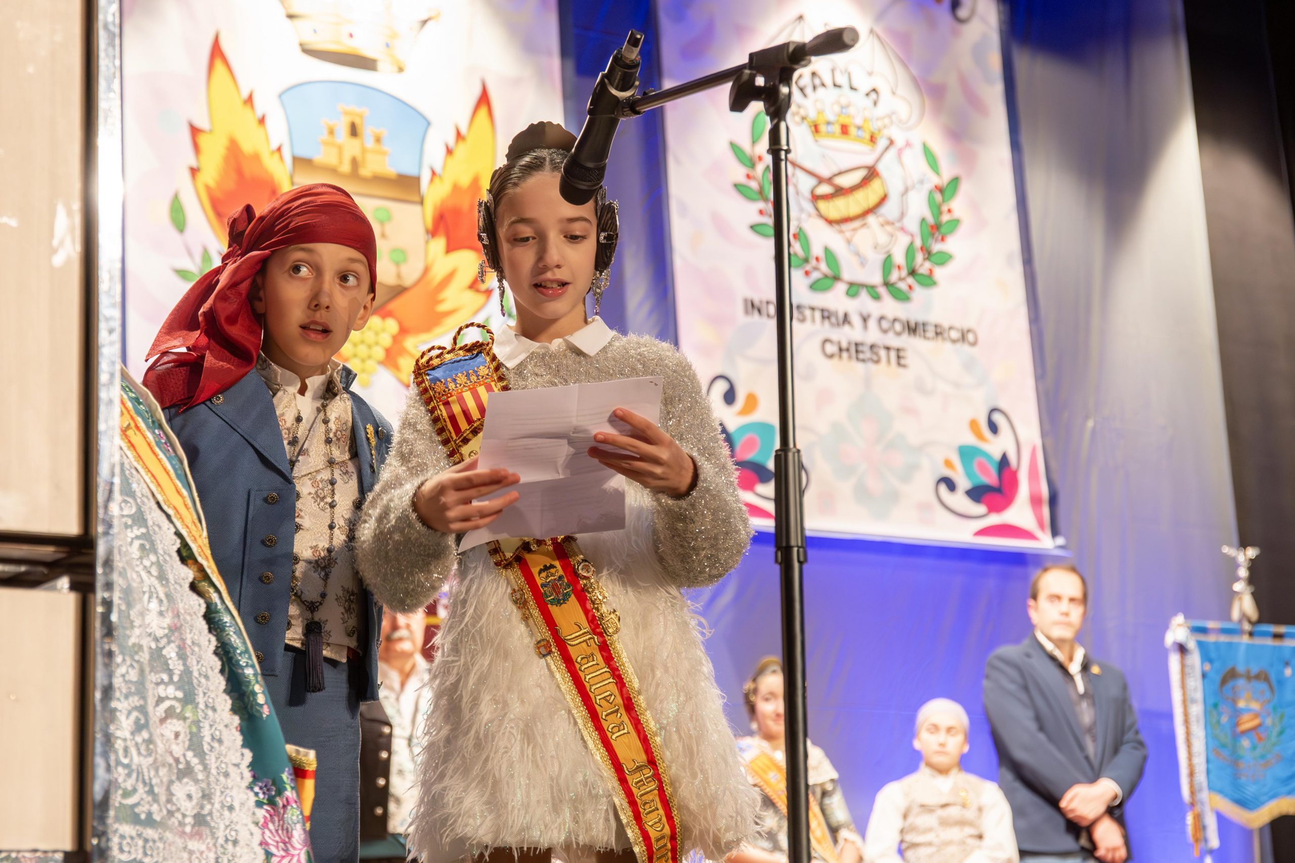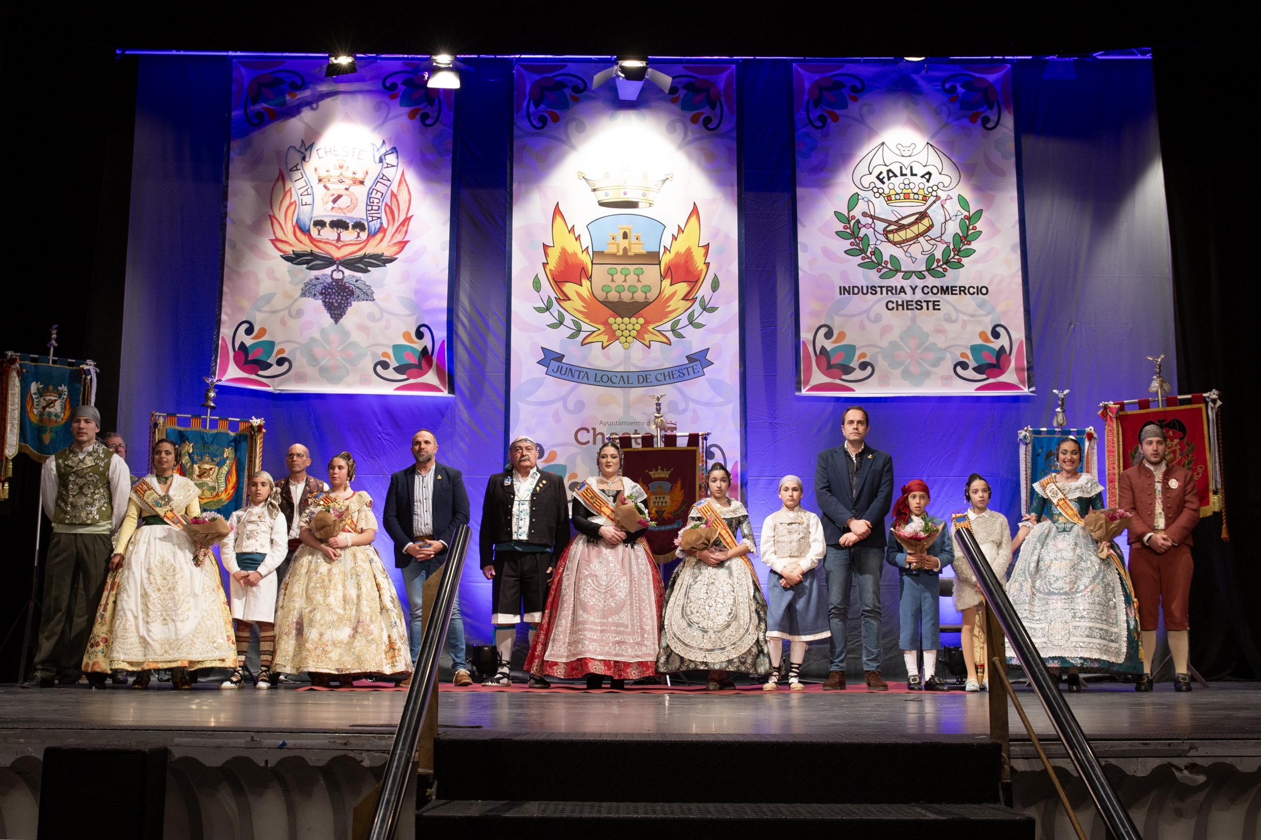 Tras las llamada a los miembros Junta Local Fallera, los representantes de la Falla Barrio de la Alegría, de la Falla Barrio Industria y Comercio y de la Junta Local irrumpieron en el teatro, entre los aplausos de las personas asistentes. El alcalde, José Morell, y el concejal de Fiestas, Óscar Galdón, también fueron llamados antes de comenzar el pregón. Con el escenario ya completo, las falleras mayores de las dos Fallas de la población y de la Junta Local Fallera, acompañadas por sus Presidentes, invitaron a los chestanos y a las chestanas a disfrutar de las Fiestas Josefinas, compartiendo su misma ilusión, y coincidieron en ensalzar en sus discursos la unión fallera para la reconstrucción tras la DANA. Los representantes de las dos comisiones recibieron las insignias de manos del alcalde y del concejal, y también fue entregado un ramo de flores a cada fallera mayor. Por su parte, las falleras de la Junta local recibieron las llaves de la ciudad y ramos de flores, de manos de Morell.