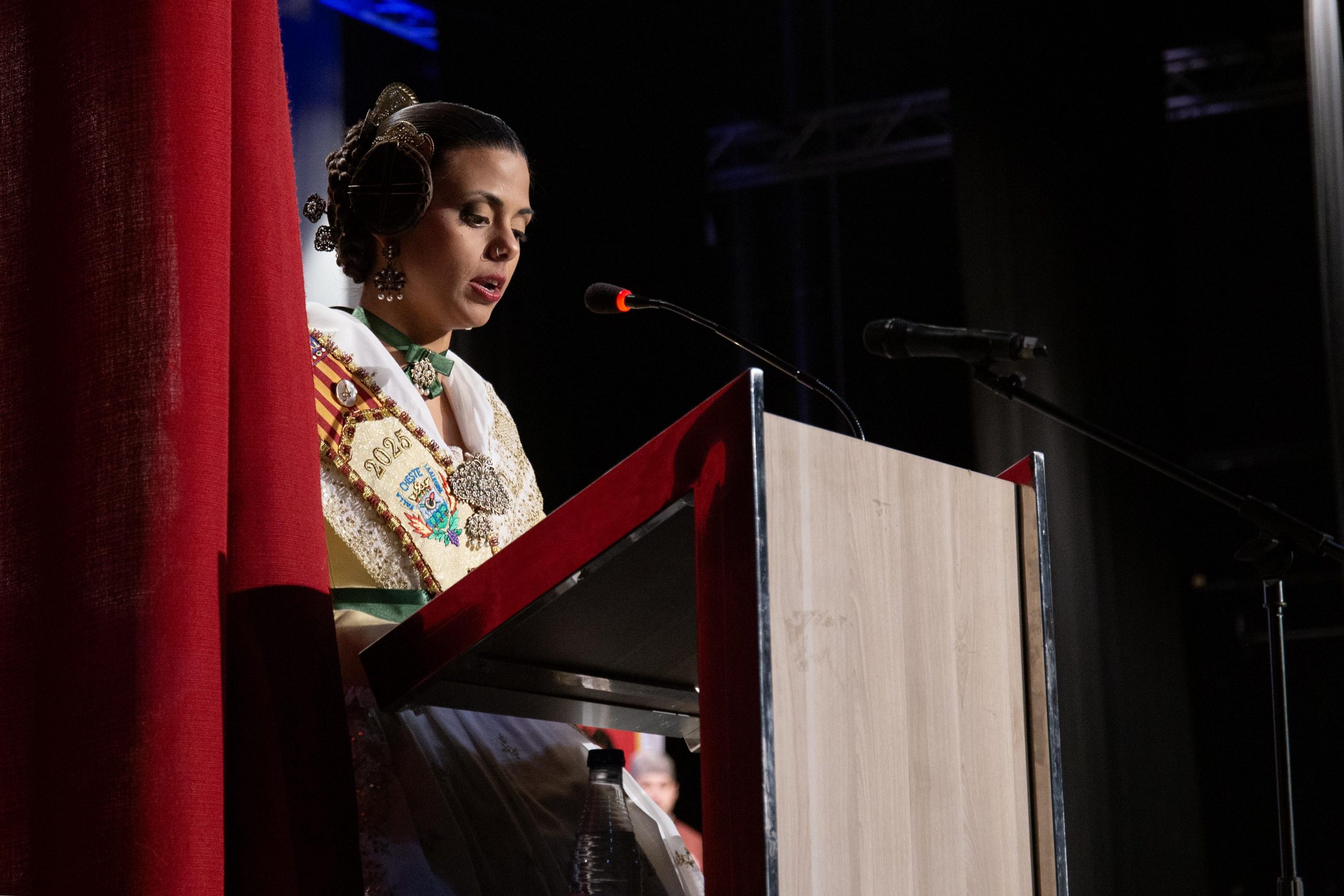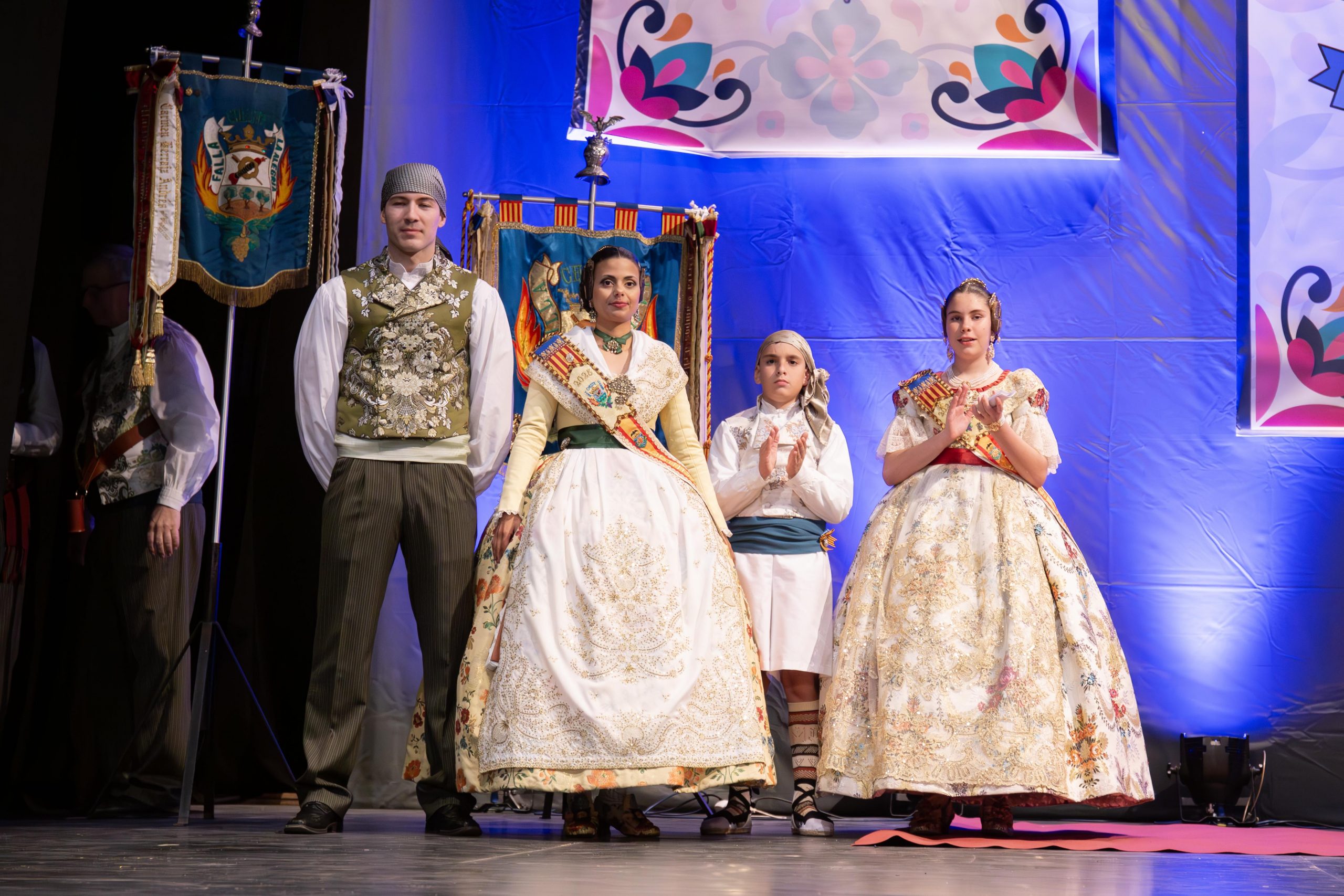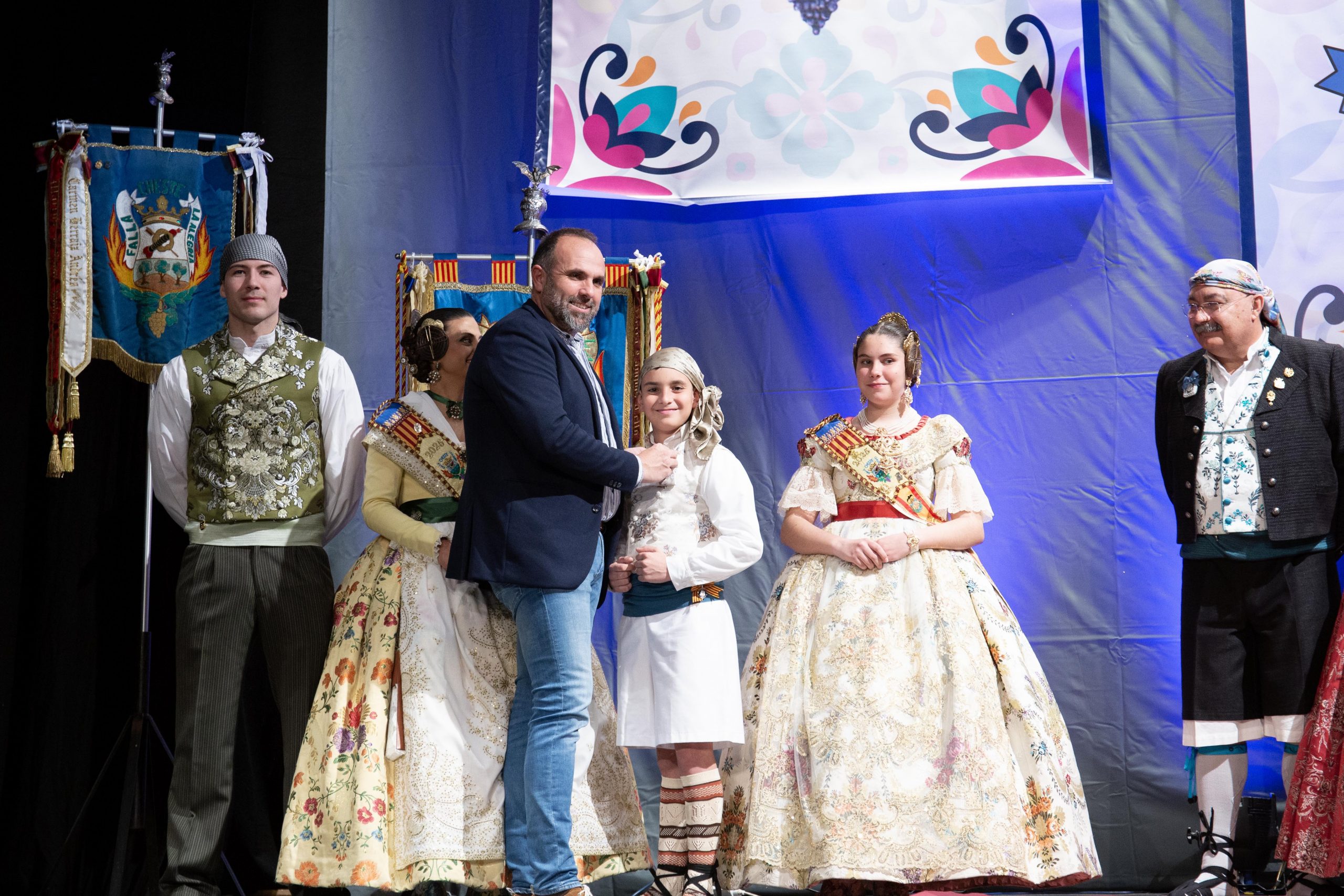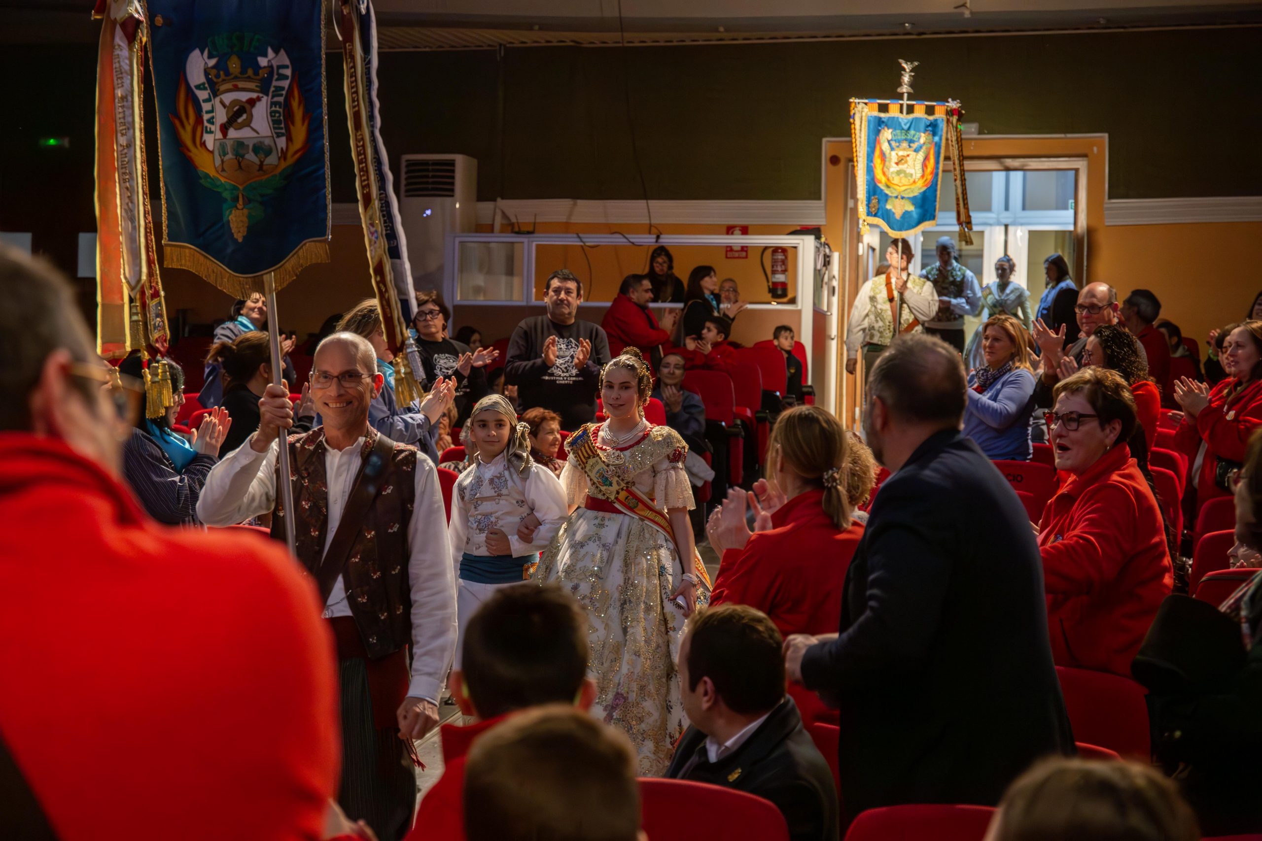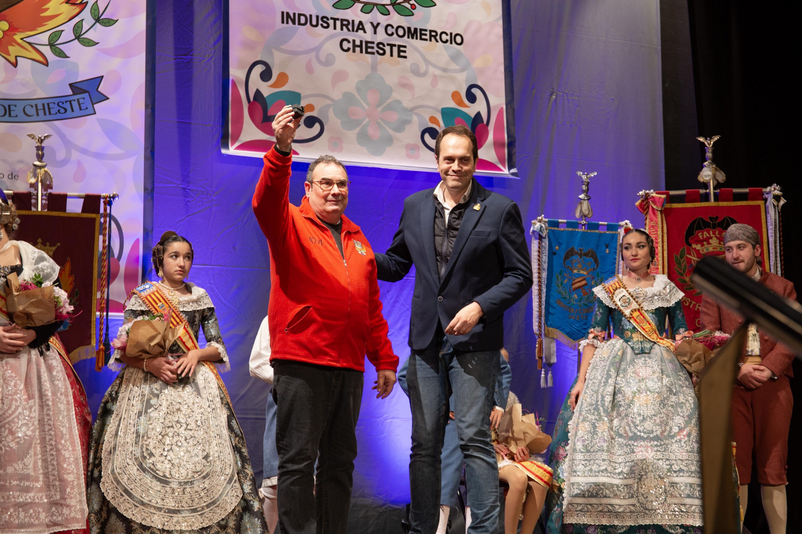Tras las llamada a los miembros Junta Local Fallera, los representantes de la Falla Barrio de la Alegría, de la Falla Barrio Industria y Comercio y de la Junta Local irrumpieron en el teatro, entre los aplausos de las personas asistentes. El alcalde, José Morell, y el concejal de Fiestas, Óscar Galdón, también fueron llamados antes de comenzar el pregón. Con el escenario ya completo, las falleras mayores de las dos Fallas de la población y de la Junta Local Fallera, acompañadas por sus Presidentes, invitaron a los chestanos y a las chestanas a disfrutar de las Fiestas Josefinas, compartiendo su misma ilusión, y coincidieron en ensalzar en sus discursos la unión fallera para la reconstrucción tras la DANA. Los representantes de las dos comisiones recibieron las insignias de manos del alcalde y del concejal, y también fue entregado un ramo de flores a cada fallera mayor. Por su parte, las falleras de la Junta local recibieron las llaves de la ciudad y ramos de flores, de manos de Morell.