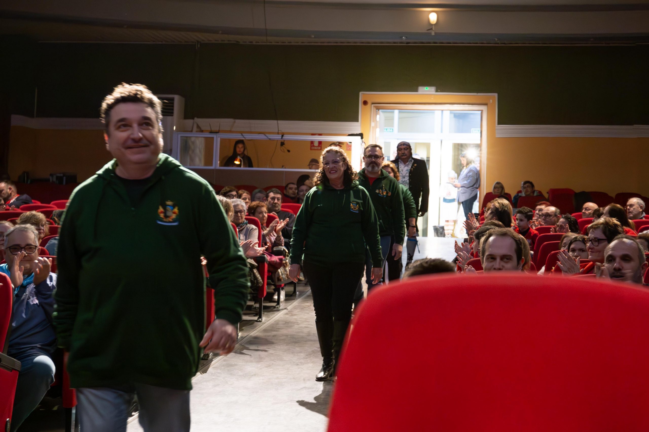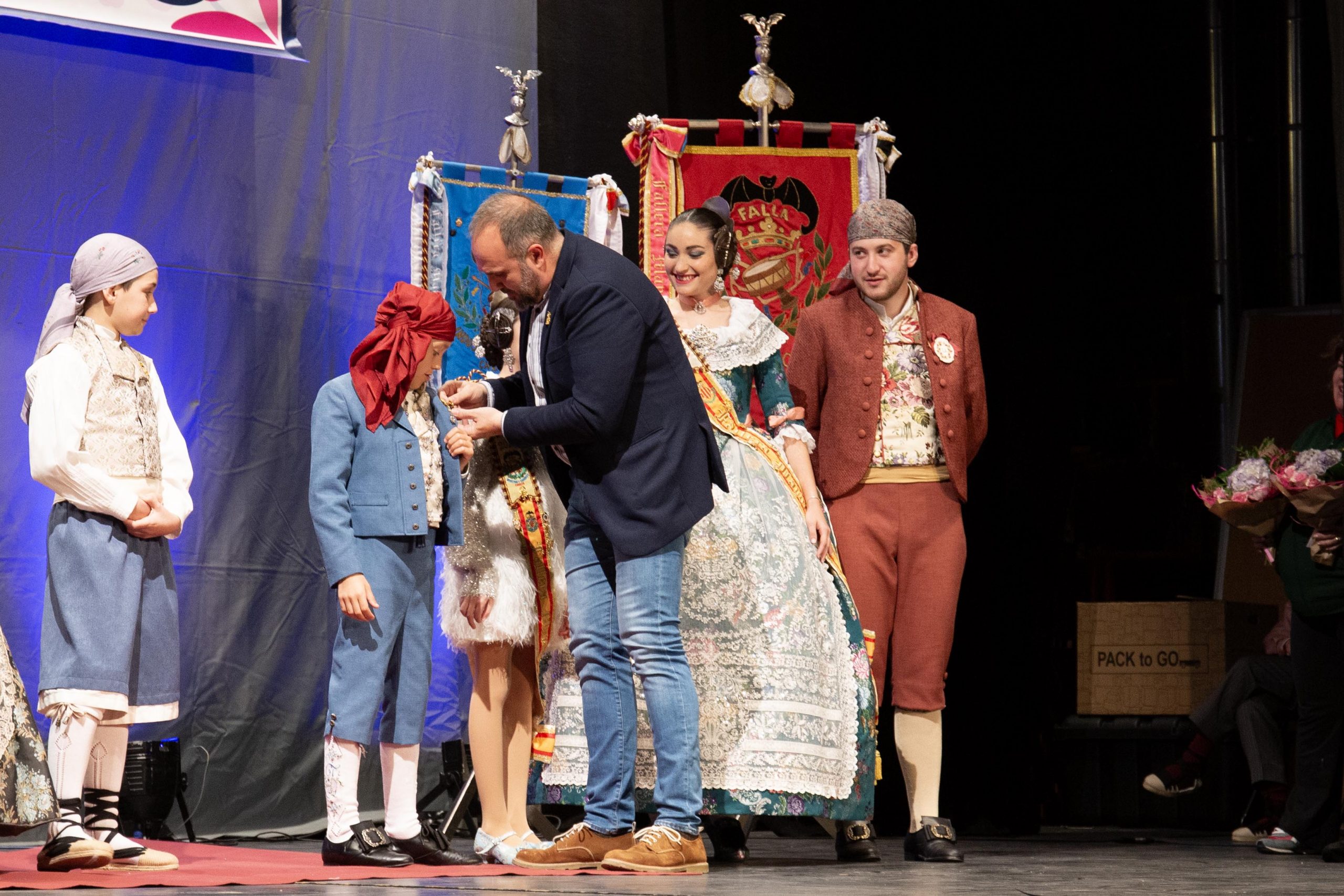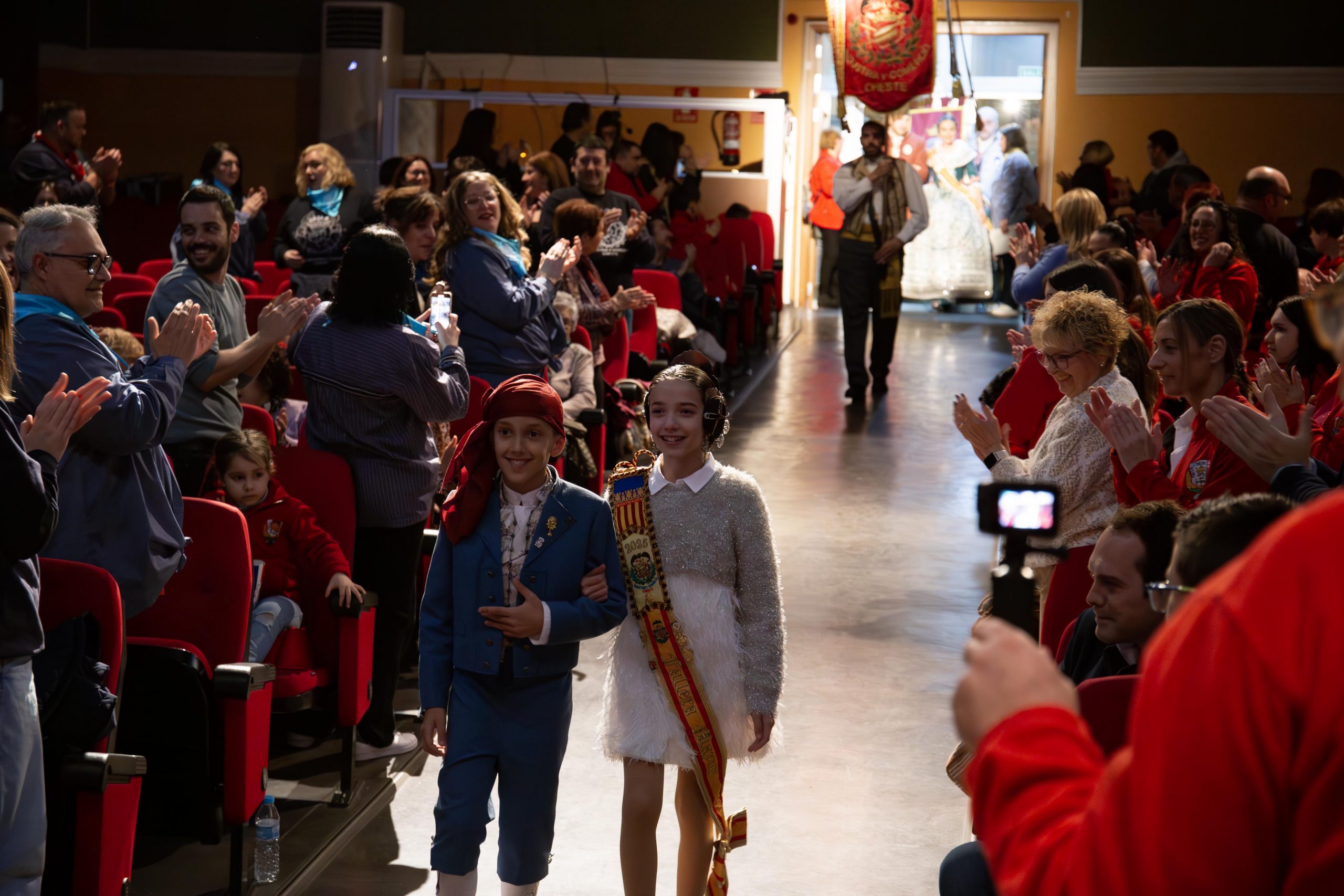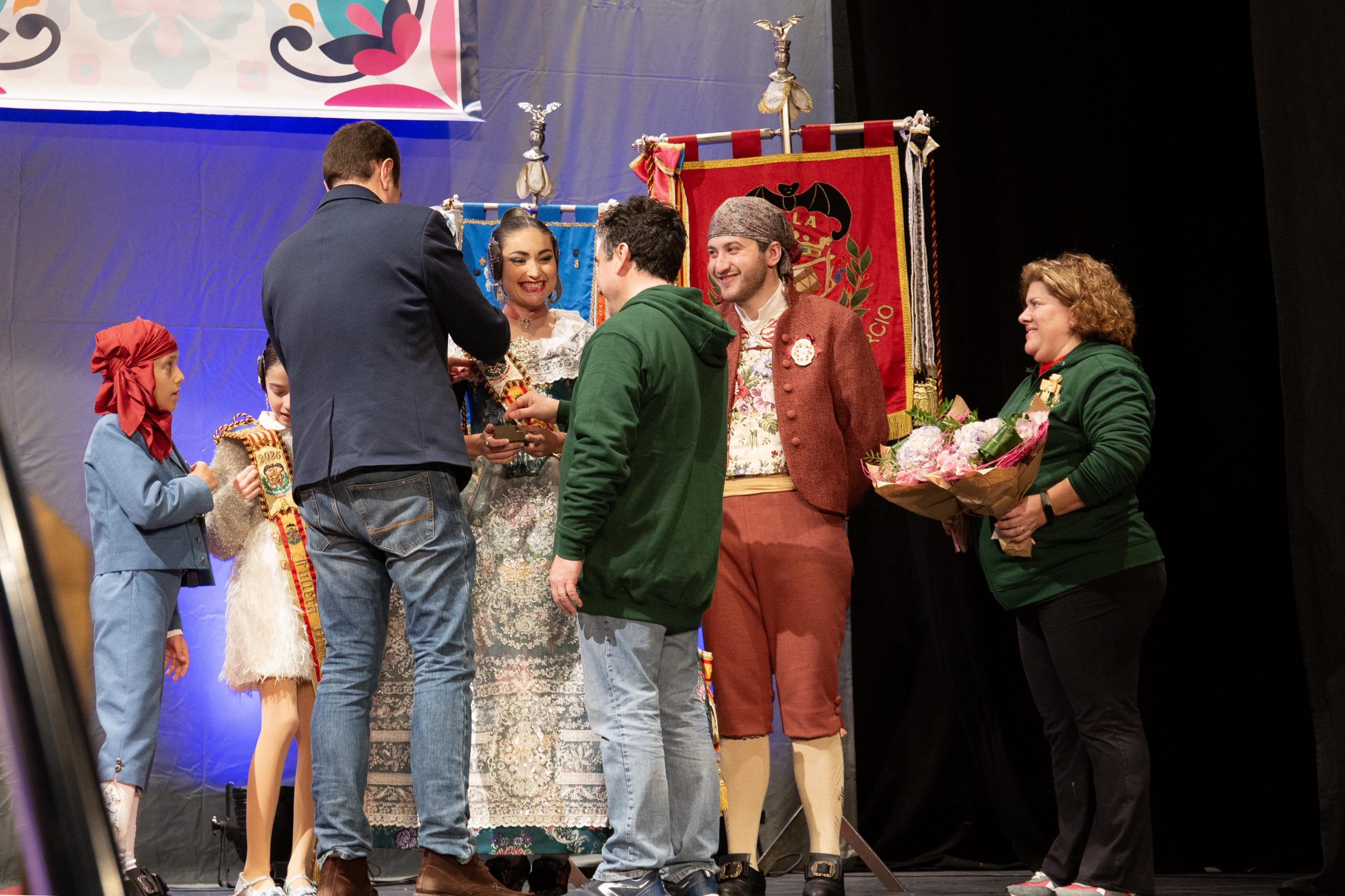 Tras las llamada a los miembros Junta Local Fallera, los representantes de la Falla Barrio de la Alegría, de la Falla Barrio Industria y Comercio y de la Junta Local irrumpieron en el teatro, entre los aplausos de las personas asistentes. El alcalde, José Morell, y el concejal de Fiestas, Óscar Galdón, también fueron llamados antes de comenzar el pregón. Con el escenario ya completo, las falleras mayores de las dos Fallas de la población y de la Junta Local Fallera, acompañadas por sus Presidentes, invitaron a los chestanos y a las chestanas a disfrutar de las Fiestas Josefinas, compartiendo su misma ilusión, y coincidieron en ensalzar en sus discursos la unión fallera para la reconstrucción tras la DANA. Los representantes de las dos comisiones recibieron las insignias de manos del alcalde y del concejal, y también fue entregado un ramo de flores a cada fallera mayor. Por su parte, las falleras de la Junta local recibieron las llaves de la ciudad y ramos de flores, de manos de Morell.