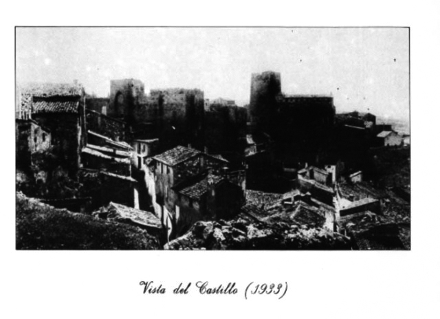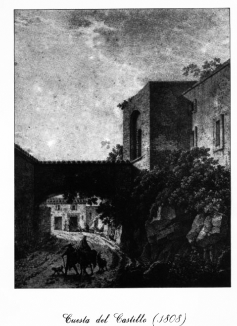La fotografía corresponde a una colección que se trajo desde Paris de una serie de grabados realizados en el año 1808, en la que se da por hecho que corresponde a la Cuesta del Castillo. Yo nací en la Plaza del Castillo (hoy Plaza de Armas), y por el puente de entrada habré pasado cientos y cientos de veces. Por tanto, en cuanto vi que a ese grabado se le ponía como título Cuesta del Castillo, me dije que no, que el Puente jamás había tenido tejas, que en la muralla que vivía mi amigo Juan Abril no existían esas ventanas y menos todavía con marco incluido, lo más que había eran unas pequeñas espilleras selladas para que no entrase el frio viento del invierno, que el Pueblo de Buñol está orientado al Sur por lo que las sombras del Castillo y del Puente incluido, van de derecha a izquierda iluminando toda la sección que da hacia La Hoya, y que en la fotografía podemos observar que la sombra se desplaza de izquierda a derecha, estando en penumbra todo el puente y la cara sur de la torre. Y, por último, si observamos el arco de entrada veremos que no llega a pie de tierra, que se queda a unos metros por encima de la baranda, al contrario que el nuestro que llega hasta la calzada. También se puede apreciar la parte rocosa de debajo del puente con gran vegetación que en nada se parece a la roca del “nuestro”, y por último en fotografías del mismo año 1808, en una en la Cuesta no se aprecian casas, sin embargo en la otra se ven viviendas que incluso me atrevería a decir que son las mismas que existen en la actualidad.