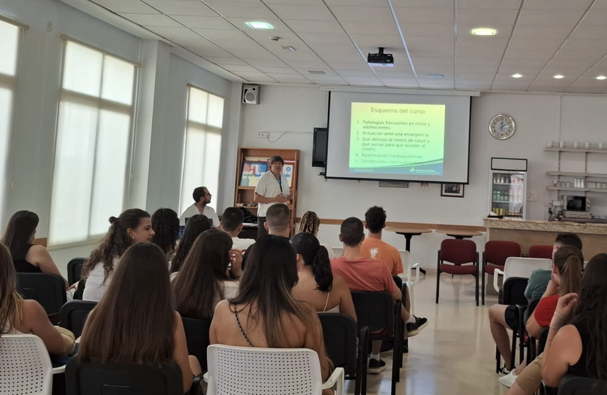 El pasado jueves, 26 de junio, se realizó una formación sobre primeros auxilios a todo el equipo de la escuela, por parte del coordinador del centro de salud, Esteban Rosero, en la que se abordaron temas como las patologías más frecuentes en niños y adolescentes, cómo actuar ante una emergencia, cuándo derivar al centro de salud o cómo hacer una reanimación cardiopulmonar, entre otros. Después, fue la concejala quién se reunió con el personal de la escuela para darles unas instrucciones básicas de atención al alumnado, incidiendo en las normas de convivencia, y finalmente, las familias recibieron una charla en el Centro de Formación de Personas Adultas sobre el contenido del proyecto de la escuela, en la que la organización recordó la información práctica y resolvió las dudas planteadas.