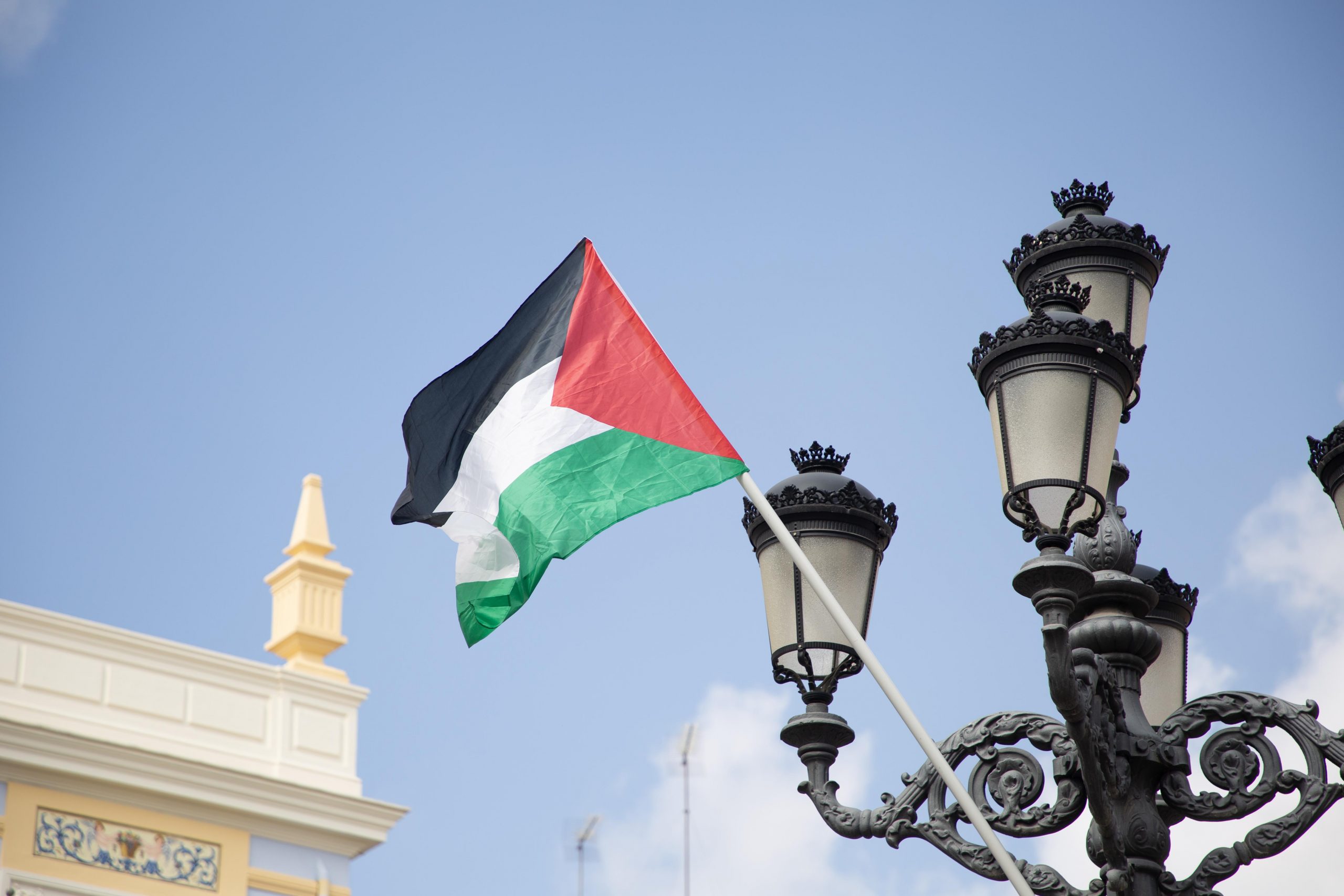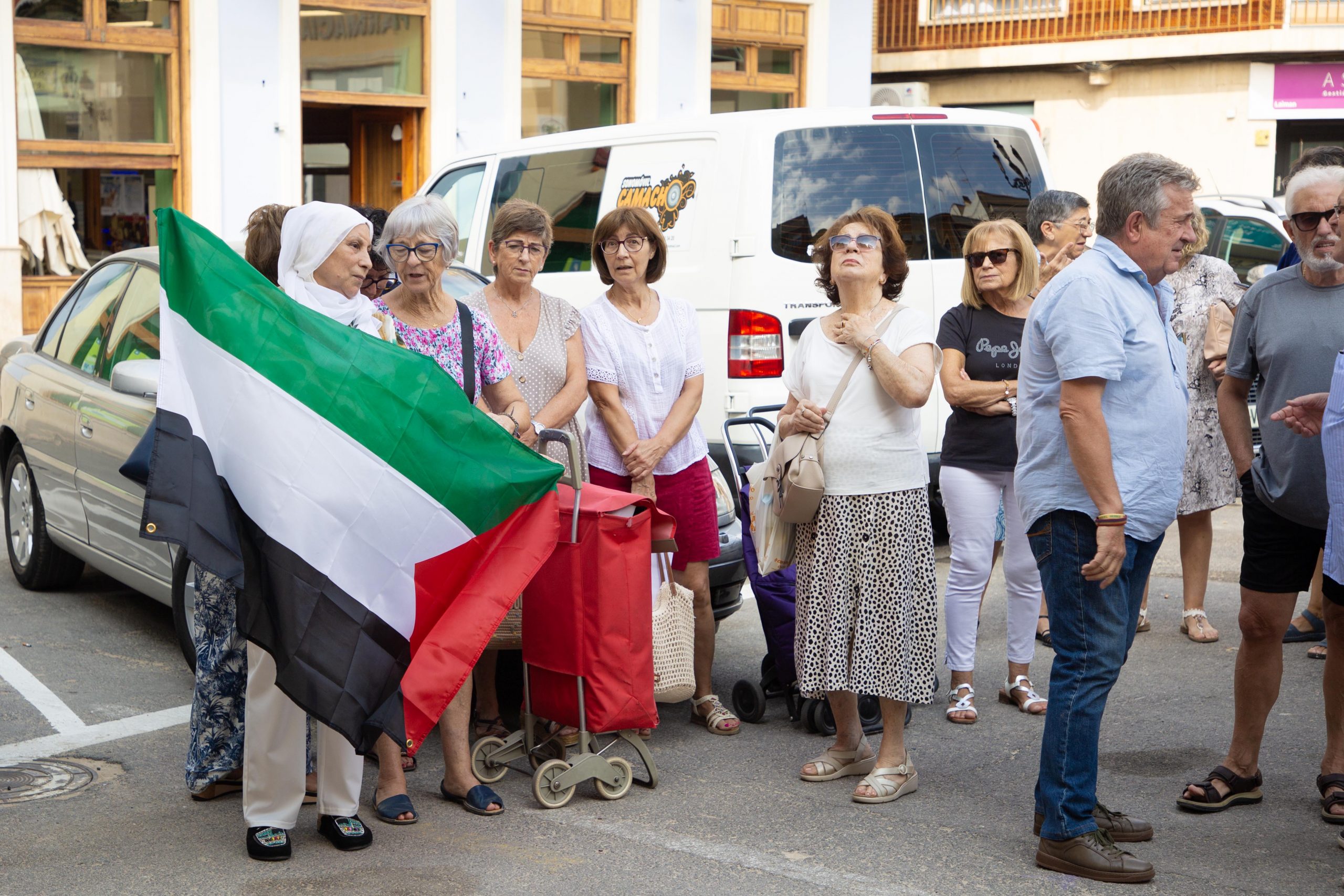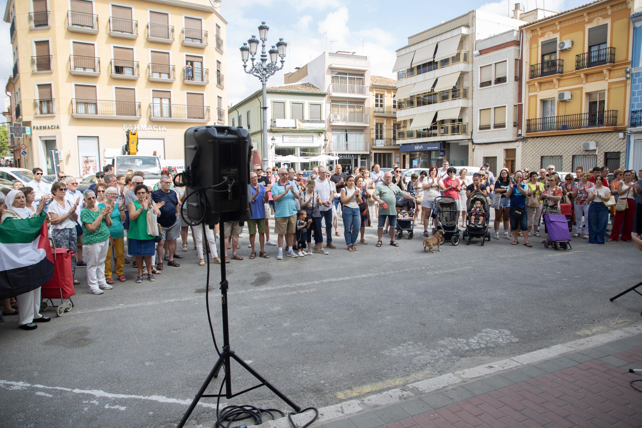 Tras los discursos se ha guardado un minuto de silencio por las víctimas del genocidio y, acto seguido, la brigada ha colgado una bandera de Palestina en la farola de la plaza