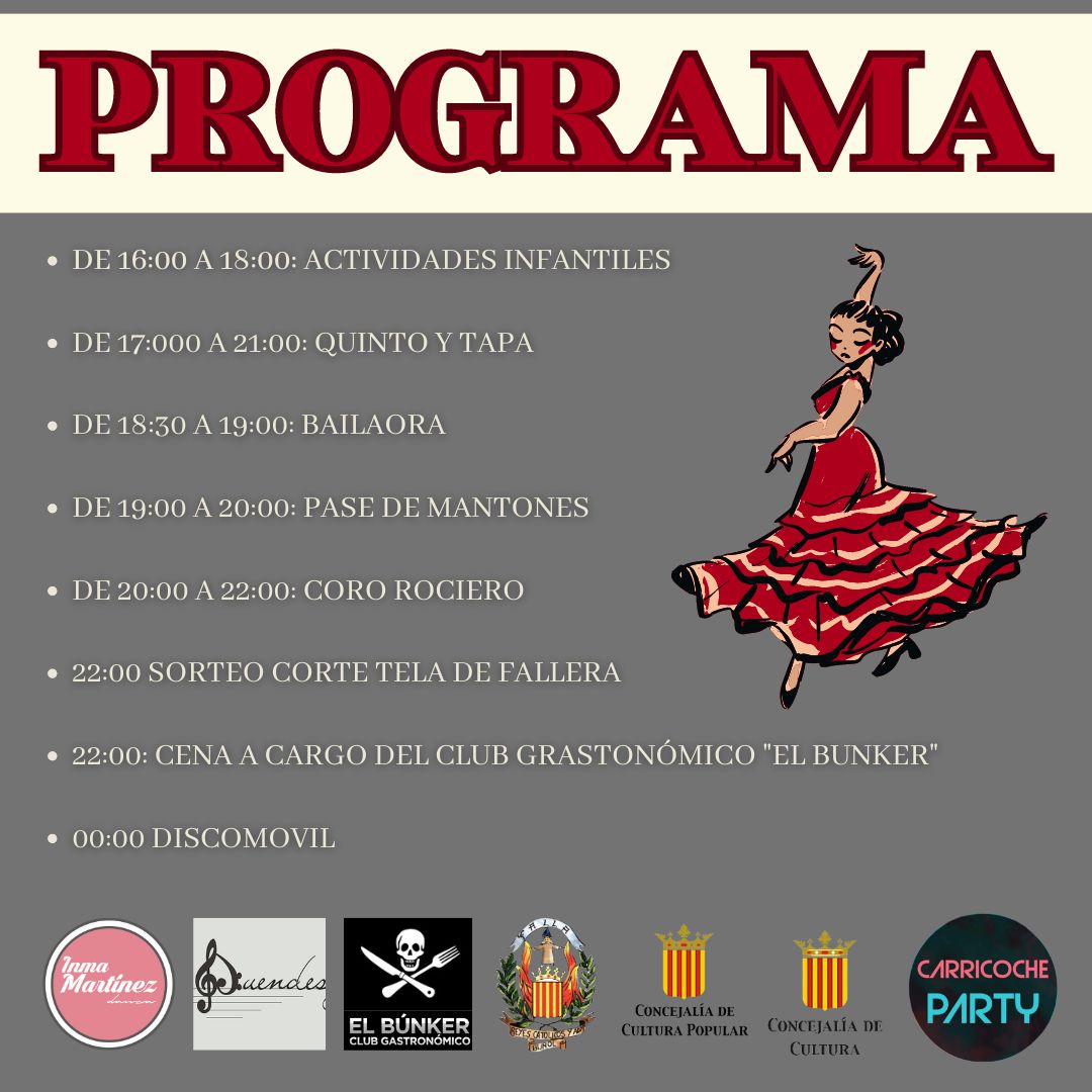 Sin duda, una tarde flamenca para todas las edades. No te pierdas la Feria de abril de la falla Reyes católicos. En este acto colaboran colaboran el Ayuntamiento de Buñol a través de las concejalías de Cultura y Cultura Popular y el Club Gastronómico «El Búnker».