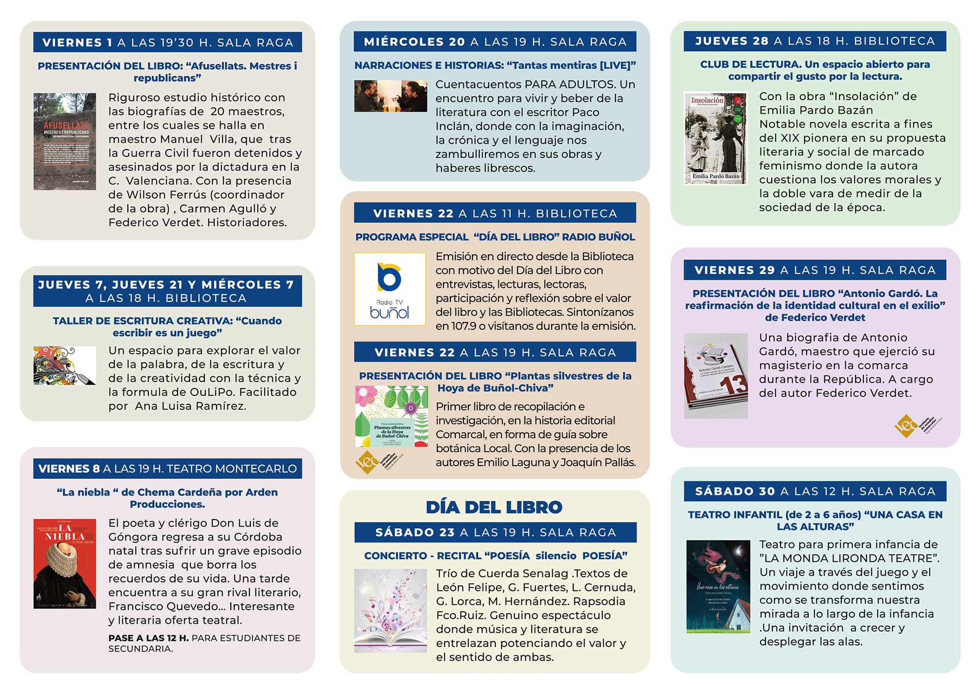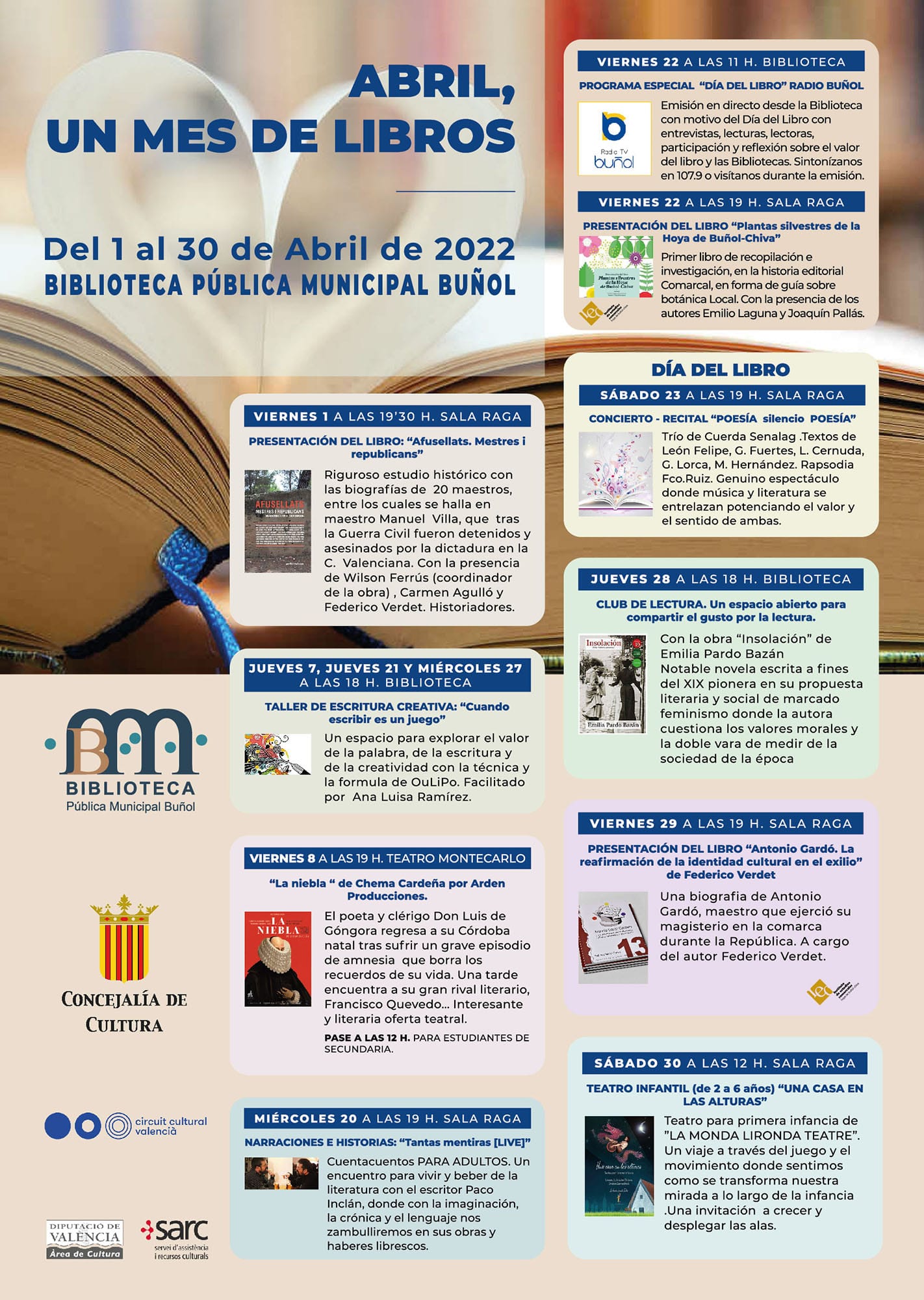 El 23 de Abril se celebra en todo el mundo el Día del Libro. Los actos arrancaron el pasado 1 de abril y finalizan el 30. Cuentacuentos, teatro, recitales poéticos, club de lectura, presentaciones de libros, talleres de escritura y programa especial de Radio Buñol centran la atención todo el mes en la localidad