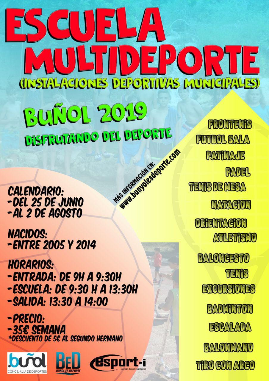 Por otro lado, Marta Pérez, concejal de Deportes del consistorio buñolense, destaca la apertura de inscripciones para participar en la Escuela Multideporte, que se desarrollará del 25 de junio al 2 de agosto en las diversas instalaciones deportivas municipales en horario de 9 a 14h a un precio de 35 euros a la semana, y con un descuento de 5 euros al segundo hermano inscrito.