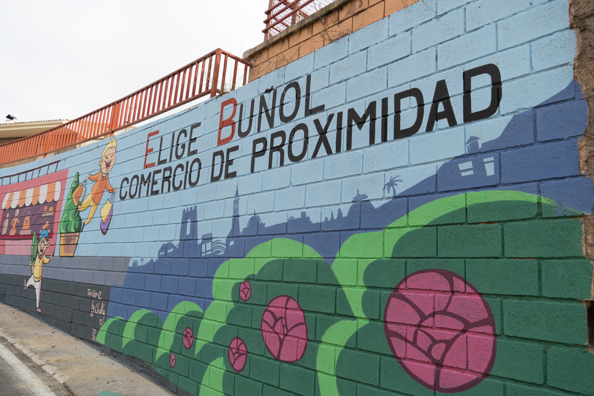 Redacción.- El artista Toni López ha terminado de pintar este viernes un mural para fomentar las compras en los comercios y establecimientos de Buñol. Se trata de una iniciativa que parte de la Asociación de Empresarios y Autónomos de la localidad y que está dentro de la campaña «Elige Buñol», que se puso en marcha durante los meses más duros de la pandemia.