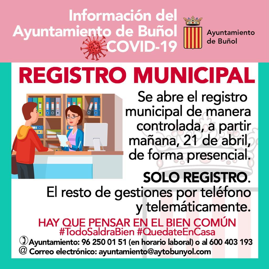 El Ayuntamiento de Buñol informa de la apertura de permisividad en algunos ámbitos de nuestra vida cotidiana. Confirma la apertura del Registro Municipal del Consistorio a partir de hoy martes 21 de abril de manera presencial y controlada. Debe guardarse la distancia de seguridad entre los asistentes y siempre asistir en casos de necesidad.