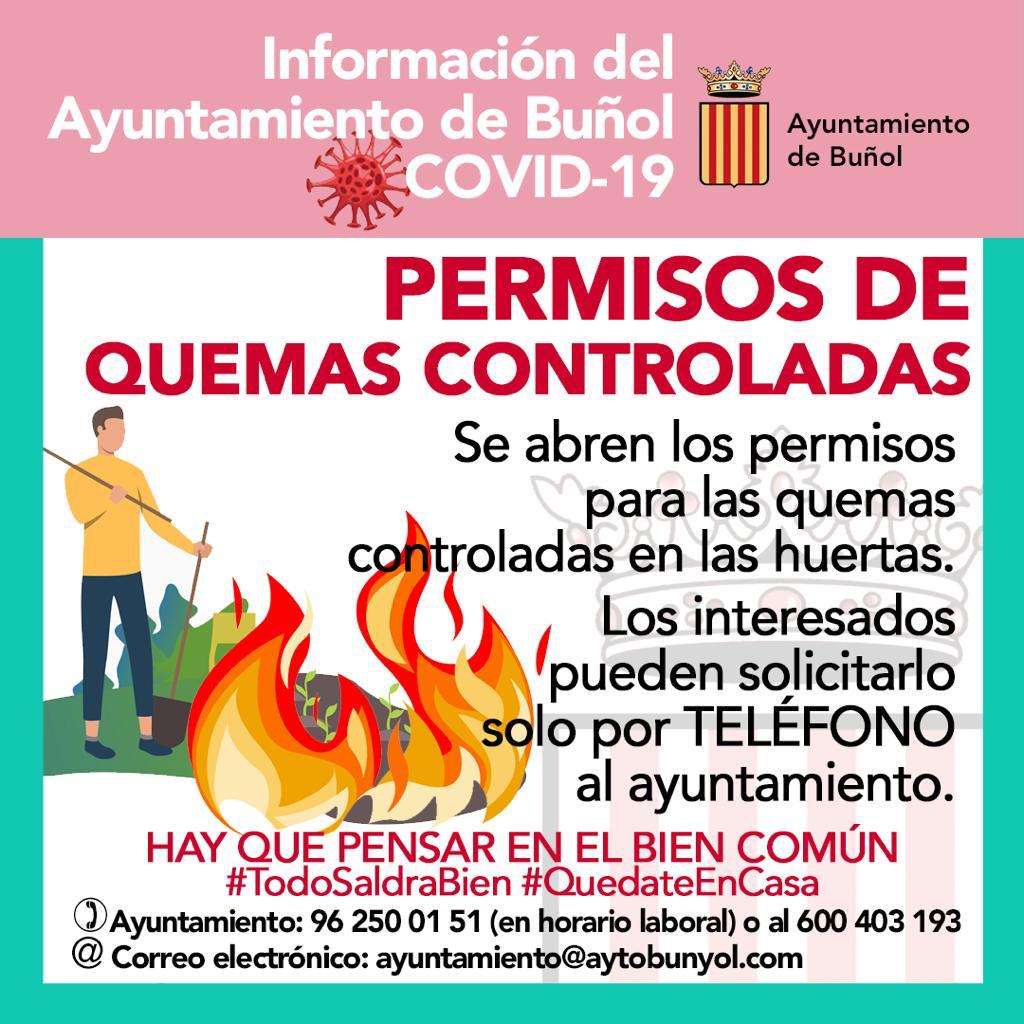 El Ayuntamiento hace público el permiso de quemas controladas de carácter agrícola, pero siempre con permiso del Consistorio. Las quemas pueden hacerse únicamente en las huertas. Todos los interesados deben solicitar permiso llamando al Ayuntamiento al 96 250 01 51 o al 600 403 193. También pueden solicitarlo enviando un mail a ayuntamiento@aytobunyol.com