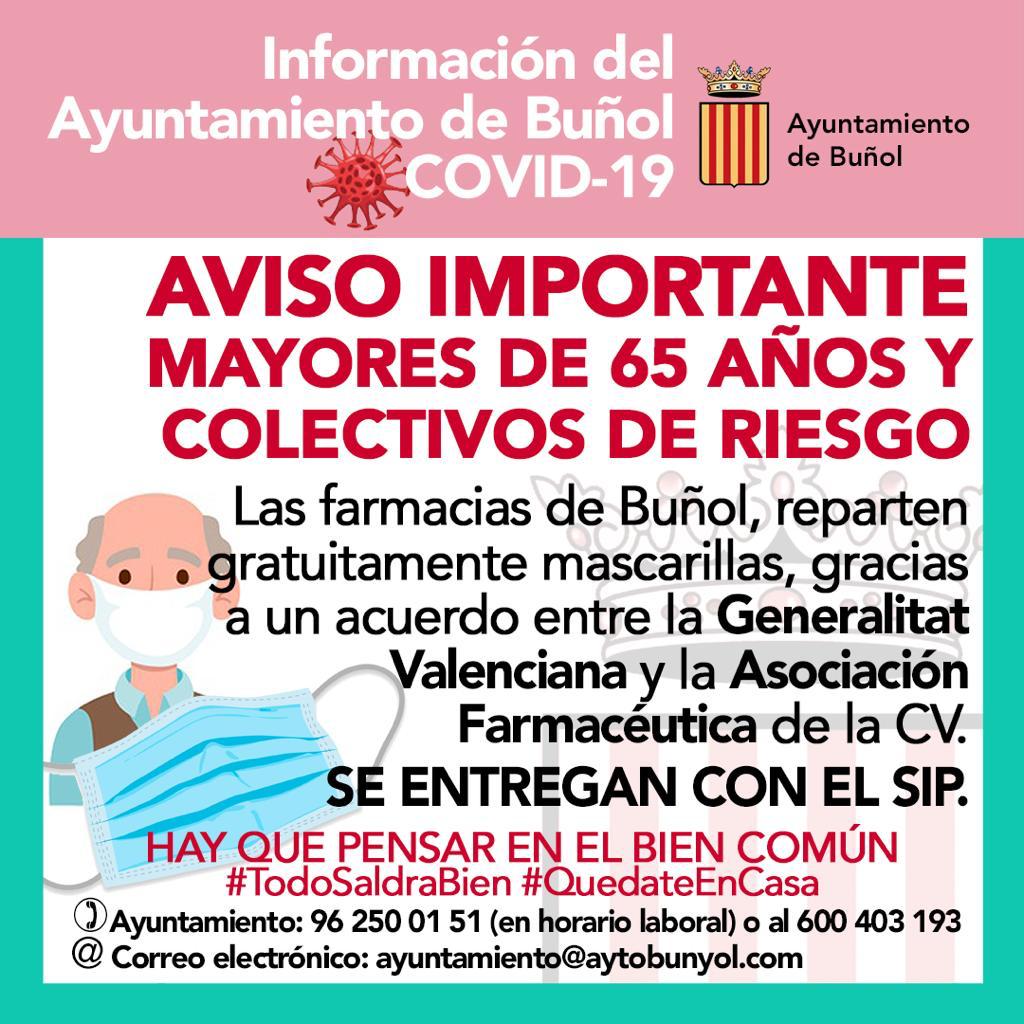 El Consistorio buñolense también informa del reparto de mascarillas gratuitas para los mayores de 65 años y personas de riesgo en las farmacias de la localidad gracias a un acuerdo entre la Generalitat Valenciana y la Asociación Farmacéutica de la Comunitat Valenciana.