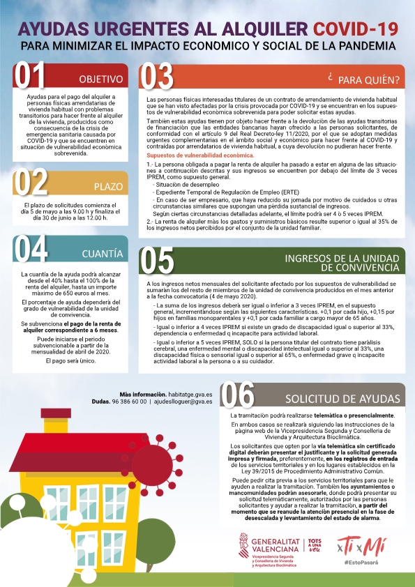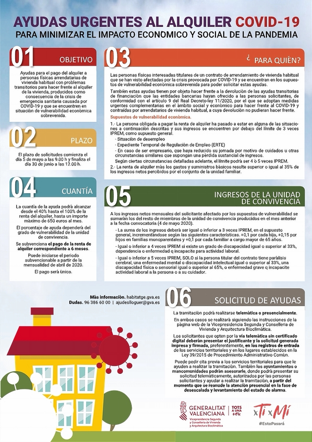 El plazo para solicitar estas ayudas es desde el 5 de mayo hasta el 30 de junio. Para solicitarlas las personas interesadas deberán hacerlo de forma telemática o presencial. En ambos casos se realizará siguiendo las instrucciones de la página web de la Vicepresidencia Segunda y Conselleria de Vivienda y Arquitectura Bioclimática. Pueden ir al decreto que la Conselleria ha publicado. Ahí tienen toda la información: http://www.dogv.gva.es/datos/2020/05/04/pdf/2020_3168.pdf