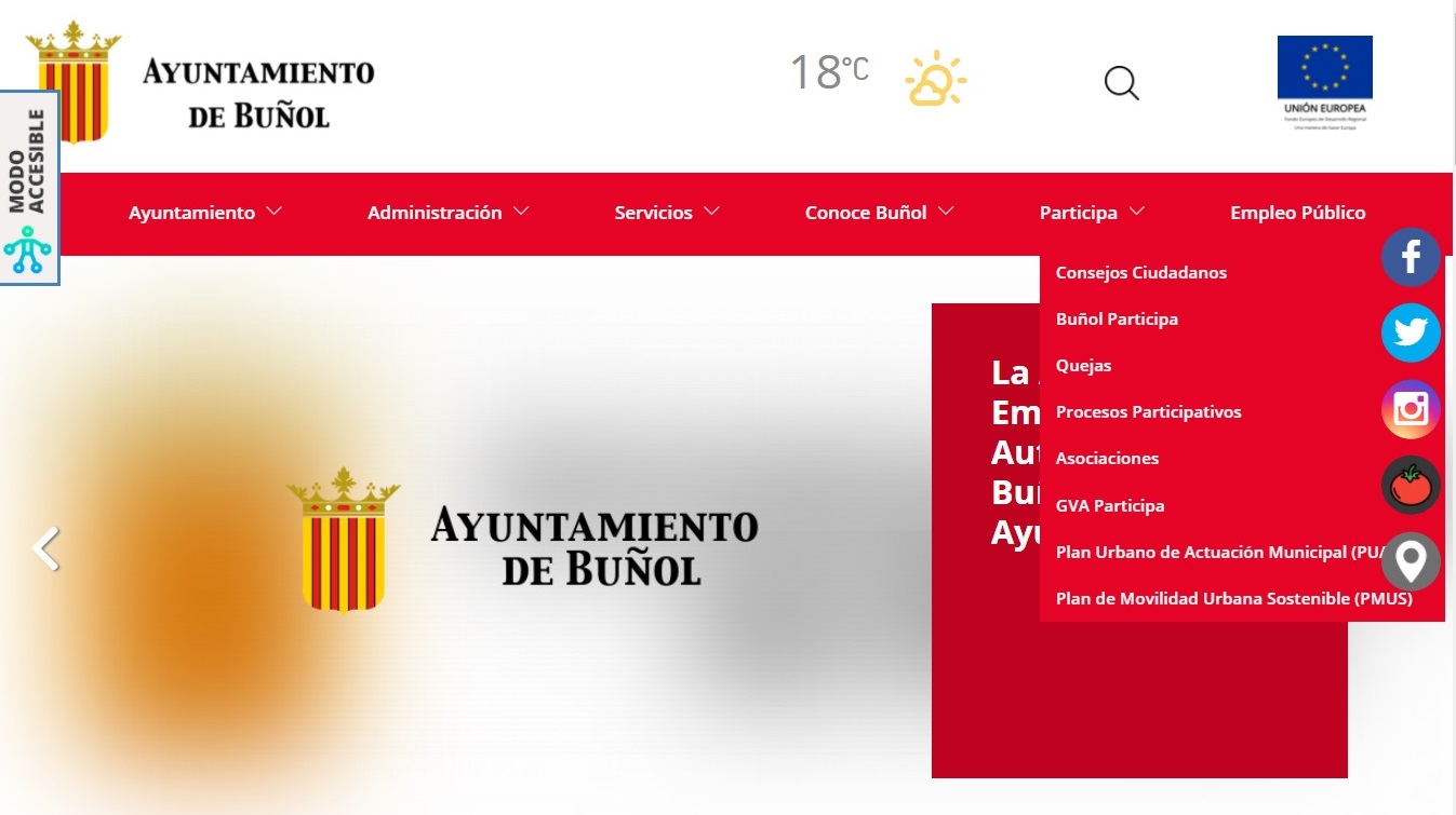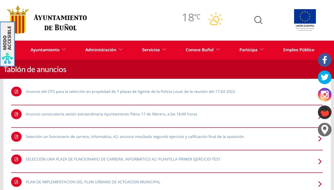 Se destaca en www.buñol.es dos aspectos muy importantes como es el tablón de anuncios y el empleo público, algo muy consultados por la población y que en la anterior web era más complicado su acceso. Esta web también ha contado con la colaboración de Portales de Diputación de Valencia, e irá unida a la nueva APP que prevé lanzarse a finales de mes. En esa aplicación el vecino y visitante podrá acceder y conocer rápidamente el horario de las farmacias, del autobús urbano, de los actos culturales del fin de semana, registrar visita con concejales del consistorio, o reservar pistas municipales deportivas.