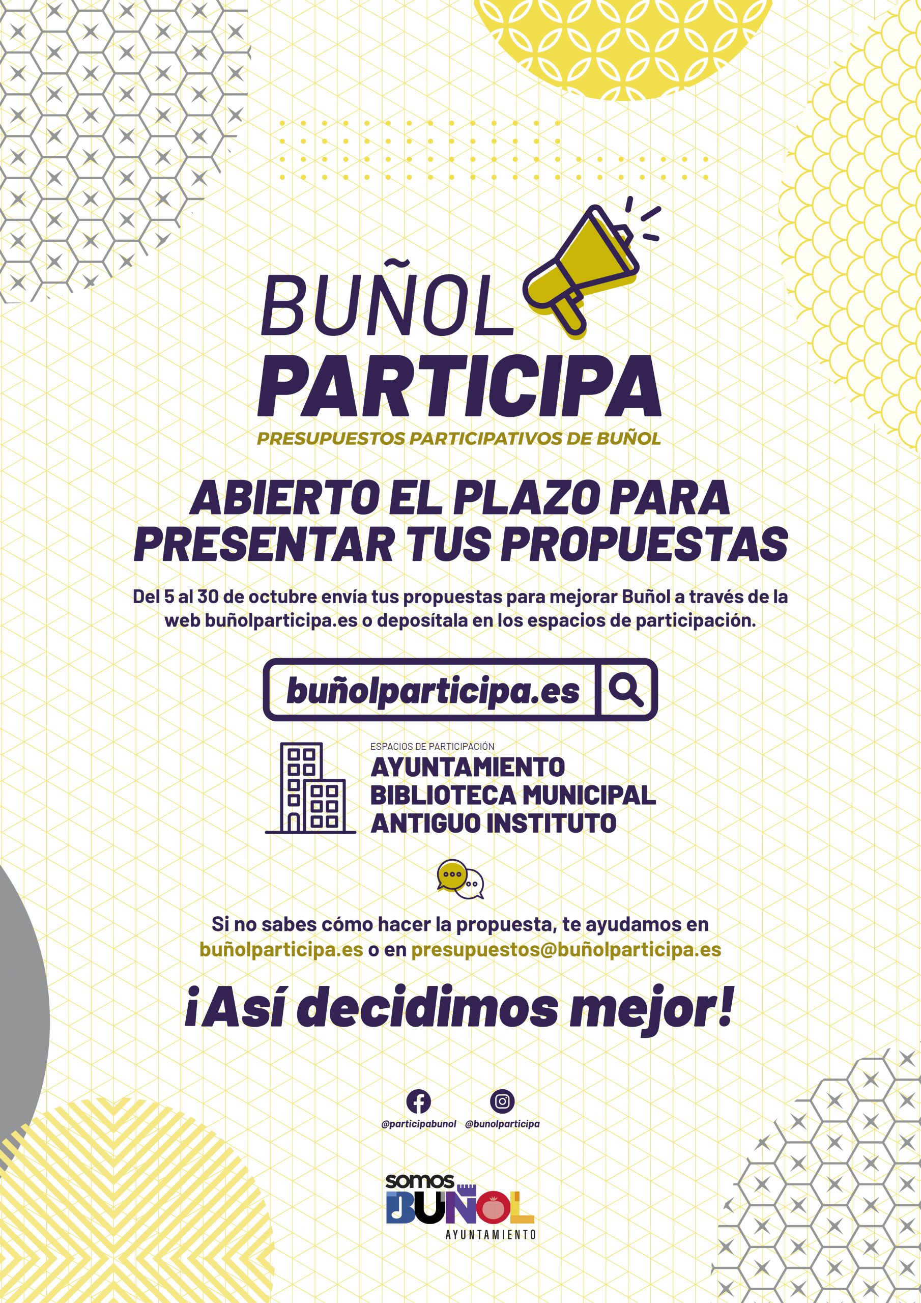 Redacción.- La 3ª Edición de los presupuestos participativos es una iniciativa de la Concejalía de Participación del Ayuntamiento de Buñol, que tiene como objetivo fomentar el desarrollo de una cultura participativa y contribuir a la normalización de la implicación de la ciudadanía en el proceso de toma de decisiones sobre políticas públicas. Se invita a la ciudadanía de Buñol a proponer aquellas actuaciones que consideren prioritarias para mejorar los servicios municipales, y conseguir que su municipio avance hacia un desarrollo sostenible; así como a votar las propuestas que los servicios técnicos municipales hayan seleccionado de entre todas las presentadas, por ser consideradas viables.