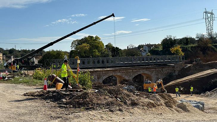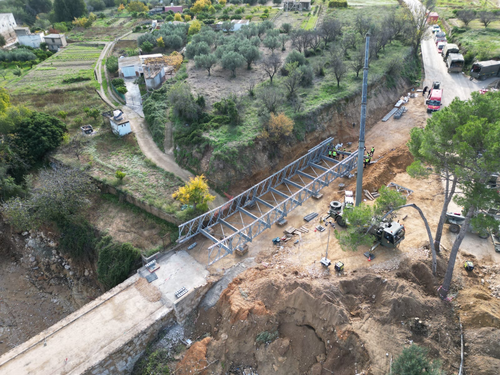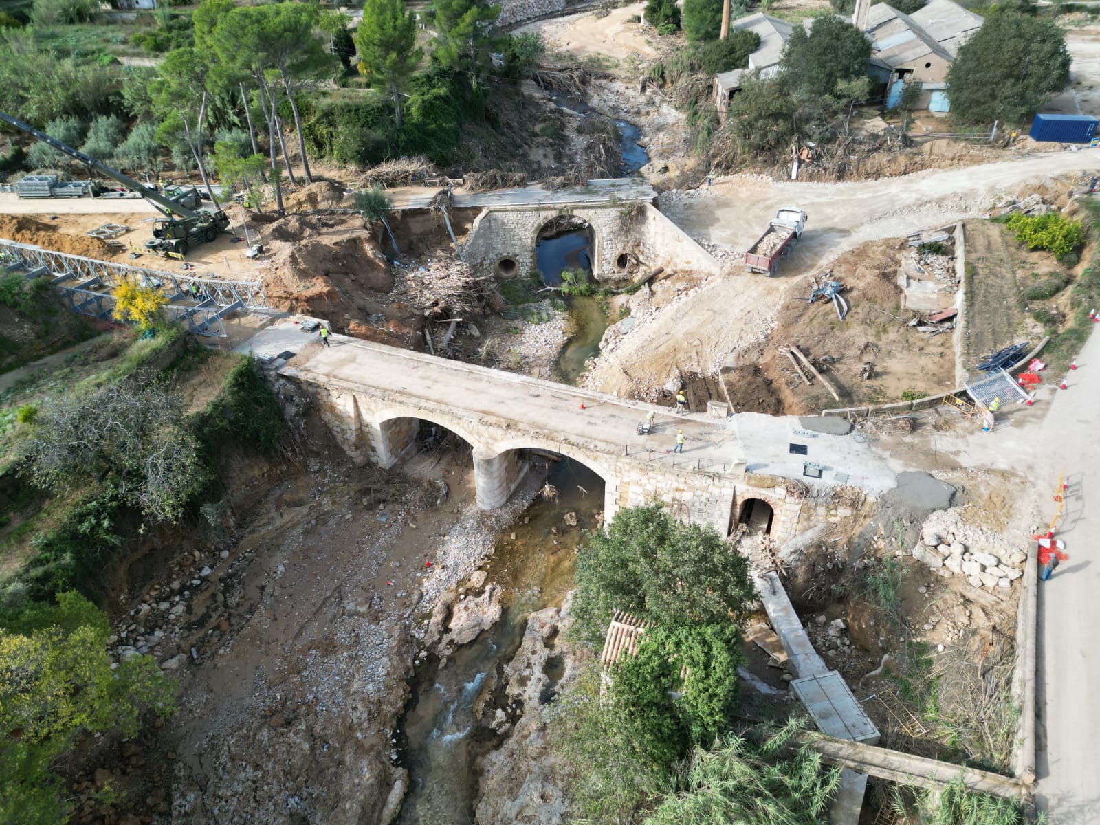 El puente provisional de la CV-425 que une los pueblos Macastre, Alborache, Yátova, Dos Aguas y Millares con Buñol está ultimándose por la Unidad Militar de Emergencias (UME). En unos días la Diputación terminará de acondicionar la zona con el fin de que los vecinos puedan volver a estar conectados.