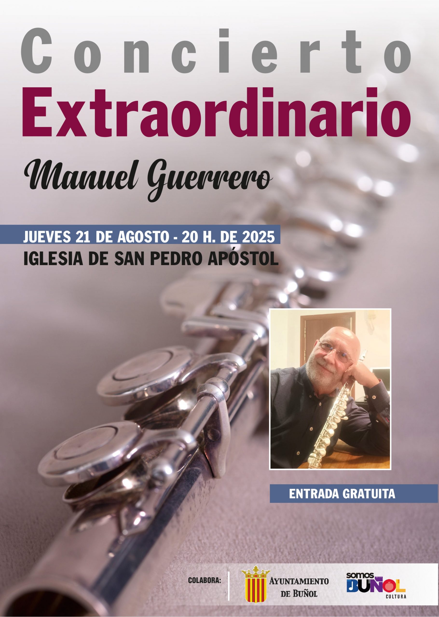 Redacción.- El próximo jueves 21 de agosto, a las 20:00 horas, la Parroquia de San Pedro Apóstol de Buñol acogerá un concierto extraordinario protagonizado por el flautista buñolense Manuel Guerrero Ruiz.