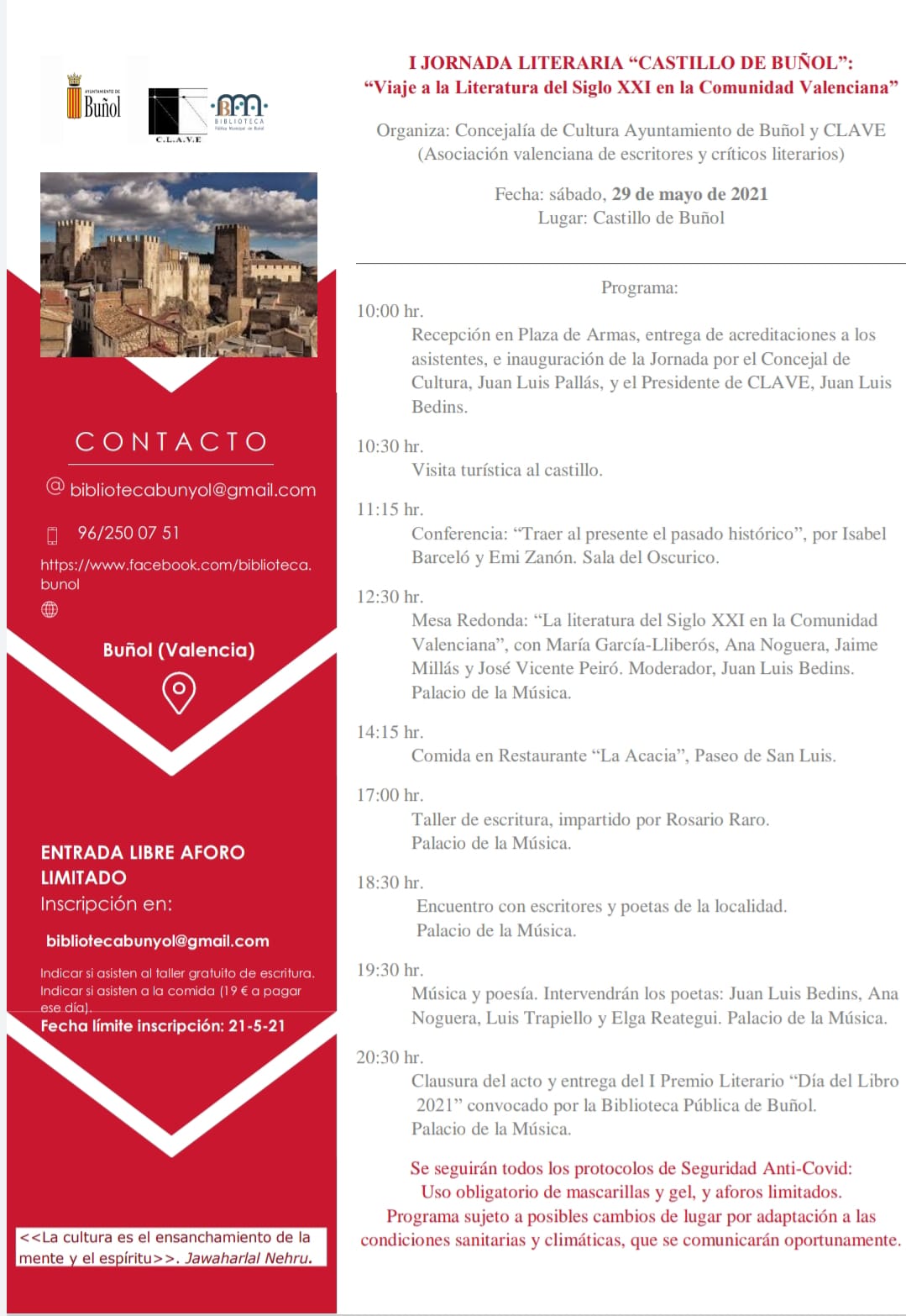 Todos los que deseen asistir pueden inscribirse hasta el 21 de mayo llamando a la biblioteca, 96 250 07 51, por mail a bibliotecabunyol@gmail.com o a través del facebook de la biblioteca. El aforo está limitado. Hay que indicar si se asiste al taller gratuito de escritura y/o a la comida, a una precio de 19€ a pagar ese día.