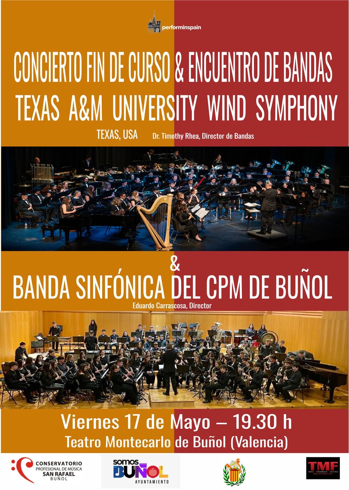Redacción.- Este próximo viernes 17 de mayo a las 19.30h. en el Teatro Montecarlo de Buñol, va a tener lugar un magnífico concierto a cargo de las Bandas Sinfónicas de la Universidad de Texas (TAMU Wind Simphony), y del Conservatorio Profesional de Música de Buñol. Este concierto sirve ya como acto final de curso para la Banda Sinfónica del Conservatorio de Música. Todo ello dentro de la gira española que está realizando el conjunto de viento de Texas y que le va a llevar a actuar el viernes 17 en Buñol, el sábado 18 en Castellón, y el domingo 19 en Granada.